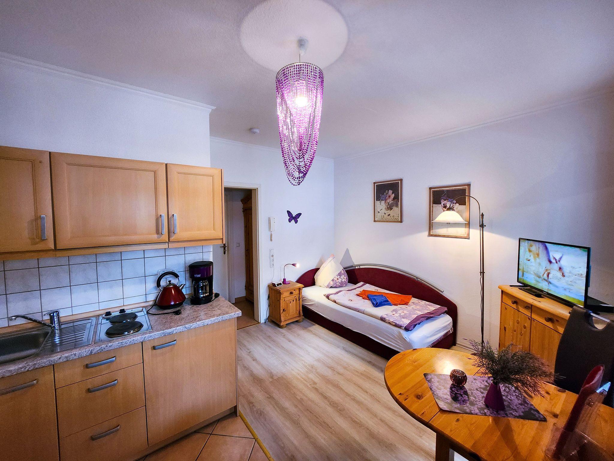 Das 1 Raum Appartement ist ca. 25 qm groß und befindet sich im 2. Obergeschoß. Zur Wohnung gehört ein Balkon. Es steht Ihnen ein Wohnraum mit Küche und ein Badezimmer mit Dusche und Toilette zur Verfügung. Im Wohnraum steht ein Einzelbett. Für ein Kleinkind bis 2 Jahre stellen wir Ihnen gerne ein Reisebettchen in die Wohnung (einmalig 15 ).