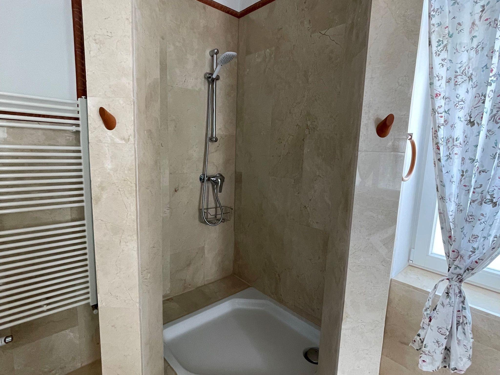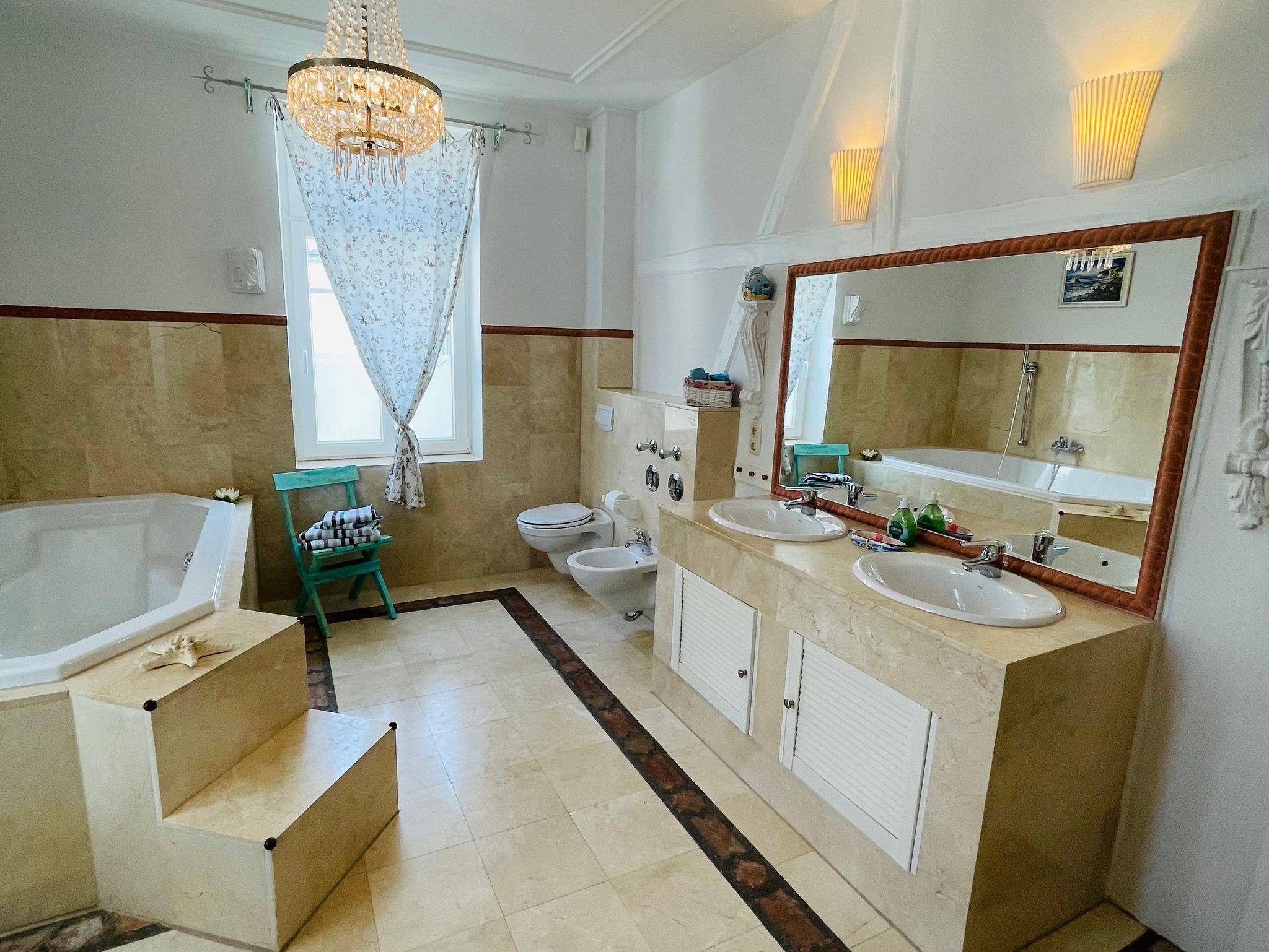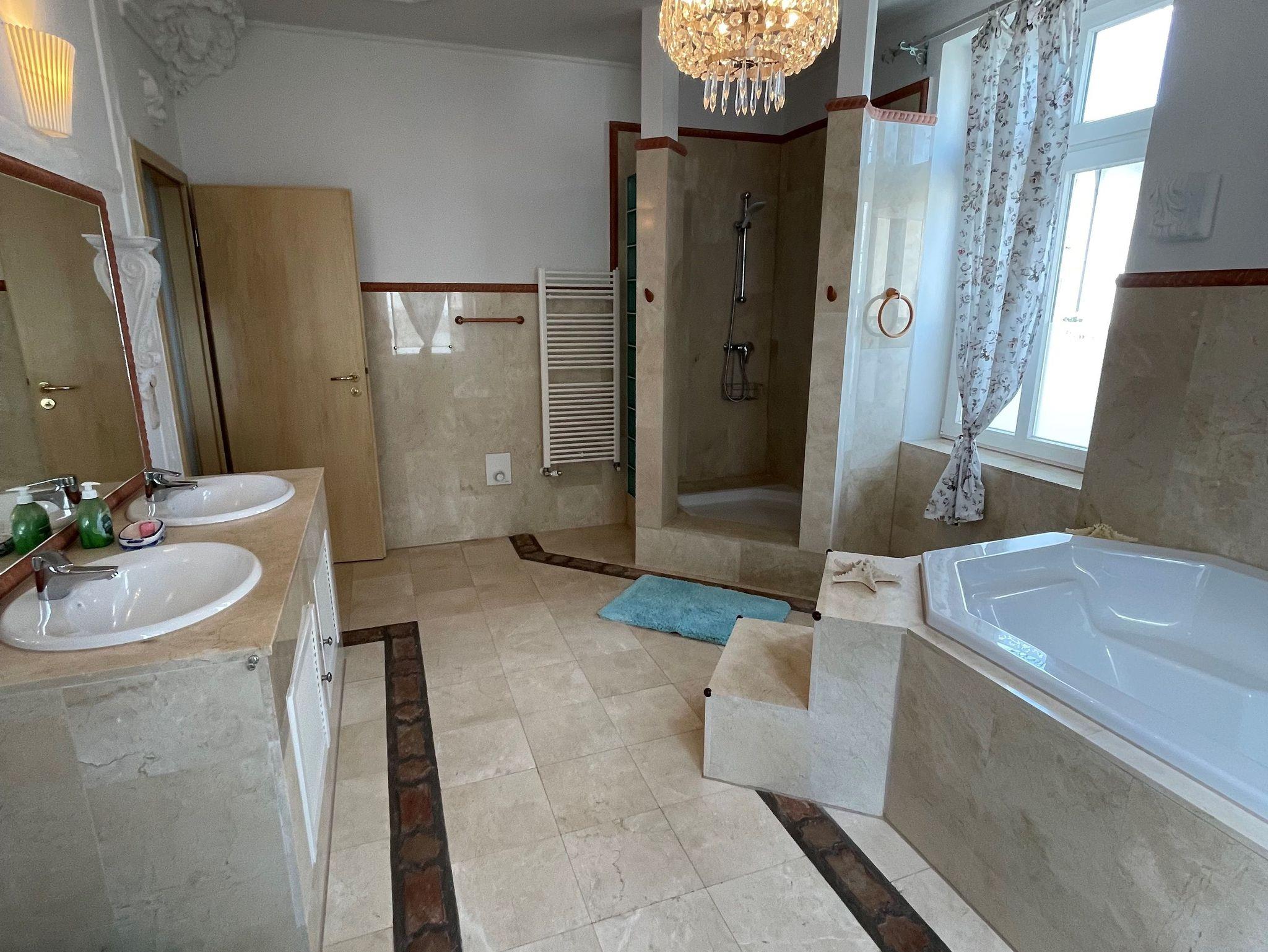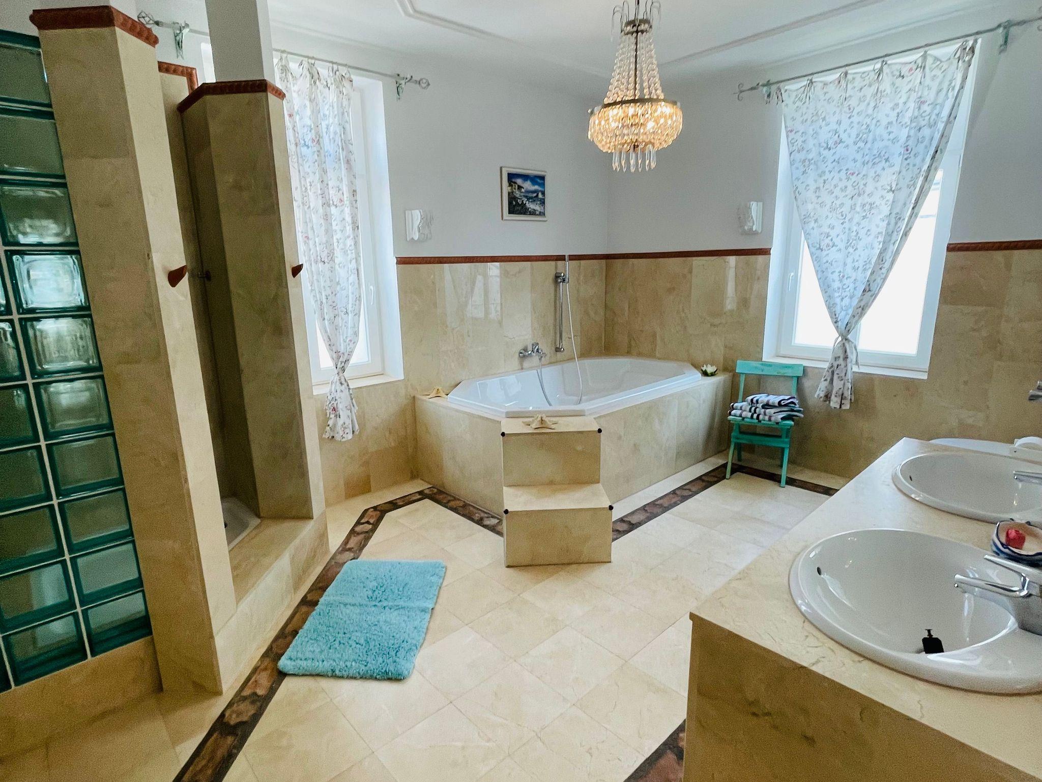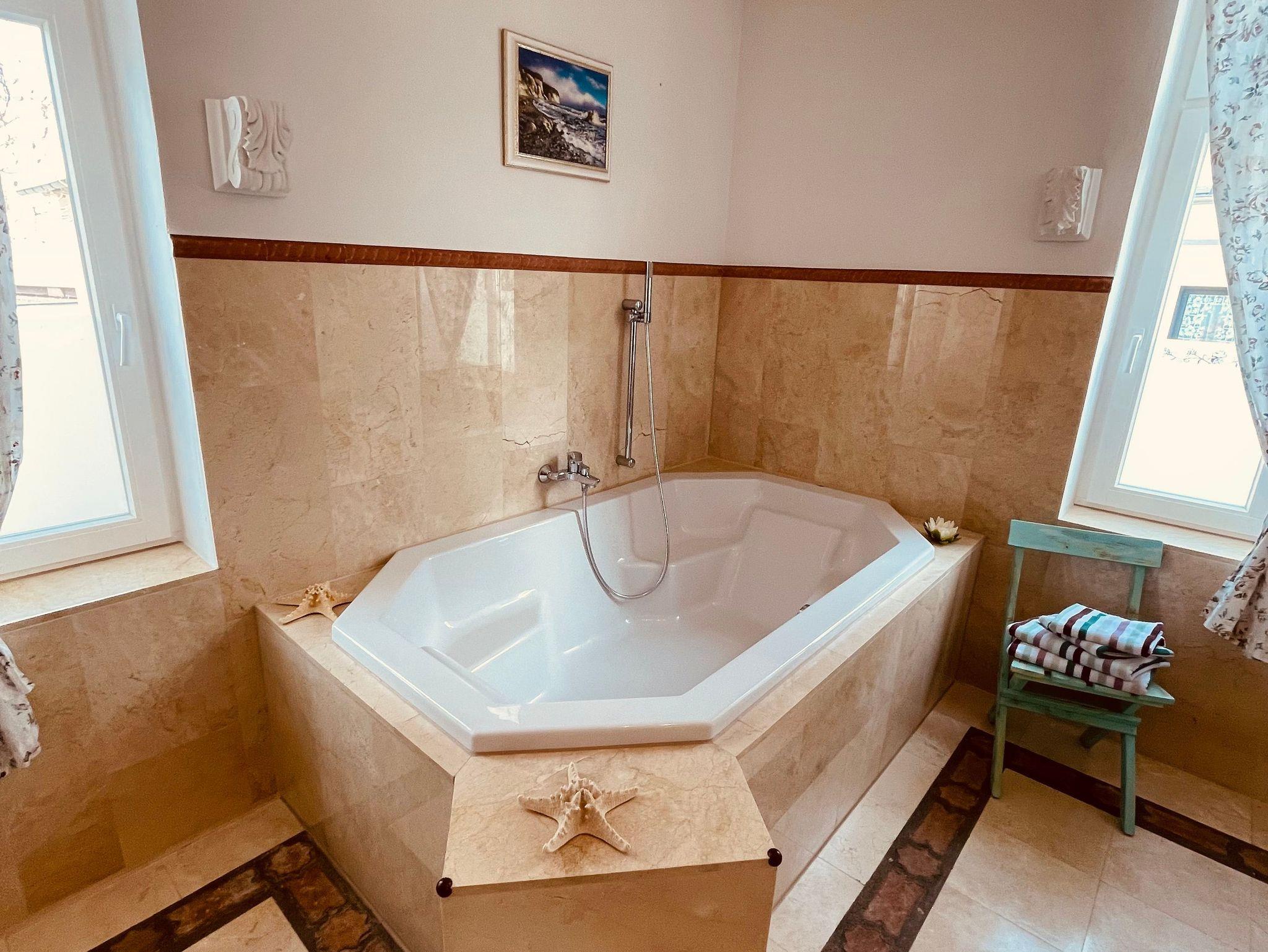 Marmor Duschbad mit Fußbodenheizung, großer Badewanne, Fenstern, BD und WC.
