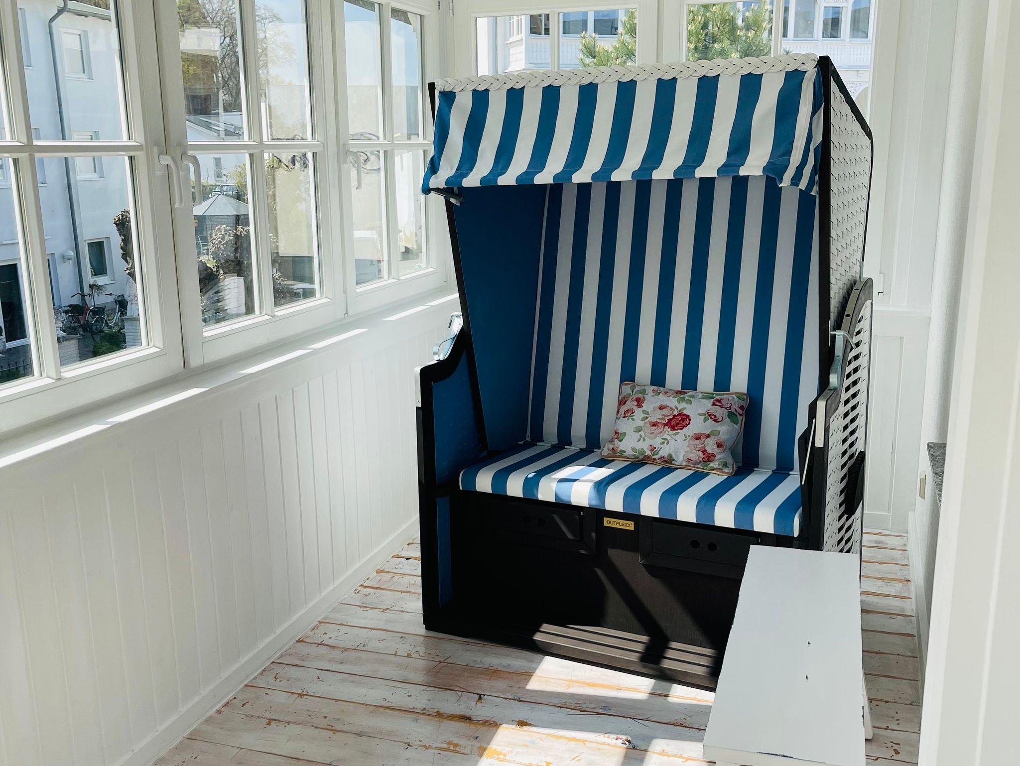 Liebevoll eingerichtete Ferienwohnung im 1.Obergeschoss, mit zwei Wintergärten, Sofa und Strandkorb in südlicher Richtung.