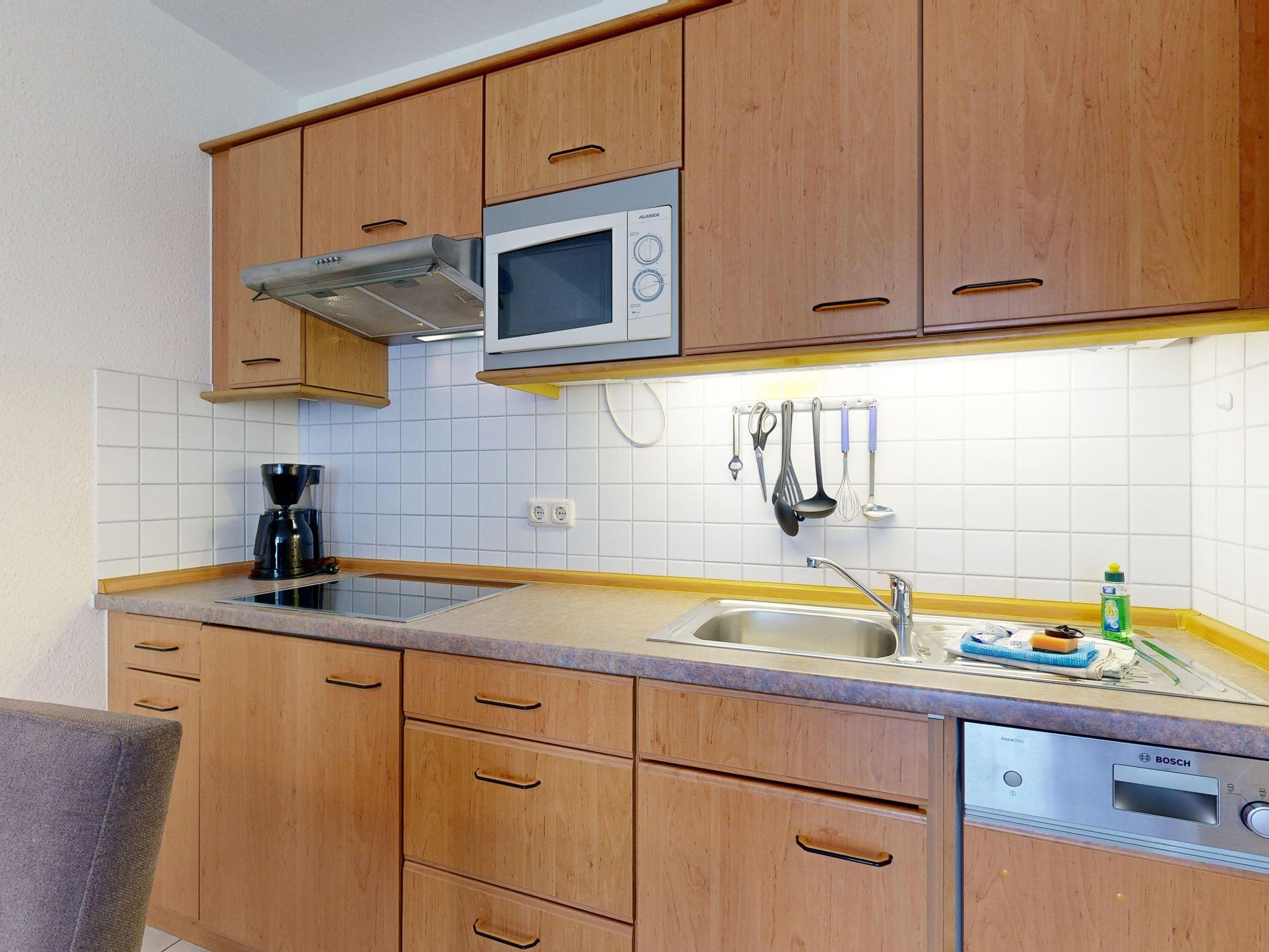 • Küchenzeile mit Spülmaschine, Ceranfeld, Mikrowelle, Kaffeemaschine, Toaster und Kühlschrank mit Gefrierfach