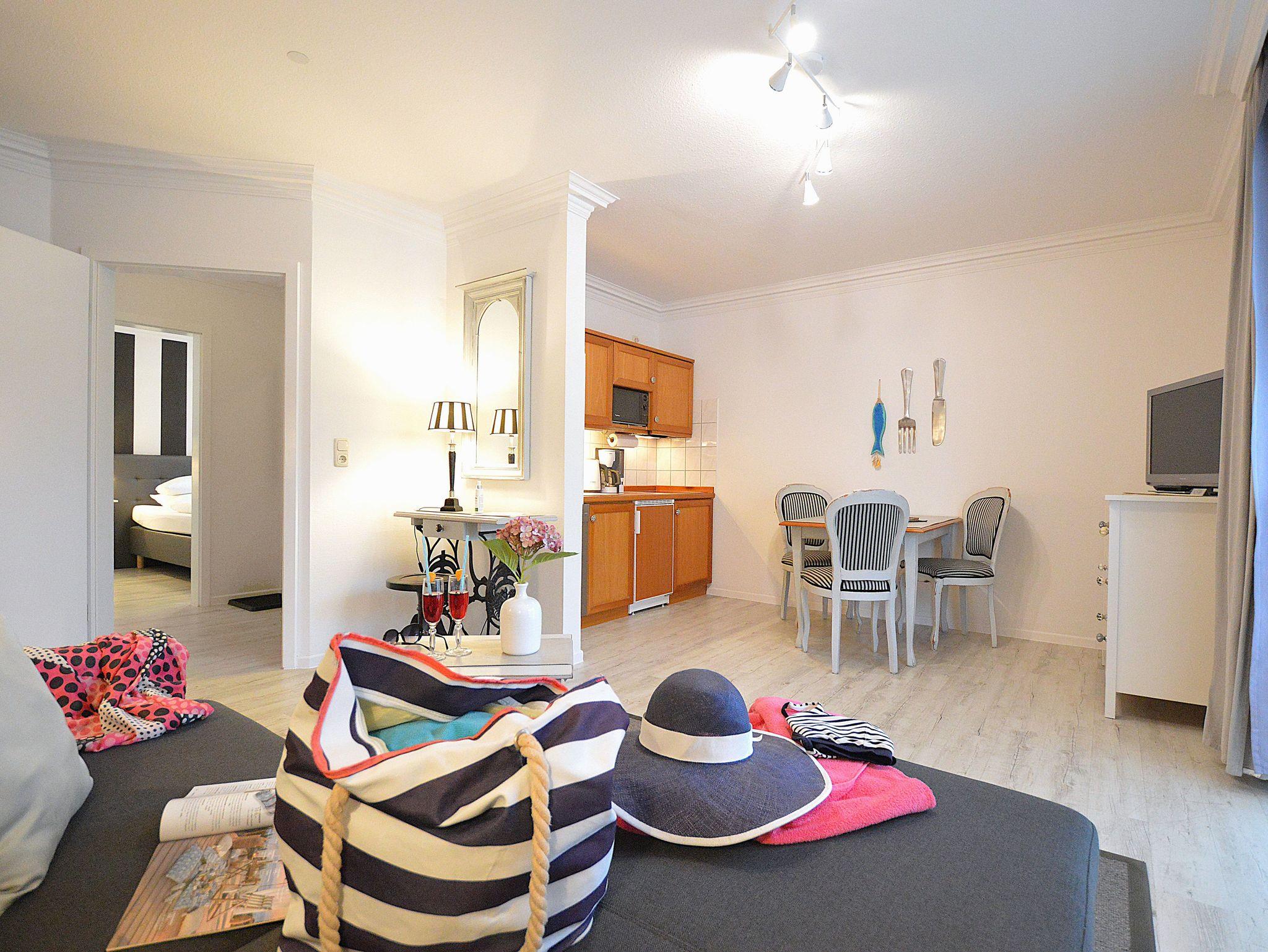 Das Apartment im 1. Obergeschoss mit 45m² befindet sich in der Apartment-Villa Steinfurth, welche direkt am Meer liegt und bietet Platz für 2 Personen. Vom Wohnraum aus erreicht man einen möblierten Balkon in Südostausrichtung. Der helle, große Wohnbereich mit Küchenzeile, Essplatz und TV ist gemütlich und modern möbliert. Die Küchenzeile ist ausgestattet mit 4-Platten-Cerankochfeld, Mikrowelle, Geschirrspüler, Kühlschrank, Kaffeemaschine, Wasserkocher und Toaster. Das Schlafzimmer verfügt über ein Doppellbett mit einer Liegefläche von 180 x 200 cm. Vom Schlafzimmerfenster aus kann man das Meer sehen. Ein Duschbad mit WC und Haartrockner ist ebenfalls vorhanden. Ein Parkplatz befindet sich direkt am Haus.