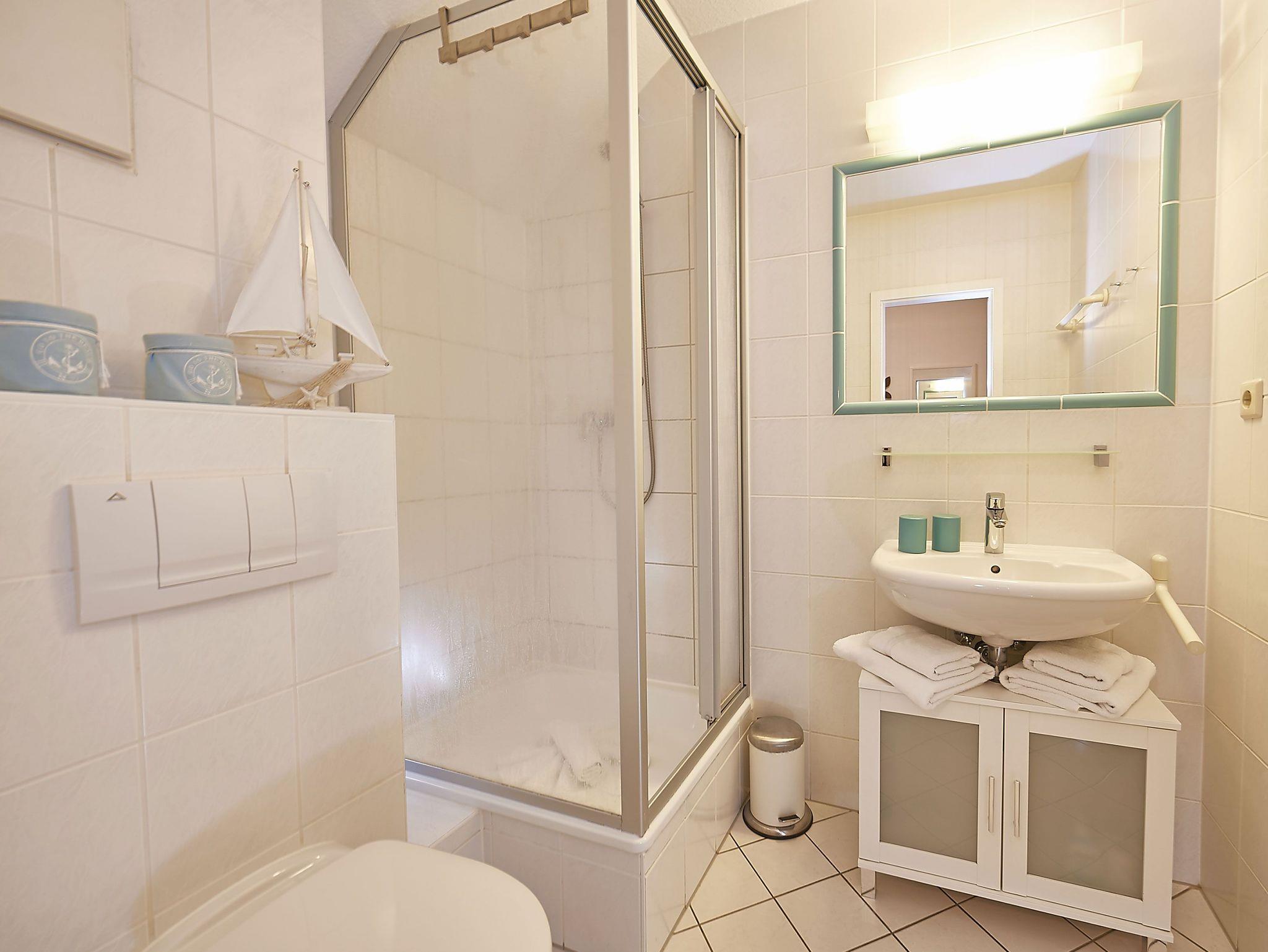 Das Badezimmer ist mit Dusche/WC, Waschbecken, Spiegel und einem Haartrockner ausgestattet.