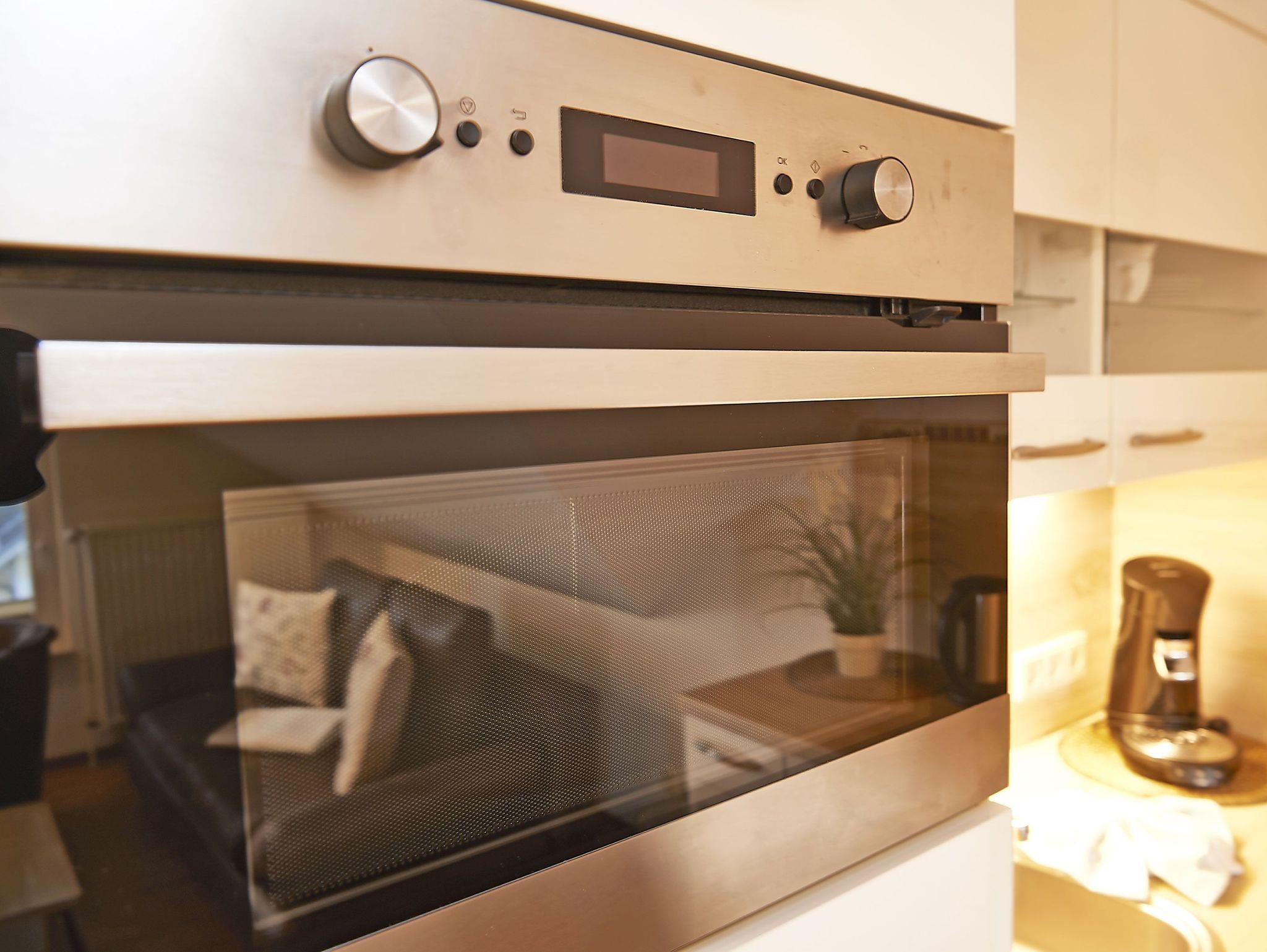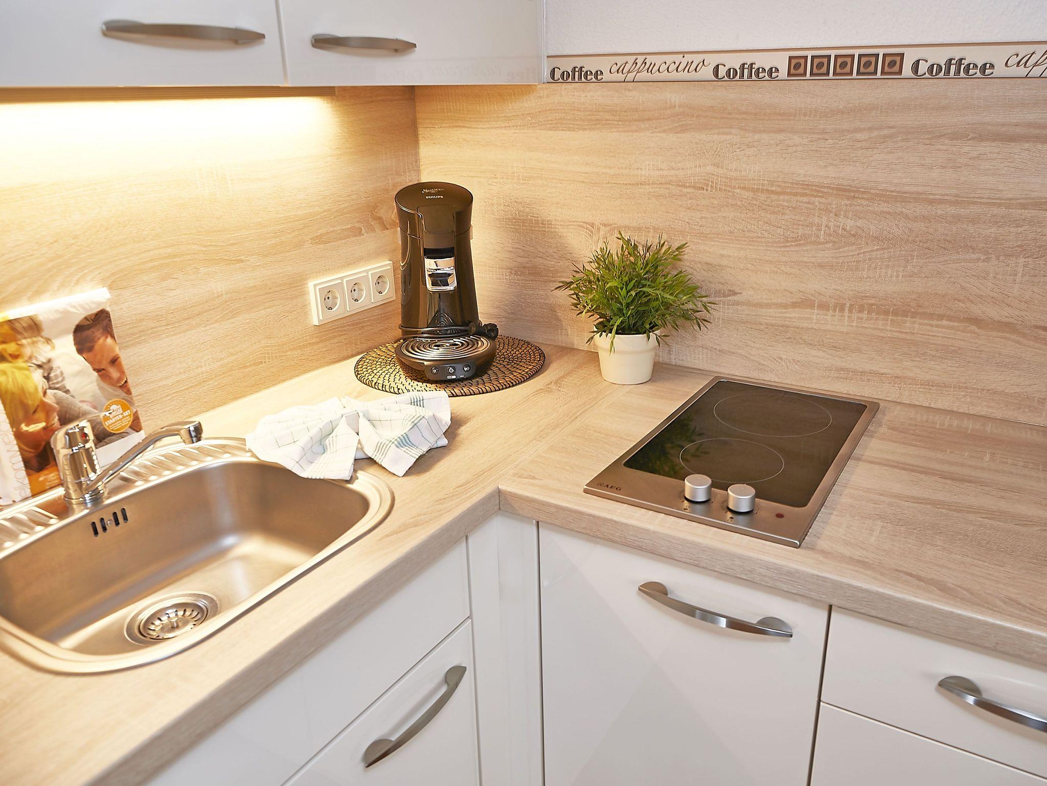 Die Küche verfügt über einen Kühlschrank inkl. Gefrierfach, einen Heißluft-Backofen mit Mikrowelle, ein 2-Platten-Cerankochfeld, eine Geschirrspülmaschine sowie einen Wasserkocher und zwei Kaffeemaschinen für Filterkaffee und Kaffeepads.