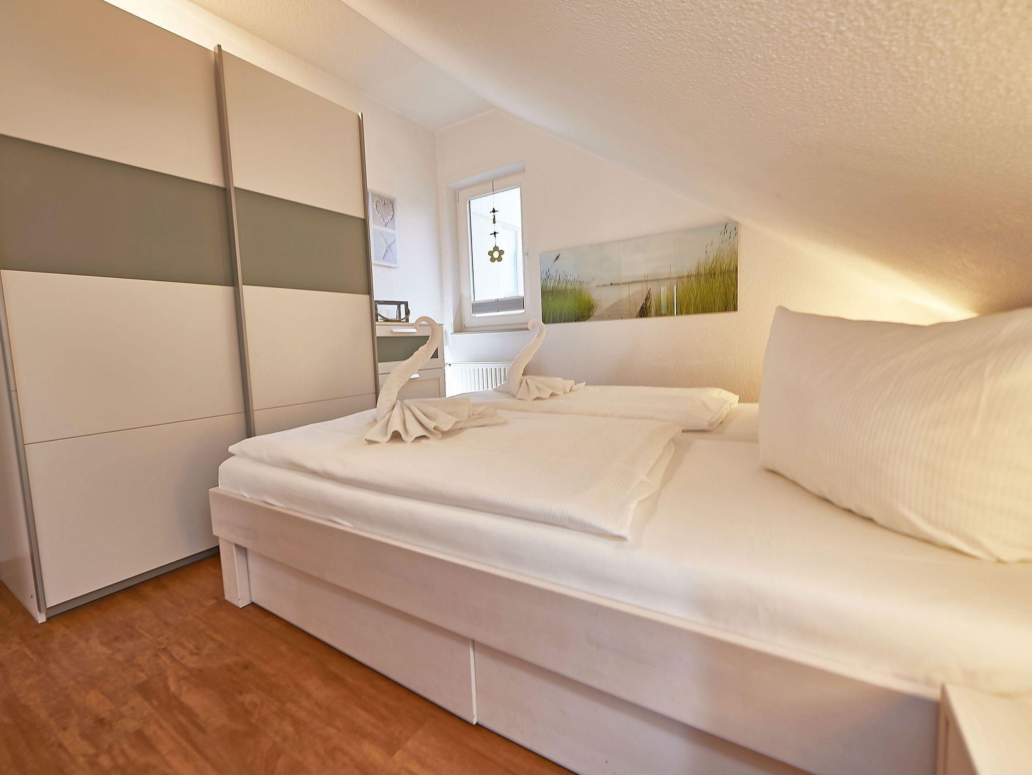 Das separate Schlafzimmer bietet genügend Platz für ein bequemes Doppelbett (180 x 200 cm) und ein Kinderreisebett (in der Wohnung vorhanden). Der Clou: Bei gutem Wetter hat man aus dem Schlafzimmerfenster einen wunderbaren Blick auf die Ostsee, die Binzer Bucht sowie die Kreidefelsen das Wahrzeichen der Insel Rügen.