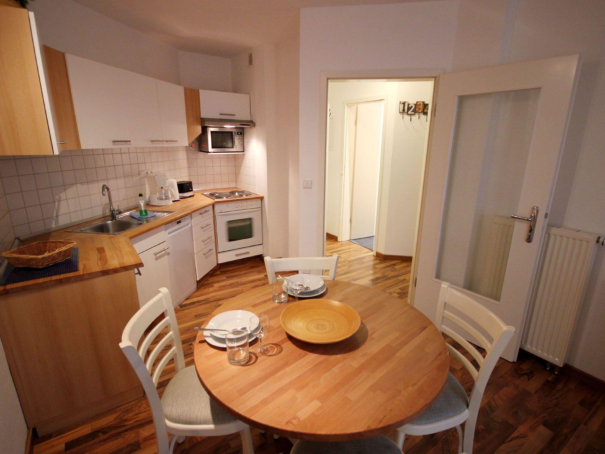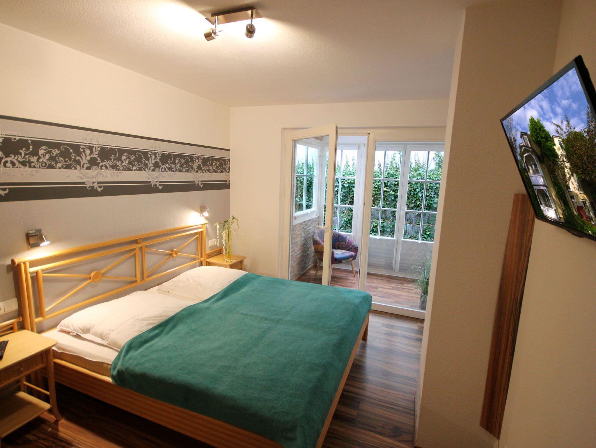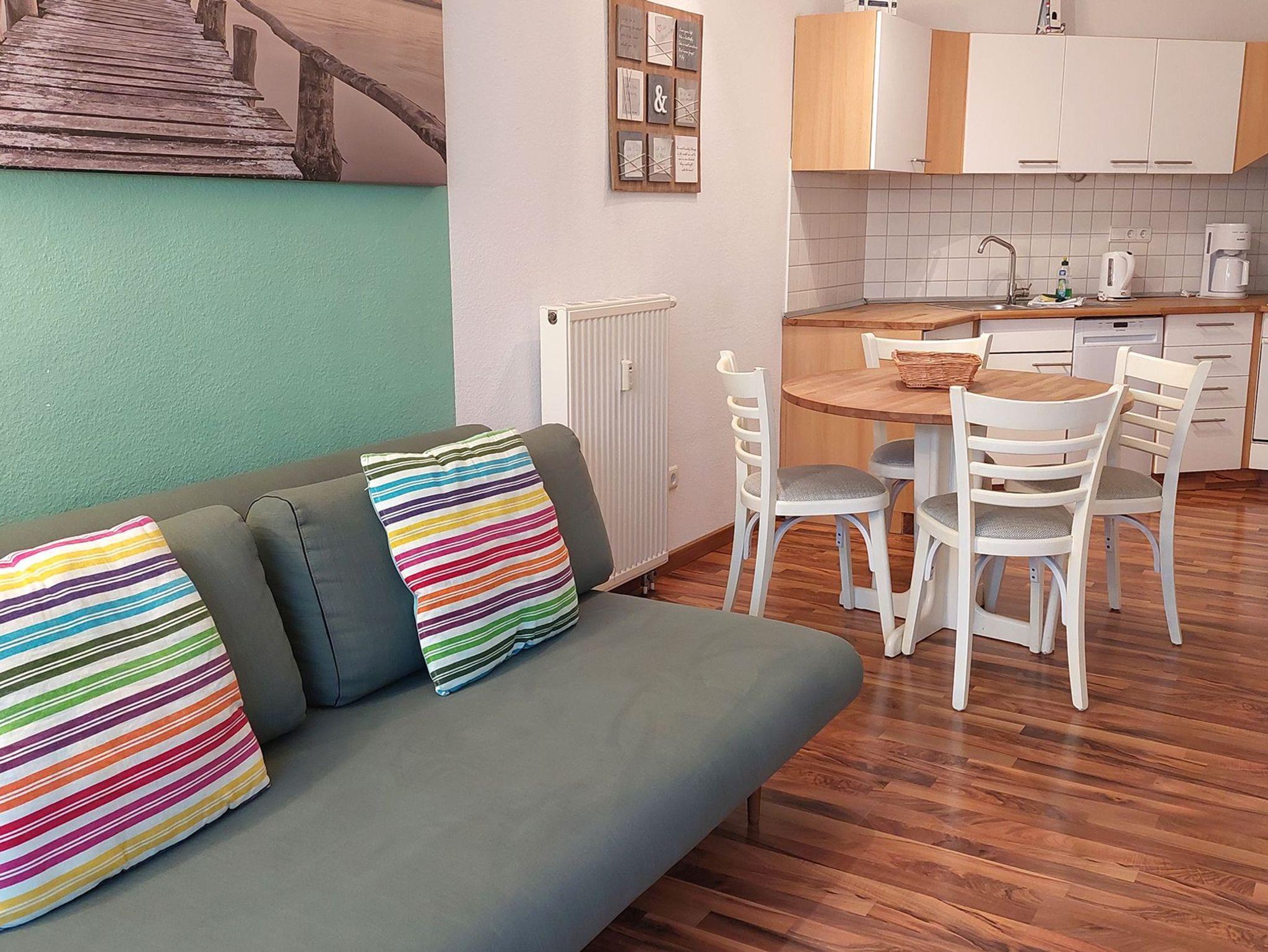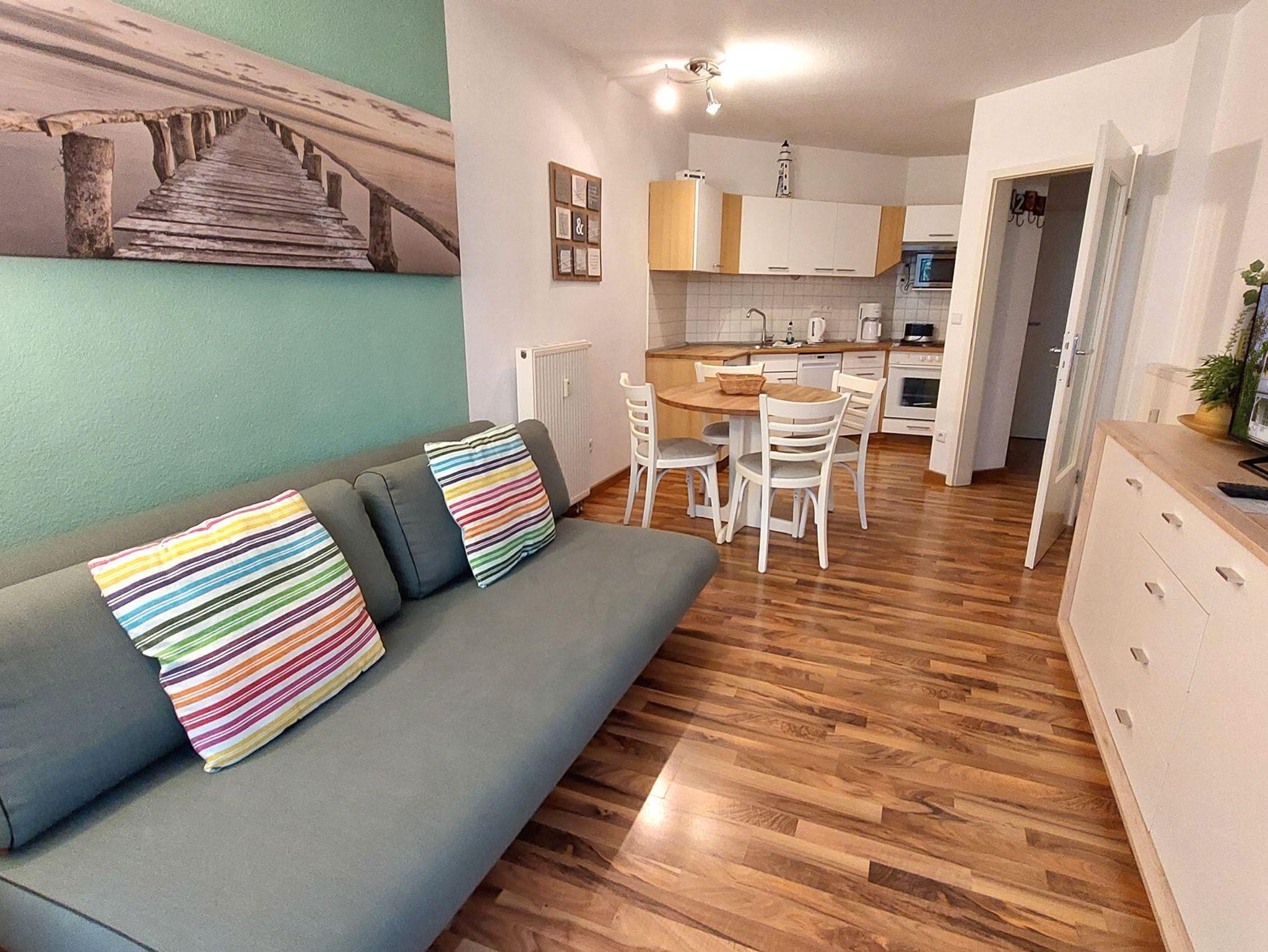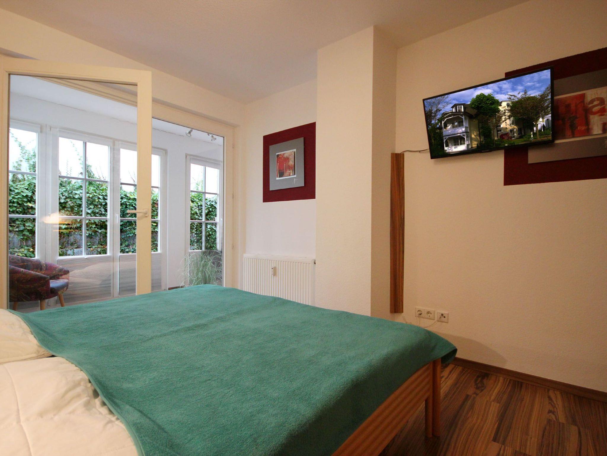 Ihre Ferienwohnung 12RB2 befindet sich im Erdgeschoss der Villa und ist für bis zu 4 Personen ausgestattet. Sie hat eine Größe von ca. 47 m² und verfügt über eine kleine Terrasse nach Osten. Die Wohnung hat neben dem Wohnraum mit integrierter Kochzeile einen separaten Schlafraum, Flur und ein helles Badezimmer mit Waschtisch, Dusche und WC. Im Schlafraum befinden sich ein Doppelbett sowie ein Flachbild-TV. Im Wohnraum finden Sie neben der Sitzecke mit Schlaffunktion einen separaten Essplatz, TV, Musikanlage mit CD-Player und WLAN. Die Küchenzeile ist mit Geschirrspülmaschine, Backofen, Kühlschrank, Mikrowelle, Kaffeemaschine, Toaster, Wasserkocher und diversen Kleingeräten komplett ausgestattet. Vom Wohn- und Schlafbereich gelangen zu einem gemütlichen Wintergarten mit Zugang zur Terrasse. Ein wohnungseigener Stellplatz steht für Sie direkt in der Tiefgarage zur Verfügung. Ebenso befindet sich ein abschließbarer Fahrradraum im Keller des Hauses.