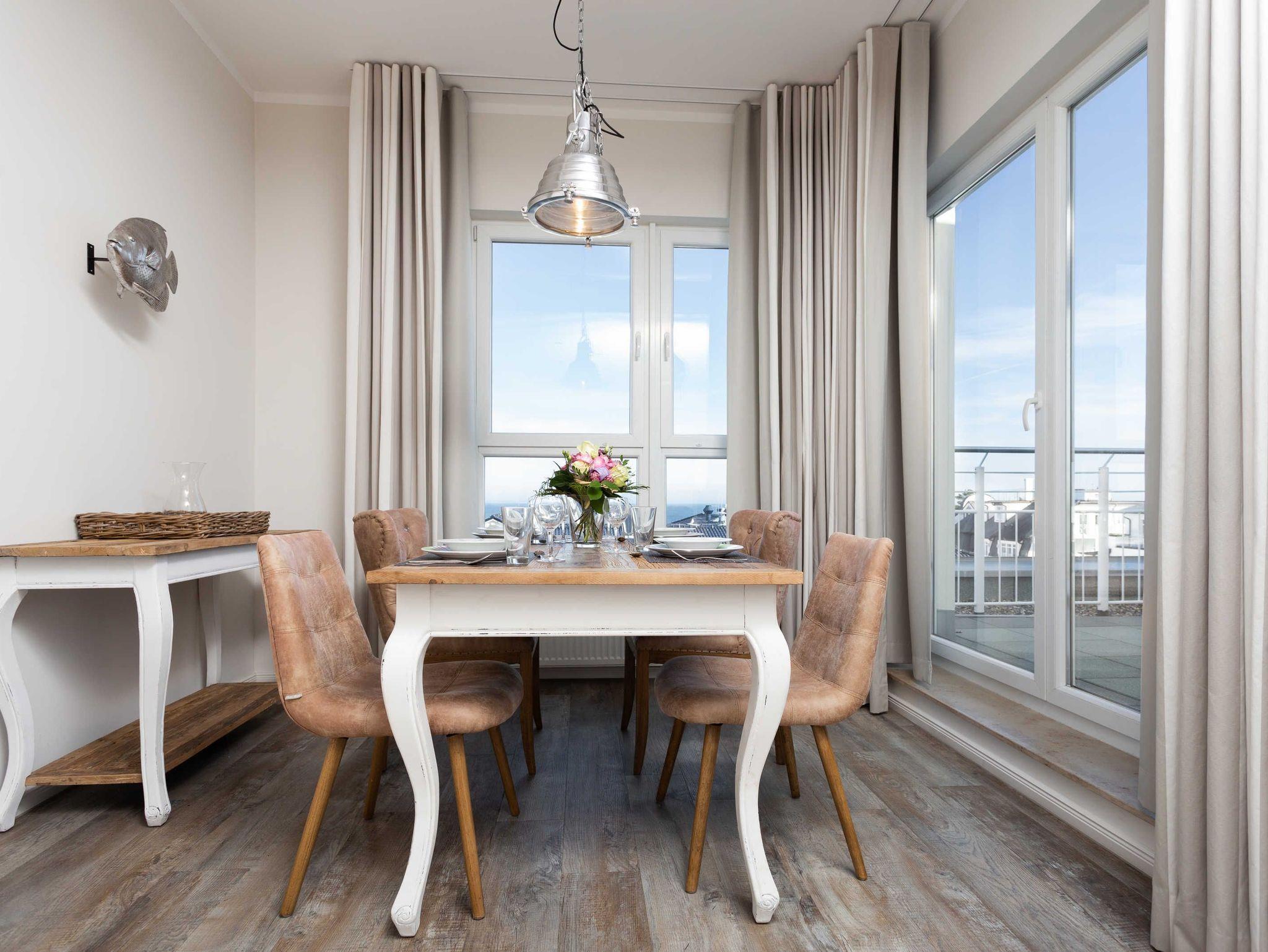 Im Jahr 2017 komplett neu renovierte und neu möblierte, exclusive Ferienwohnung mit großer Sonnenterrasse und Ostseeblick für 2-4 Personen; Komfort-Ausstattung der Wohnung im 4. OG mit 1 Schlafzimmer (2 Zimmer / 71 m²)