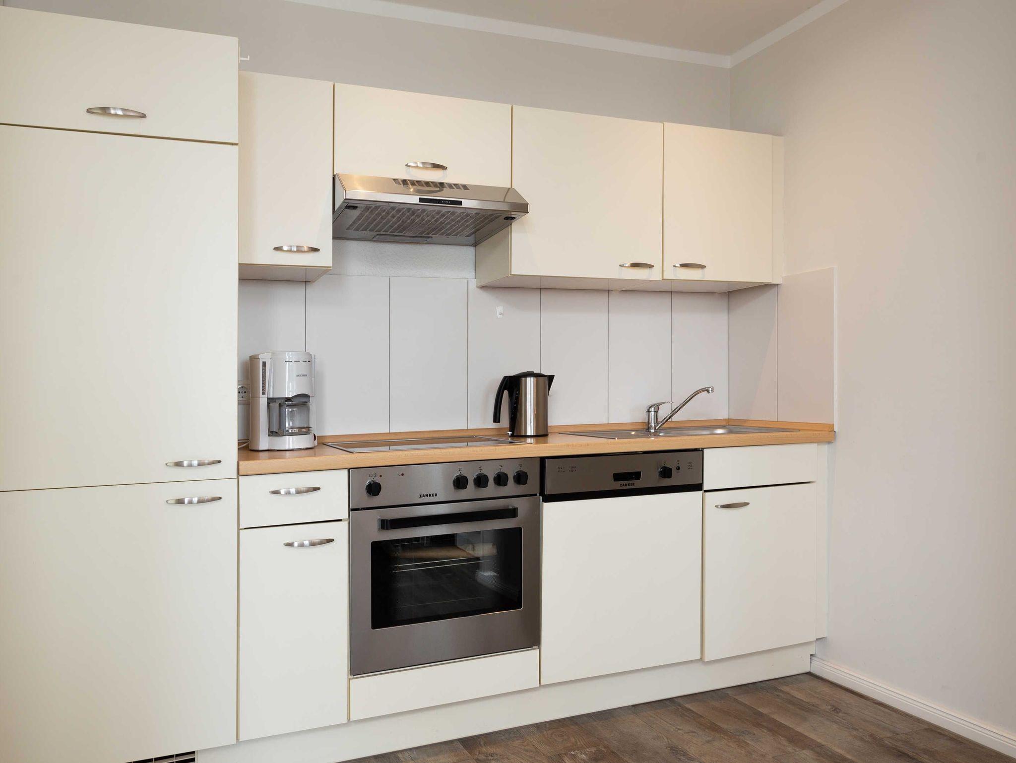 Küche mit Ceranfeld, Kühlschrank mit Gefrierfach, Backofen, Spülmaschine, Toaster, Wasserkocher, Kaffeemaschine