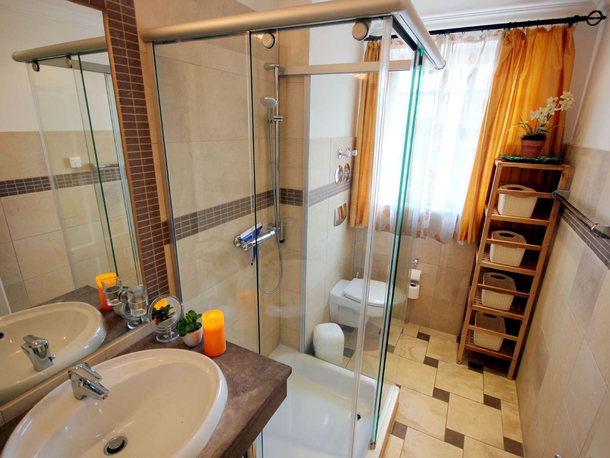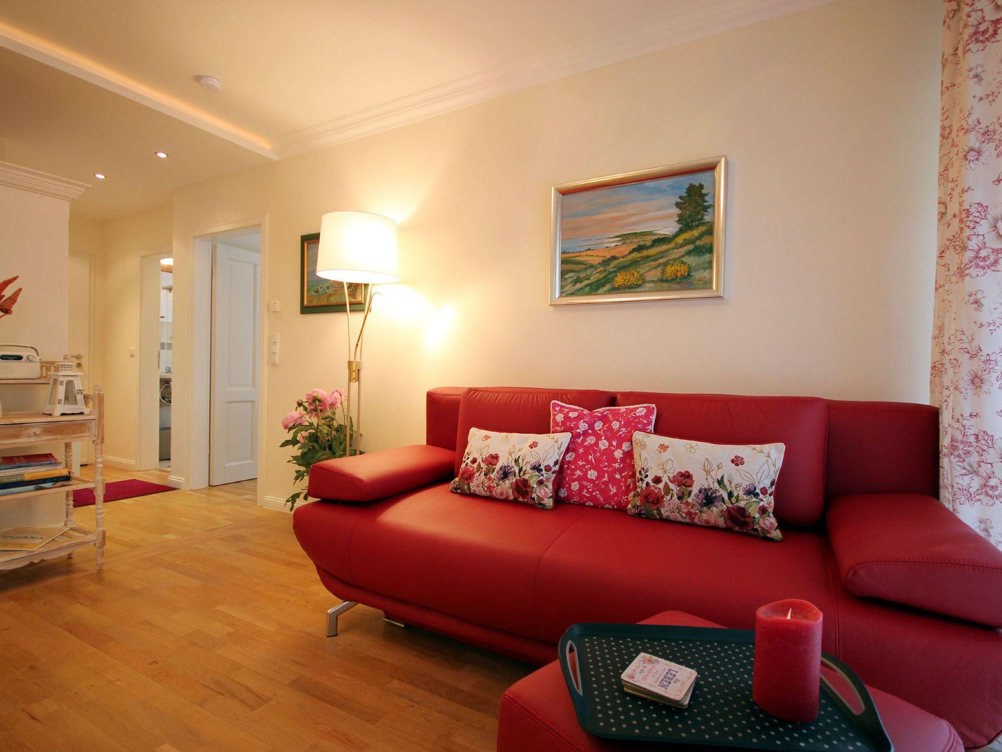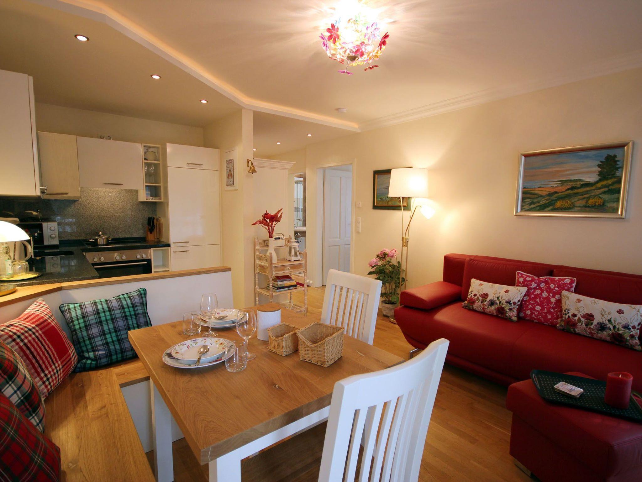 Die Ferienwohnung ist aufgeteilt in einen gemütlichen Wohnraum, eine offene moderne Markeneinbauküche mit Granitarbeitsplatte, ein Schlafzimmer und ein Tageslichtbad mit Glasdusche, Waschtisch und WC.
