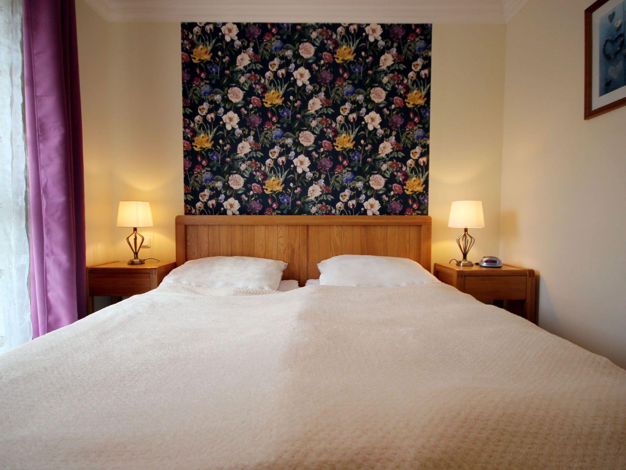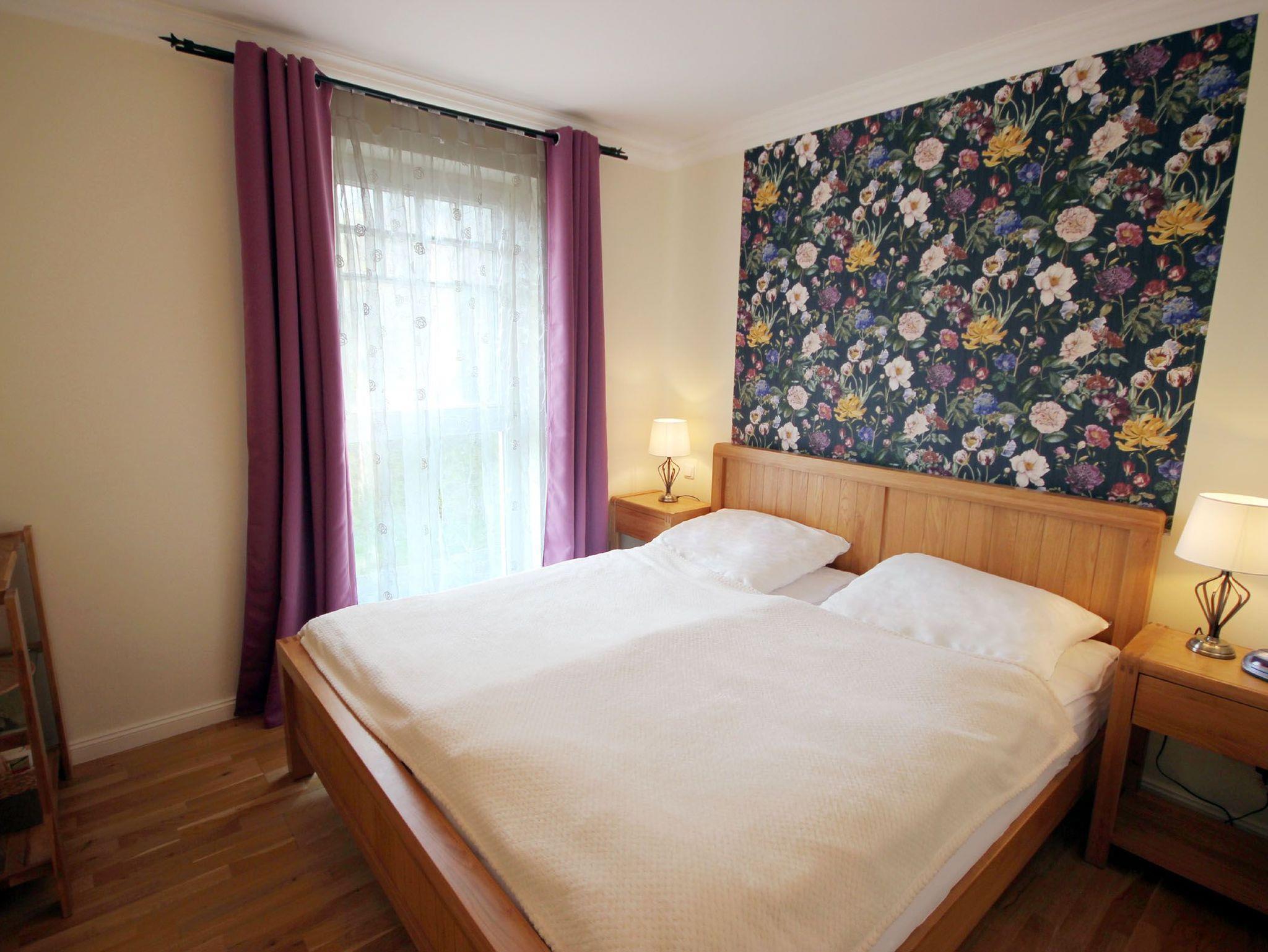 Das Schlafzimmer verfügt über ein Doppelbett mit Nachttischen sowie Verdunklungsstoffen.