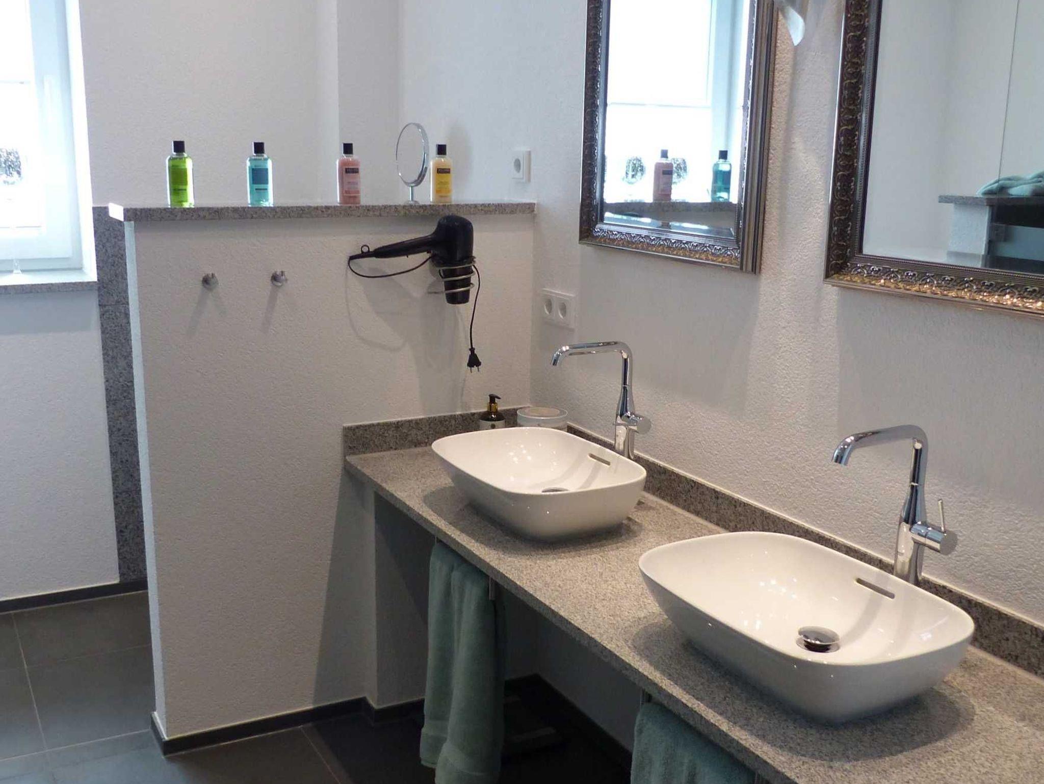 Der Tag startet und endet bekanntlich im Badezimmer, so dass hier besonderer Wert auf Eleganz und Exklusivität gelegt wurde. Diese Wohlfühloase wird Sie mit einer bodengleichen Walk-in-Dusche, einer Badewanne und einem Waschtisch aus Granit mit zwei Aufsatzwaschbecken, sowie hochwertigen Armaturen begeistern. Die Beleuchtung ist für ein romantisches Bad dimmbar. Die Wandfliesen aus Granit und Bodenfliesen aus Schieferplatten mit verbauter Fußbodenheizung spiegeln den Anspruch nach dem Besonderen wieder.