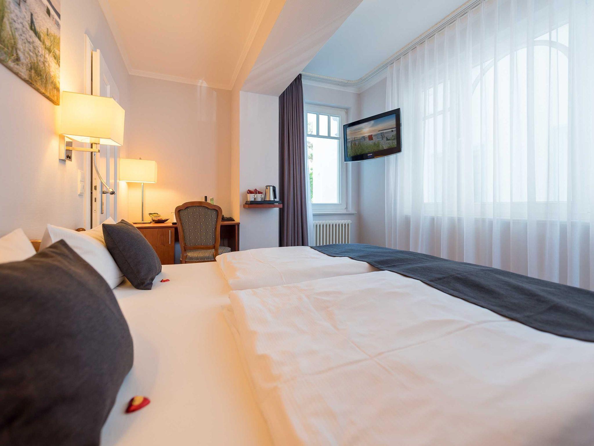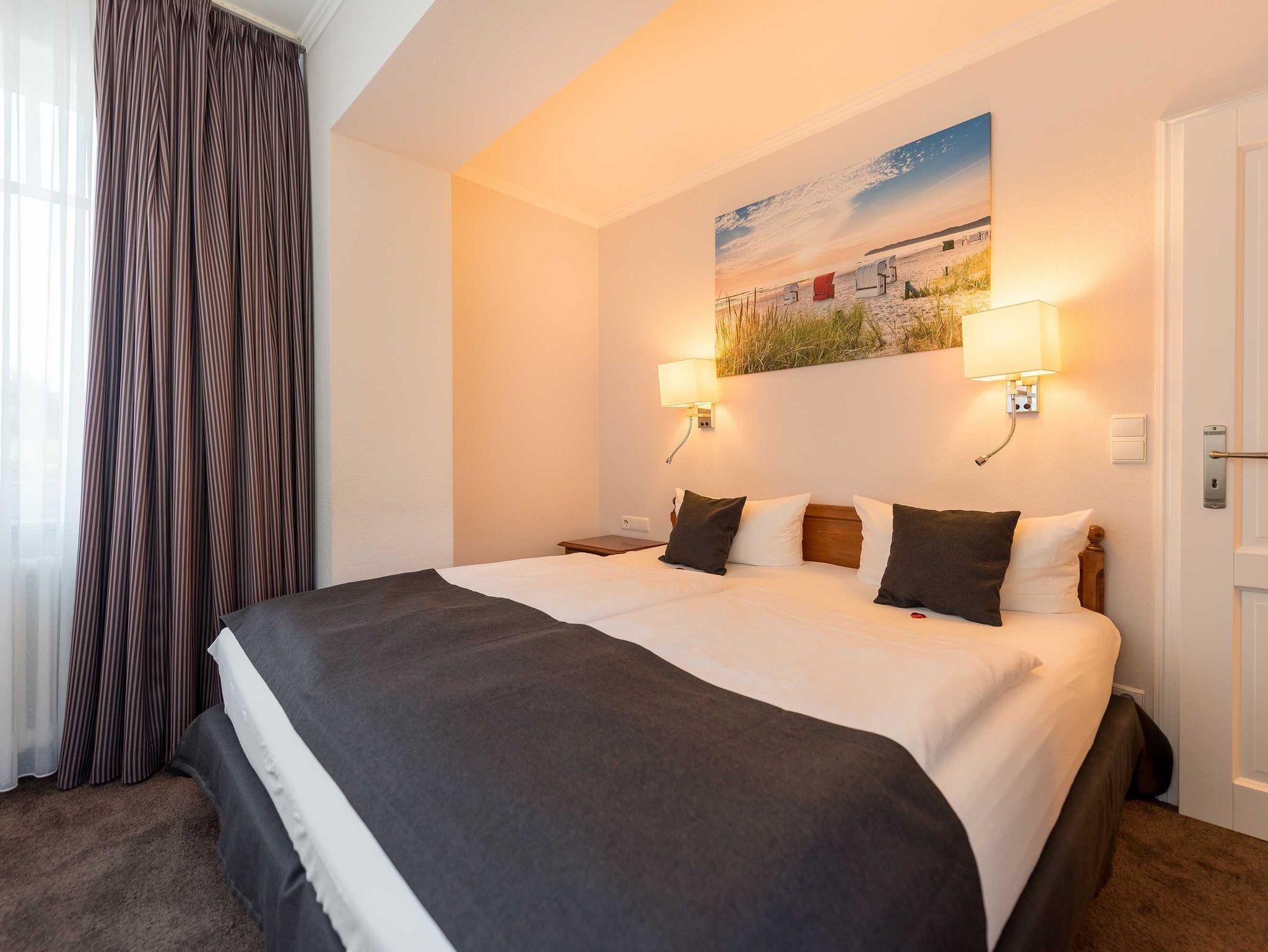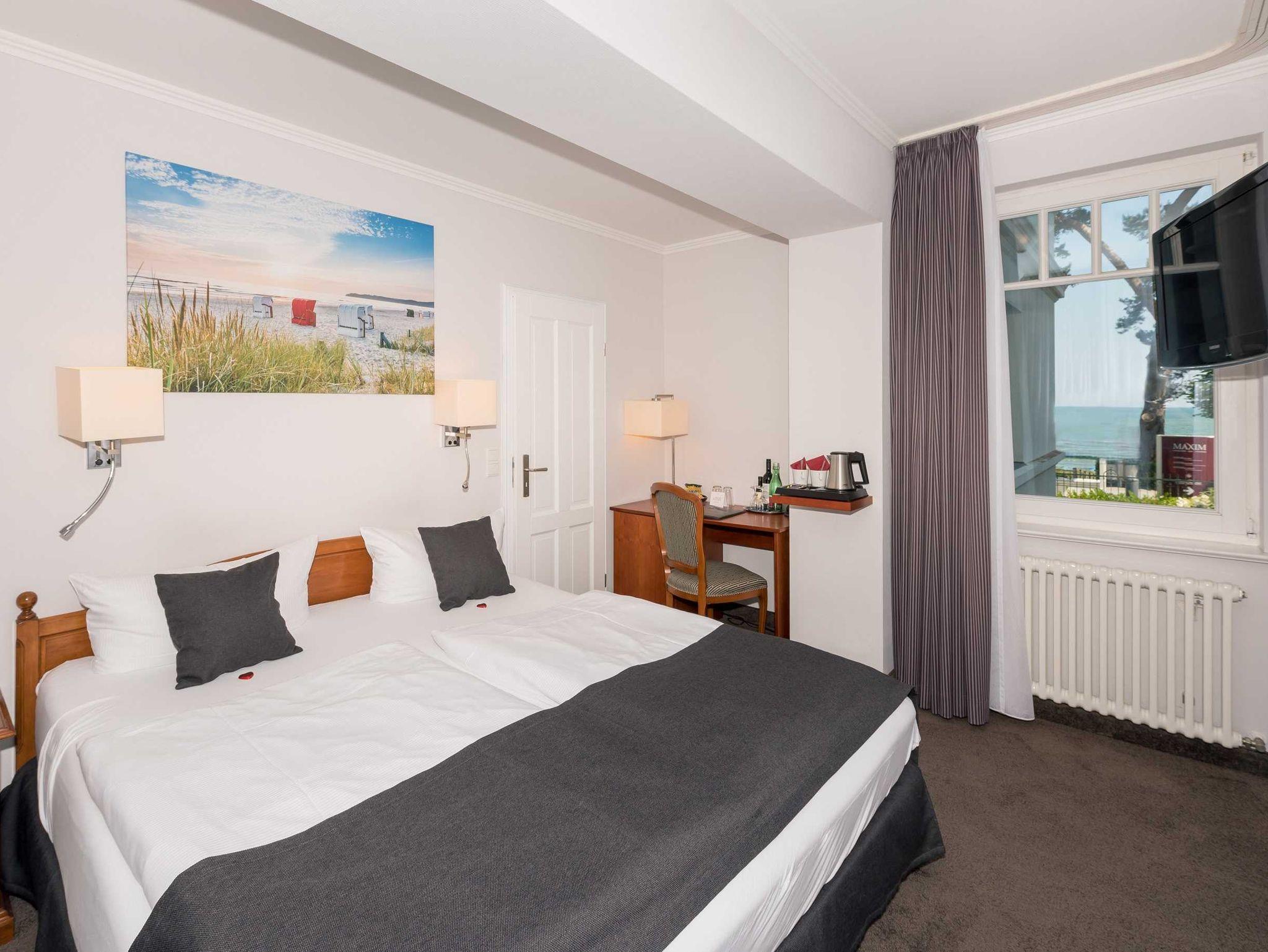 Alle unsere Zimmer sind liebevoll eingerichtet und bestechen mit einmaligem Komfort. Die modernen Bäder sind kleine Wohlfühl-Oasen mit viel Raum zur freien Entfaltung, alle Räumlichkeiten sind mit TV, Telefon, Zimmersafe und einer Minibar ausgestattet. Unsere mondänen Suiten verfügen außerdem über einen vollausgestatteten Küchenbereich sowie eine einladende Badewanne ? zum Träumen und Genießen. Besonders eindrucksvoll: Aus vielen unserer Doppelzimmer und Juniorsuiten haben Sie einen unvergesslichen Panoramablick auf die Ostsee.