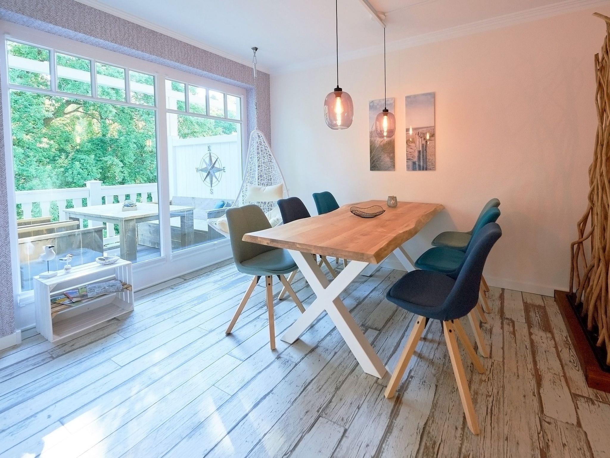 • kombiniertes Wohn-/Esszimmer mit bequemer Couchgarnitur, großem Flatscreen-TV, W-LAN, Hängesessel zum Chillen, edlem Baumkanten-Esstisch und vorgelagertem Balkon zur Morgensonne