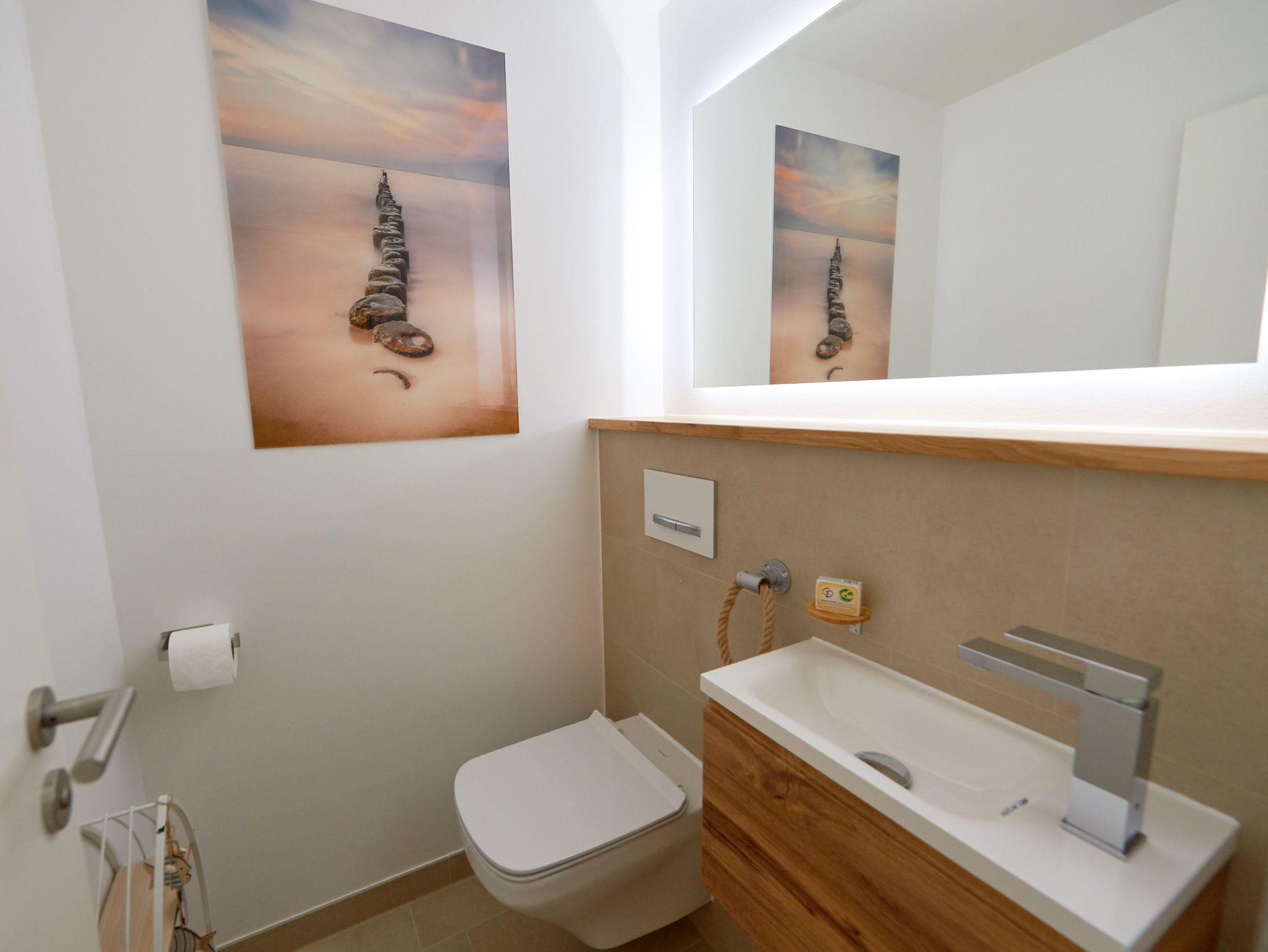 • großes Tageslicht-Bad mit bodentiefer Regenwald-Dusche, WC, Fußbodenheizung, beleuchtetem Waschtisch inkl. Kosmetikspiegel, Fön und Buetooth-Radio sowie ausreichend Haken und Ablageflächen für Ihre Utensilien