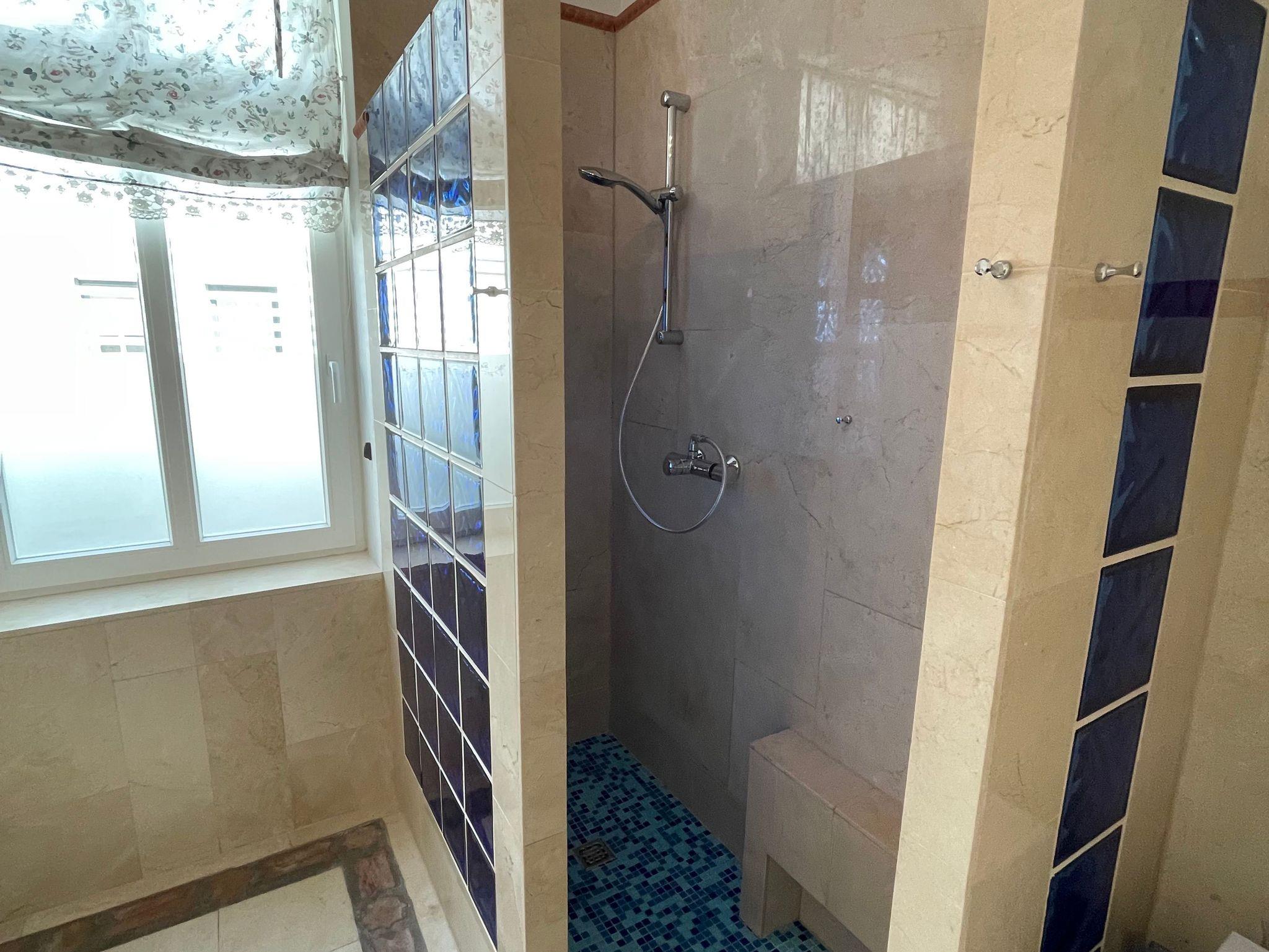 Marmor Duschbad mit WC, Fenster und Fußbodenheizung.