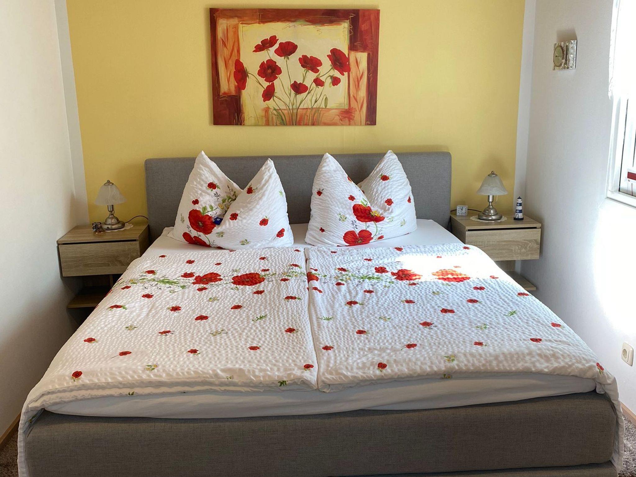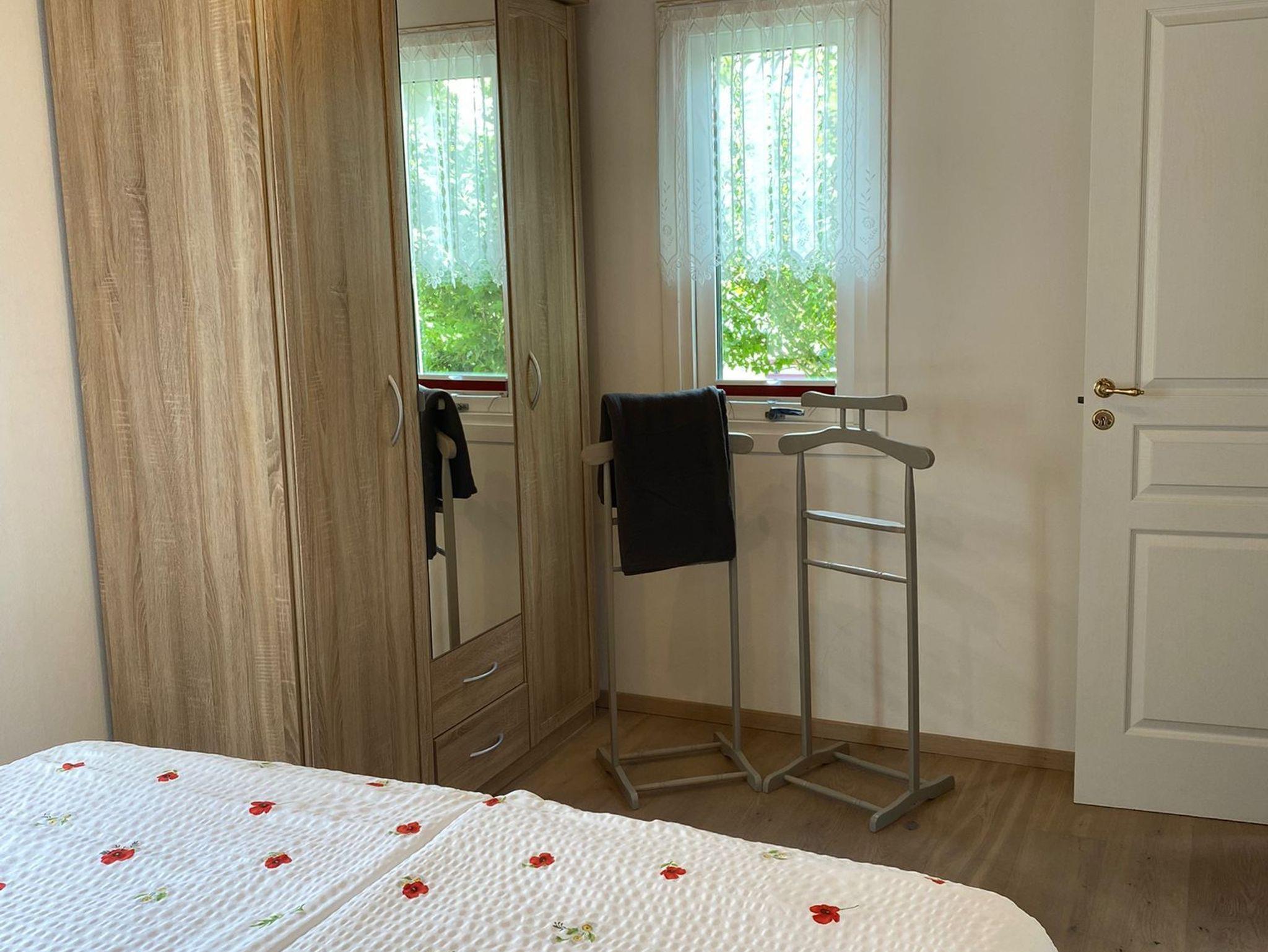 Das Schlafzimmer ist mit einem Boxspringbett (1,60m x 2,00m) ausgestattet.