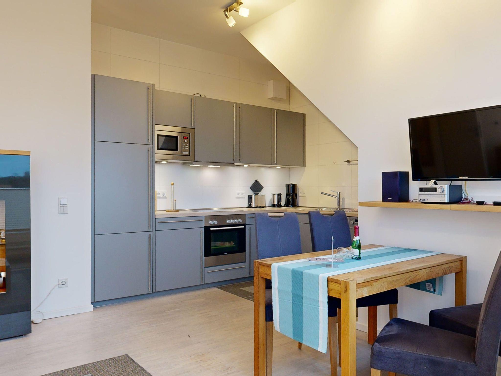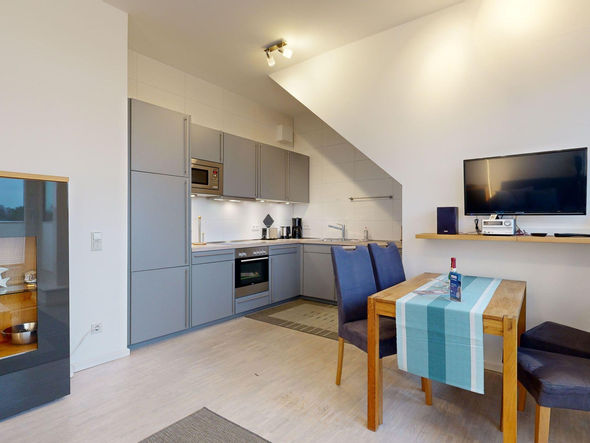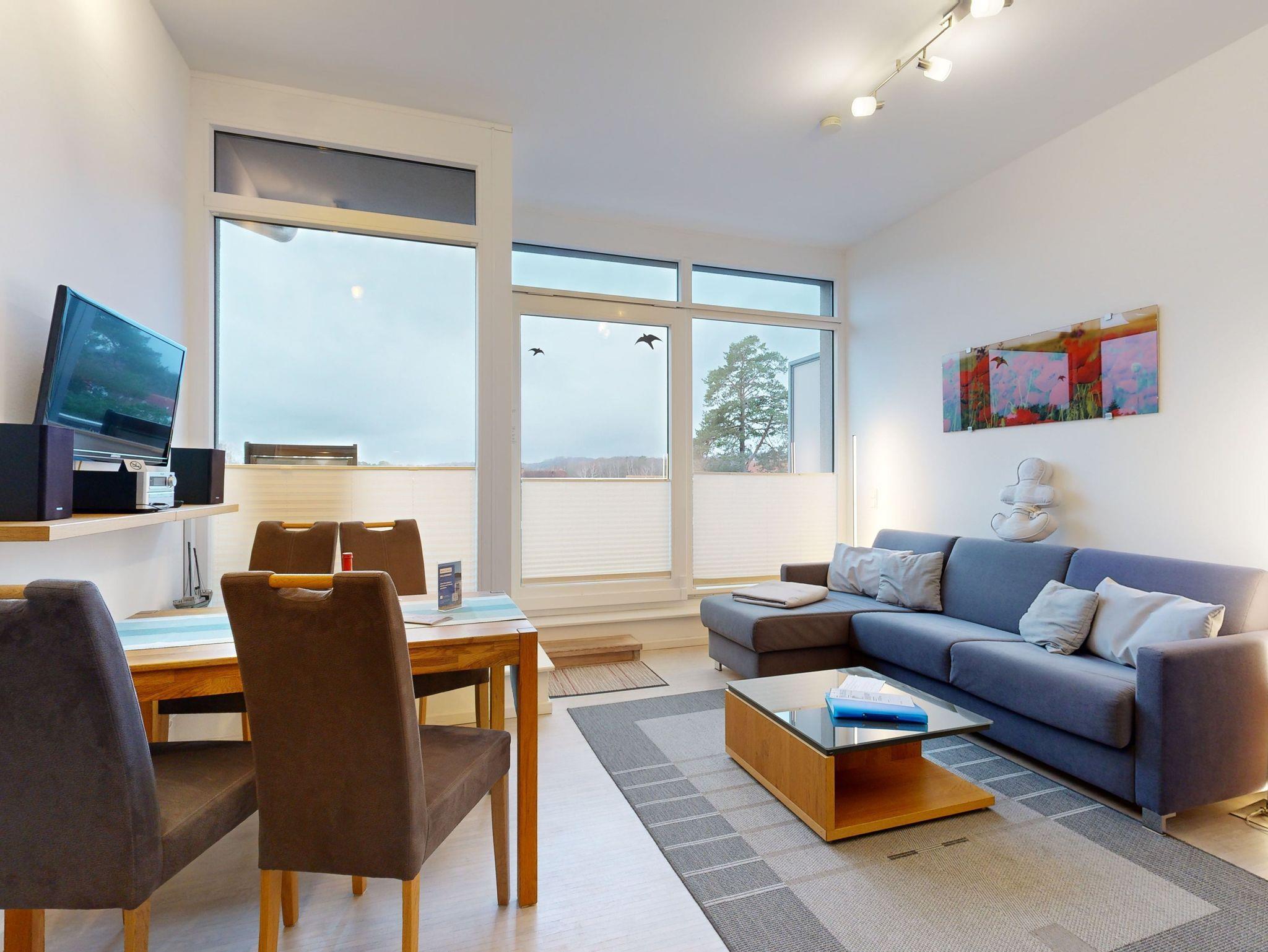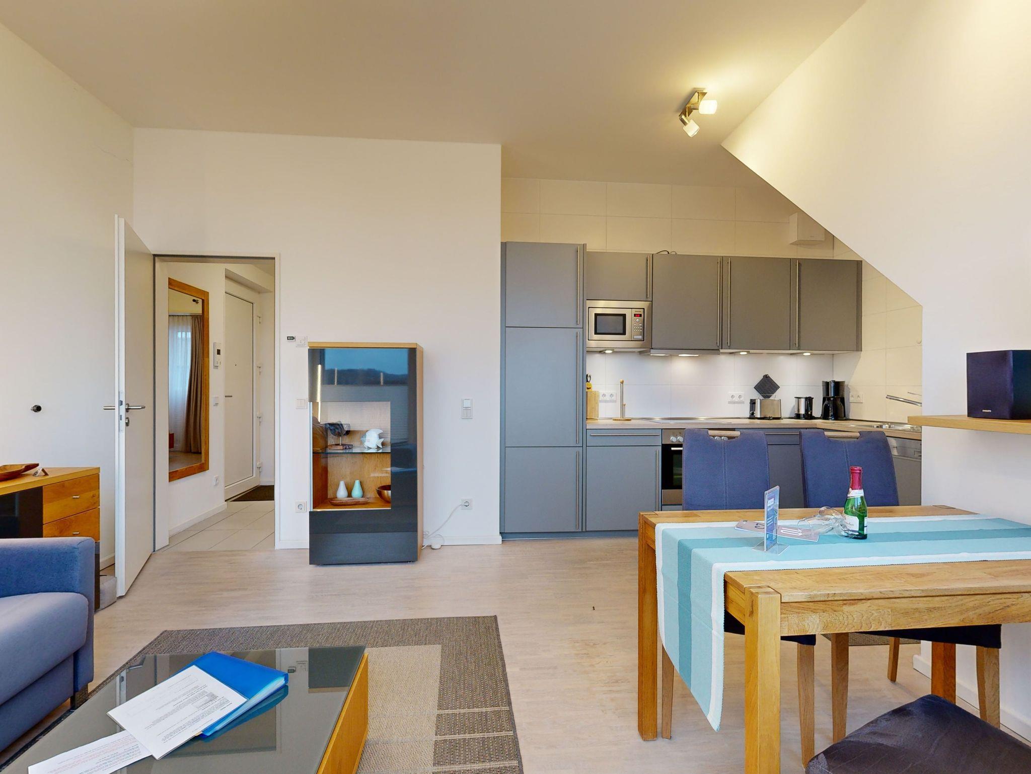 Moderne Ferienwohnung im DünenResort Binz nahe Strand, mit Dachterrasse und Strandkorb für entspannte Urlaubsmomente.