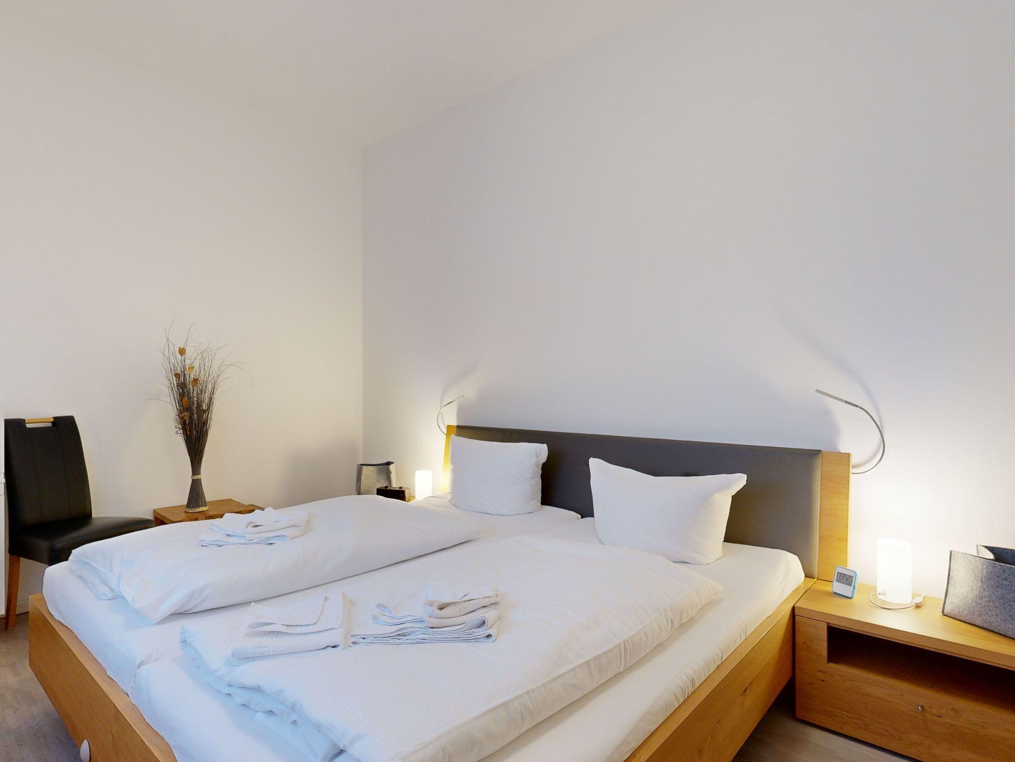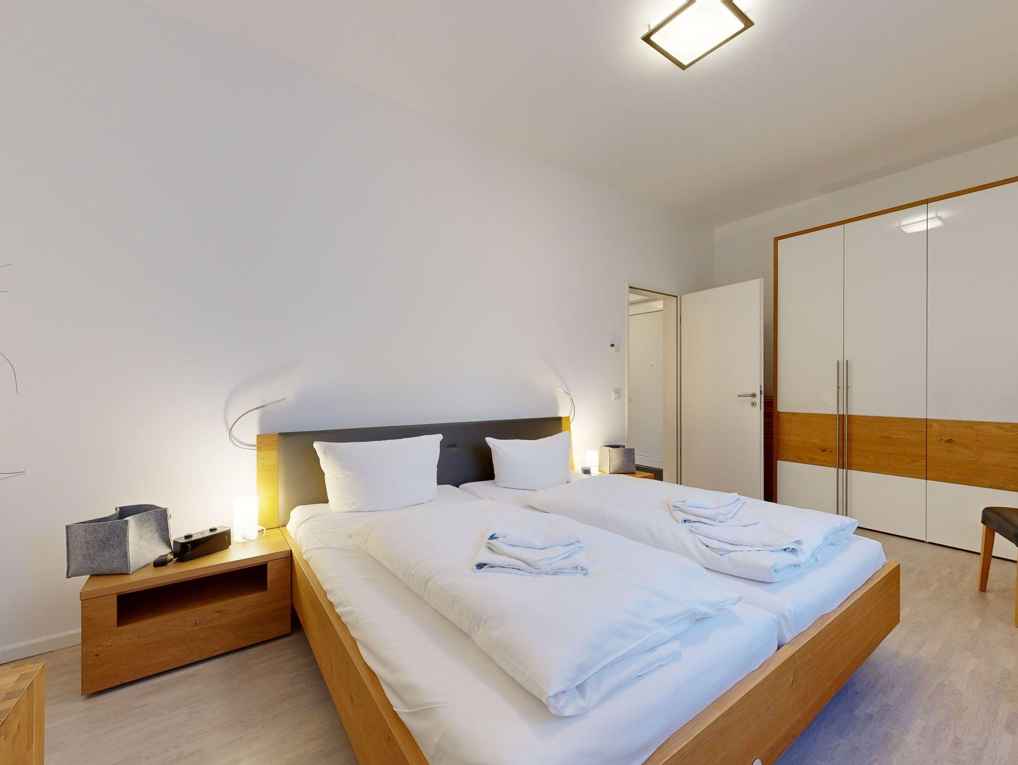 Die Komfort Wohnung im 3. OG (2 Zimmer / 52 m²) hat ein Schlafzimmer mit einem großen Doppelbett (200 x 200 cm) und eine Dachterrasse mit Strandkorb.