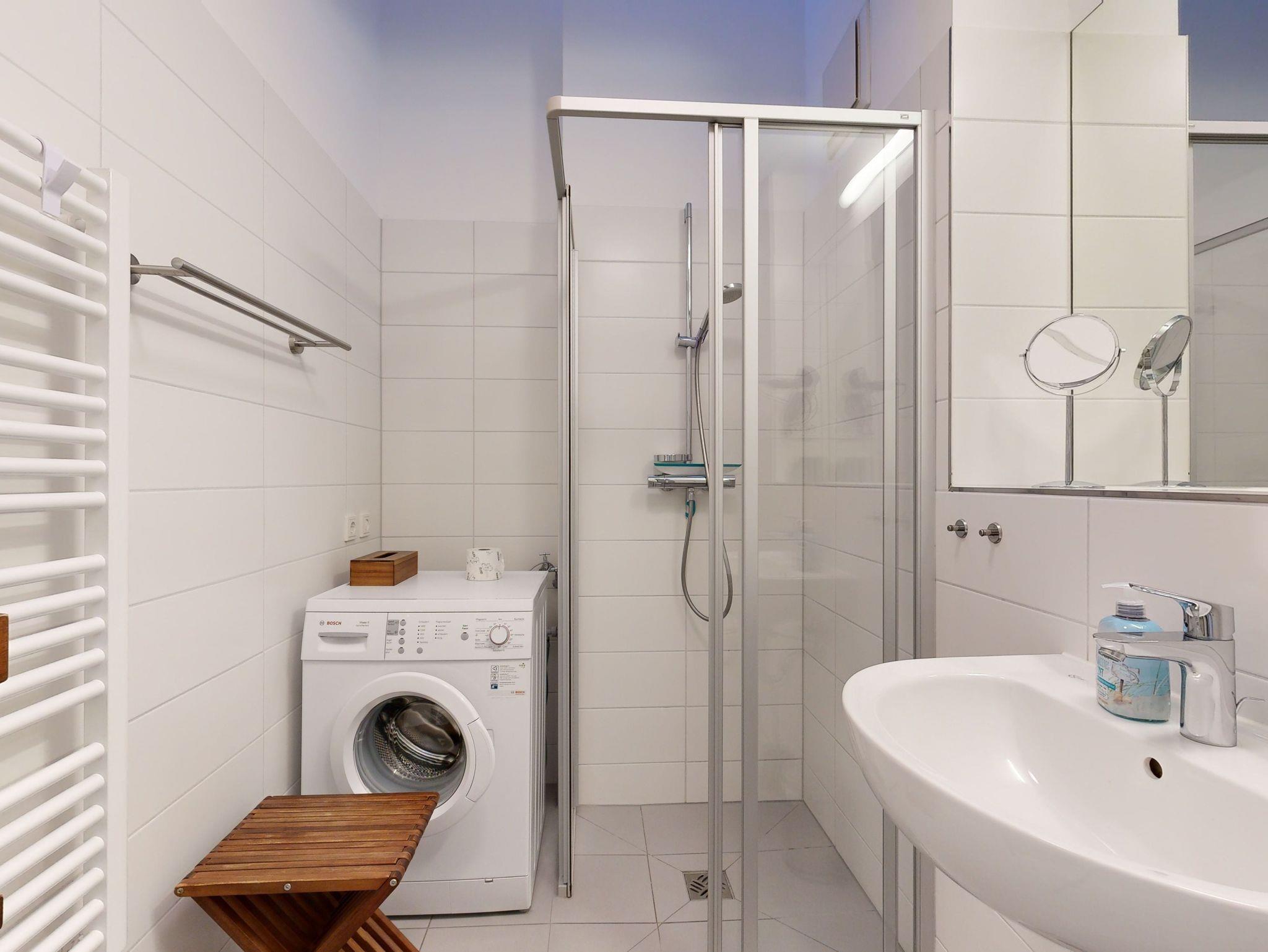 Badezimmer mit Dusche, WC, Waschmaschine und Föhn