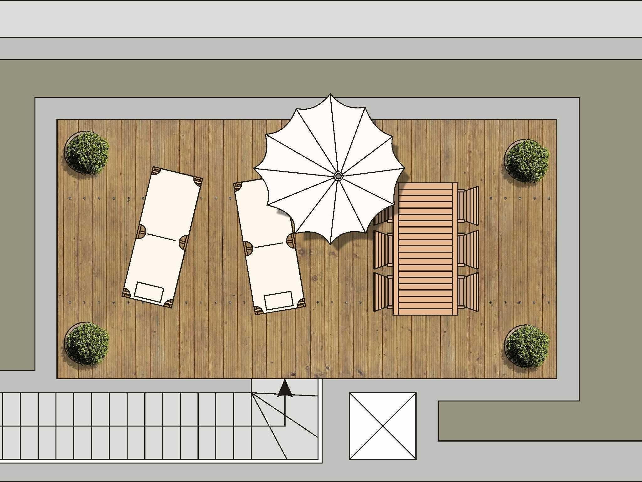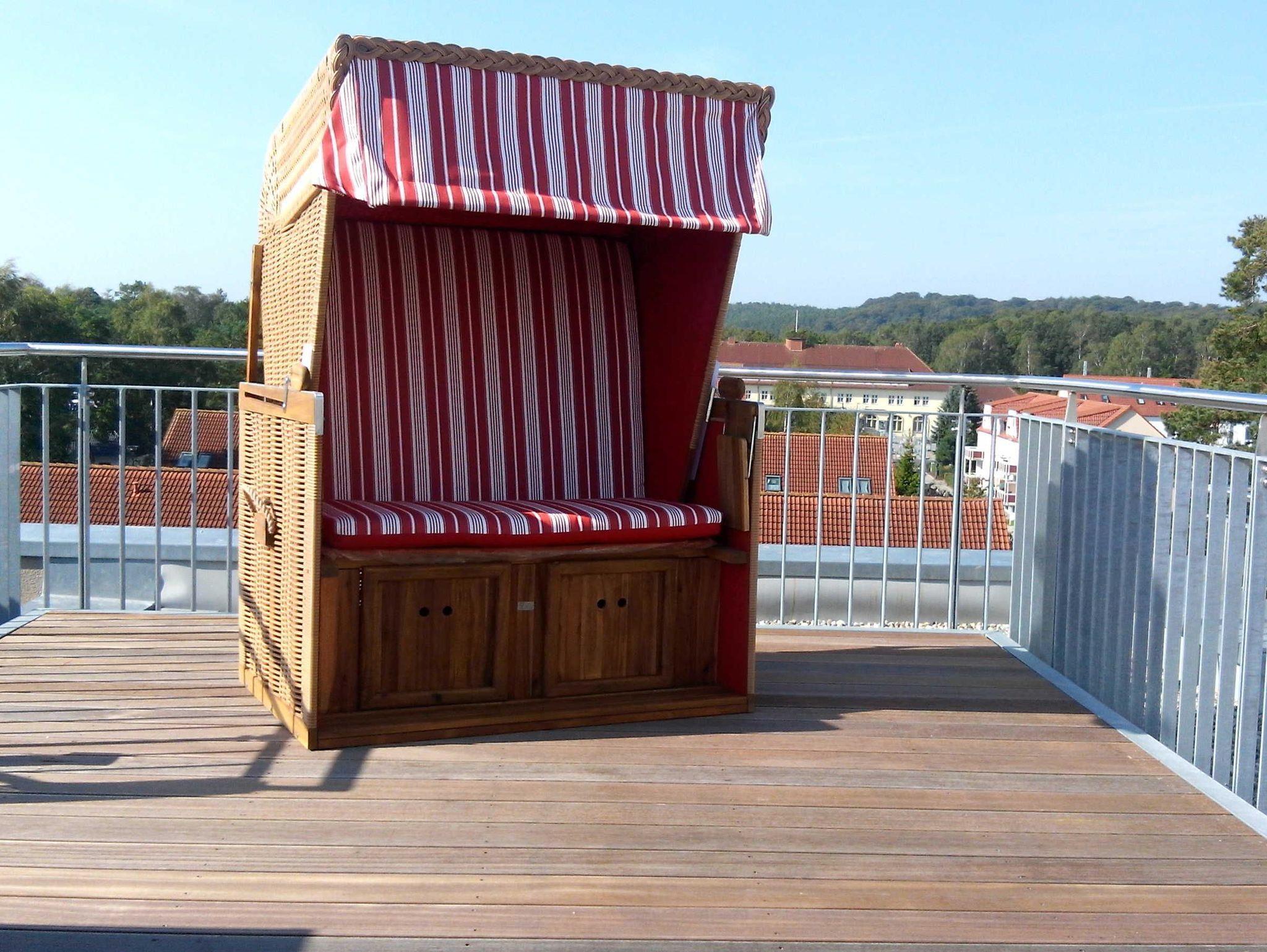 Zusätzlich gibt es über eine Treppe eine Dachterrasse mit einem Strandkorb und einem fantastischen Rundumblick über ganz Binz. Bei der Dachterrasse weisen wir auf eine eingeschränkte Nutzungsmöglichkeit hin. Es ist der Lebensraum der Möwen, die hier zu Hause sind und sich durchaus bemerkbar machen.