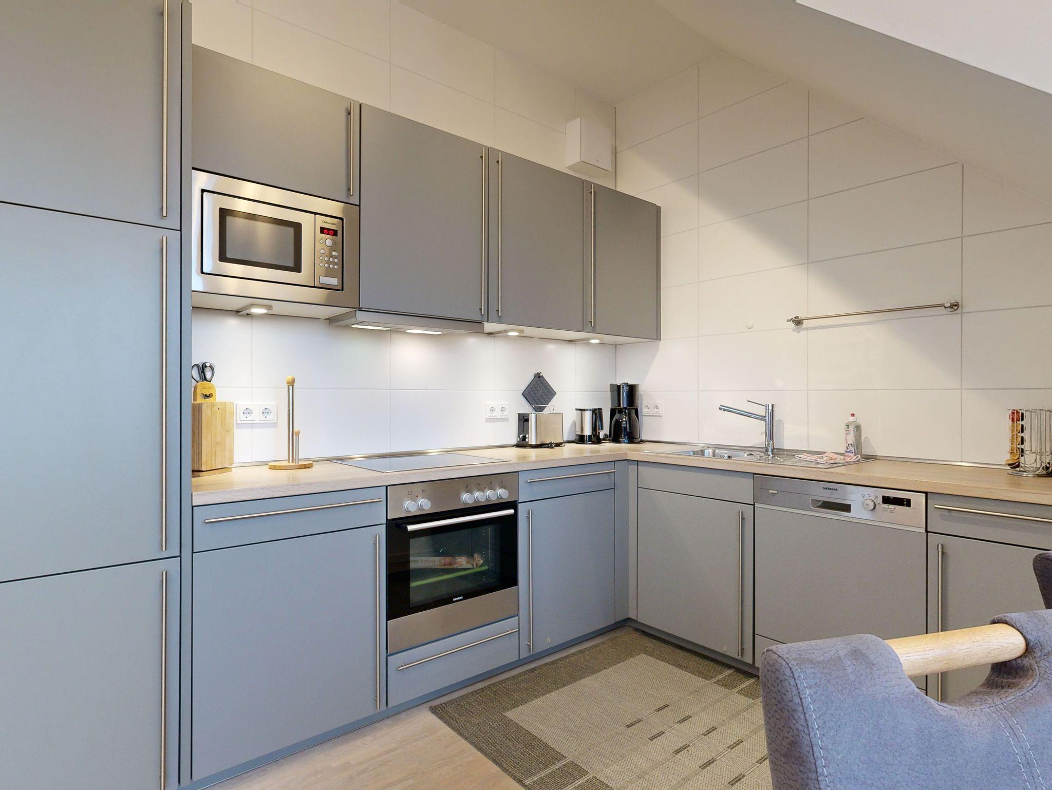 Küche: Moderne Küchenzeile mit Ceran-Herd, Backofen, Spülmaschine, Mikrowelle, Wasserkocher, Toaster, Kaffeemaschine, Kaffee-Kapselmaschine (Tchibo Cafissimo)