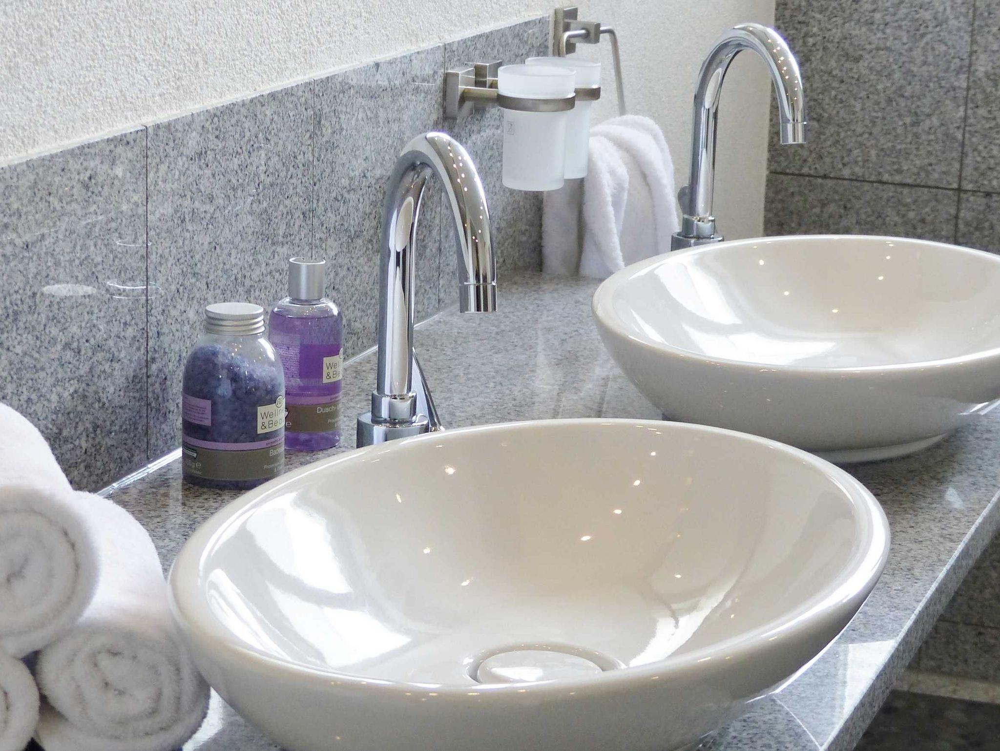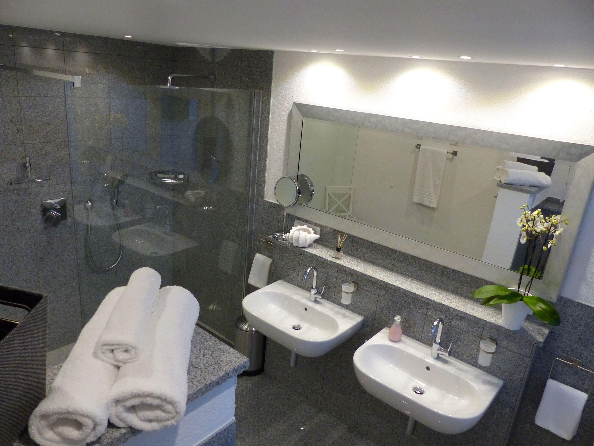 • Echtglas-Walk-In-Dusche, 2 Waschtische, Fön, Fenster mit Sichtschutz, Granitfußboden, Markenarmaturen bzw. -objekte