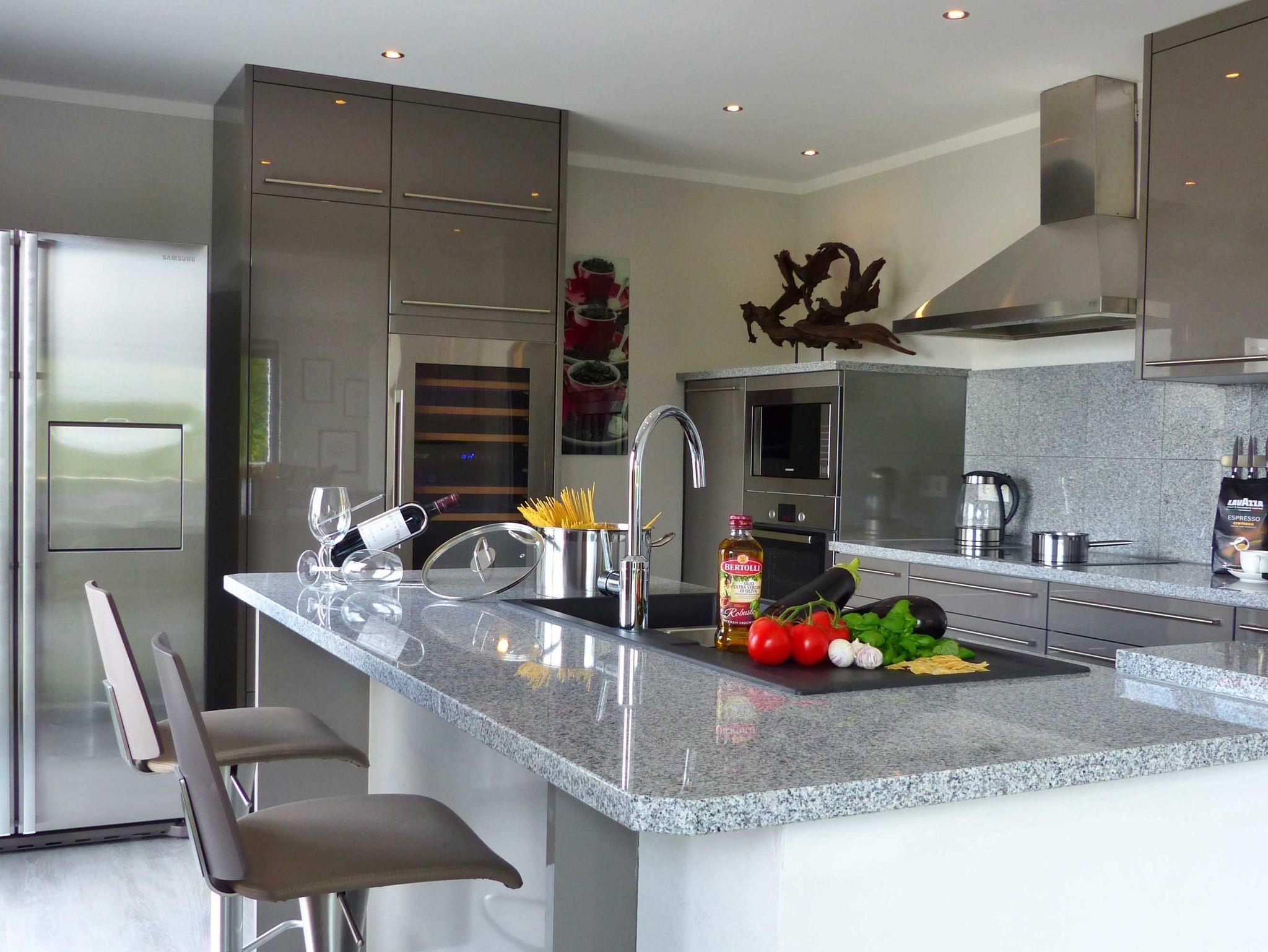 • luxuriöse Küche mit Granitarbeitsplatten, u. a. mit Geschirrspüler, Side-by-Side-Kühlschrank mit Eiswürfelbereiter, Weinkühler, JURA F50 Kaffeevollautomat