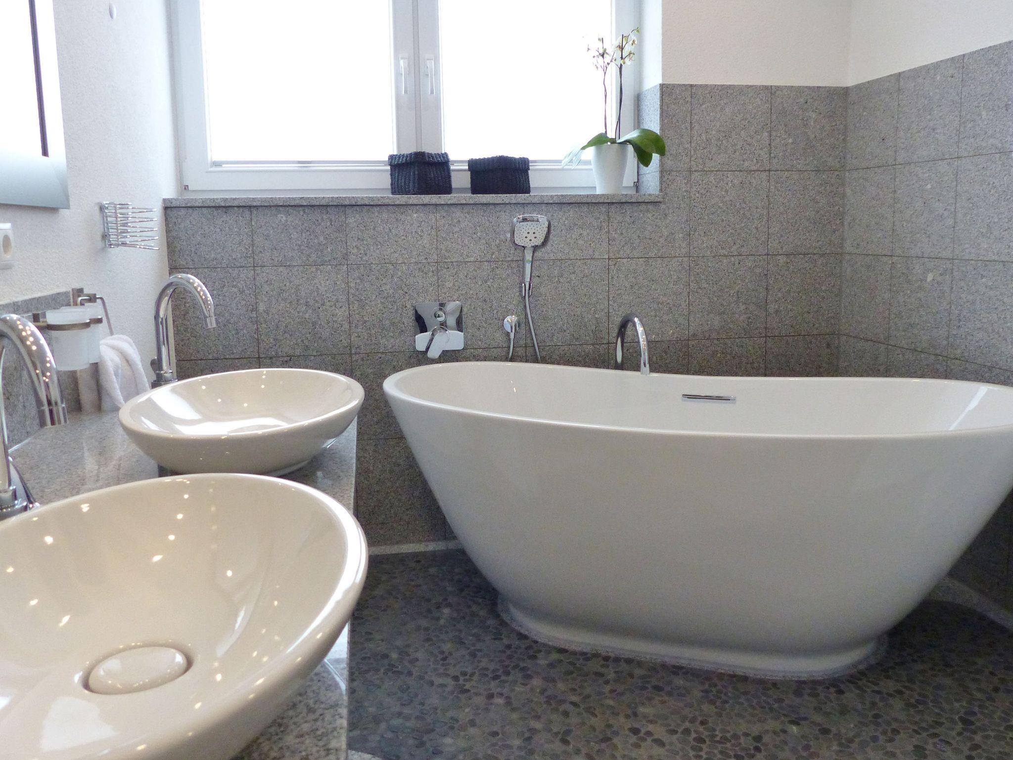 • 2 großzügige Bäder mit freistehender Designbadewanne, exklusiv mit Markenkeramik, z. B. Villeroy und Boch, Hansgrohe, ausgestattet, s. u.