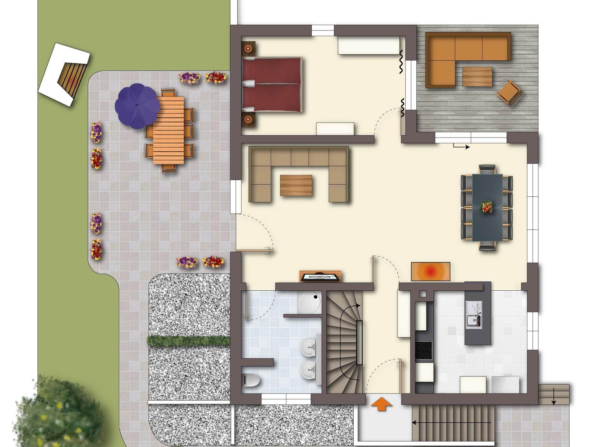 • 1 Terrasse zur Gartenseite: 6,50m x 4,50m mit Grillecke sowie Tisch und Stühle für 8 Personen