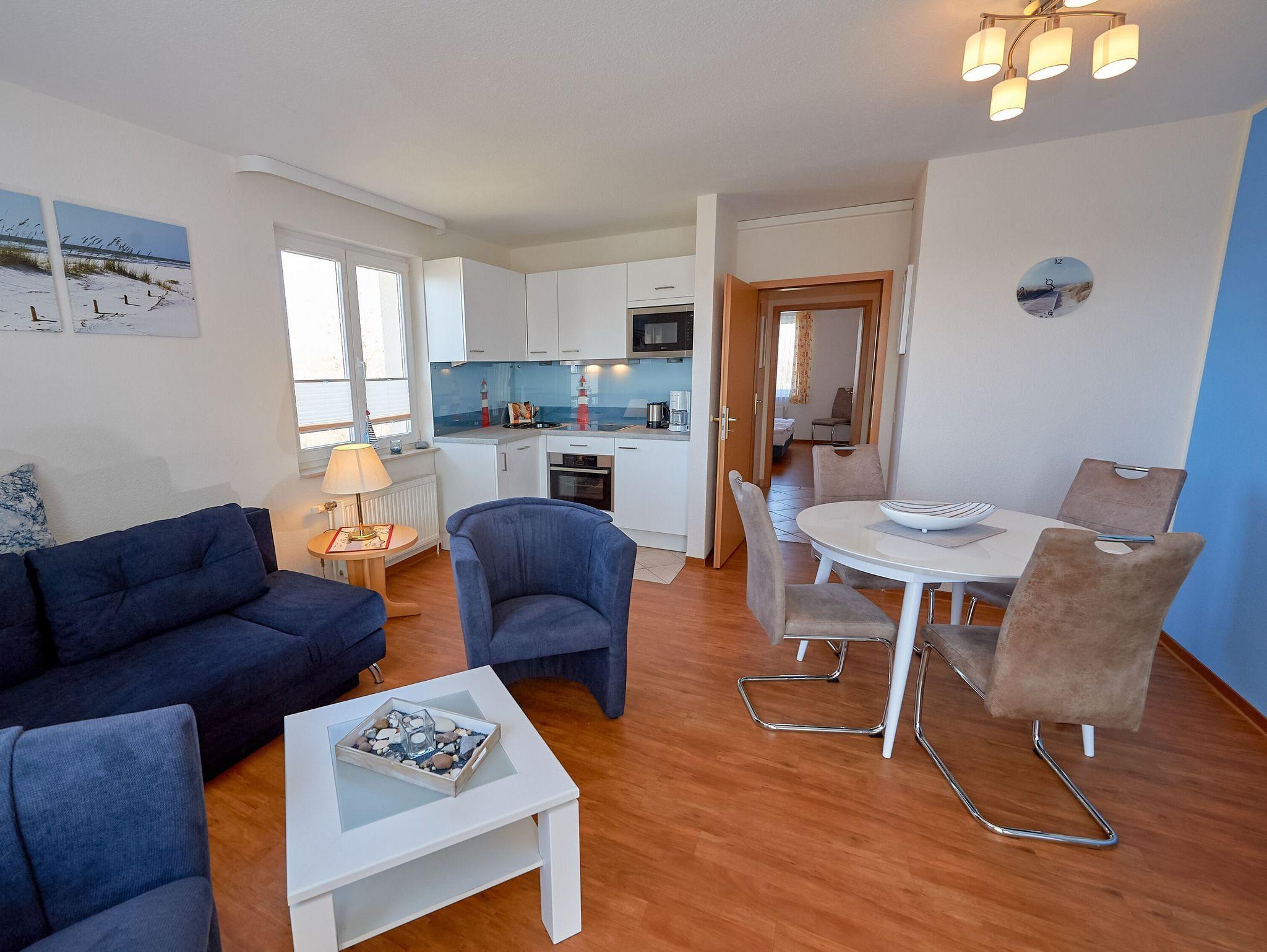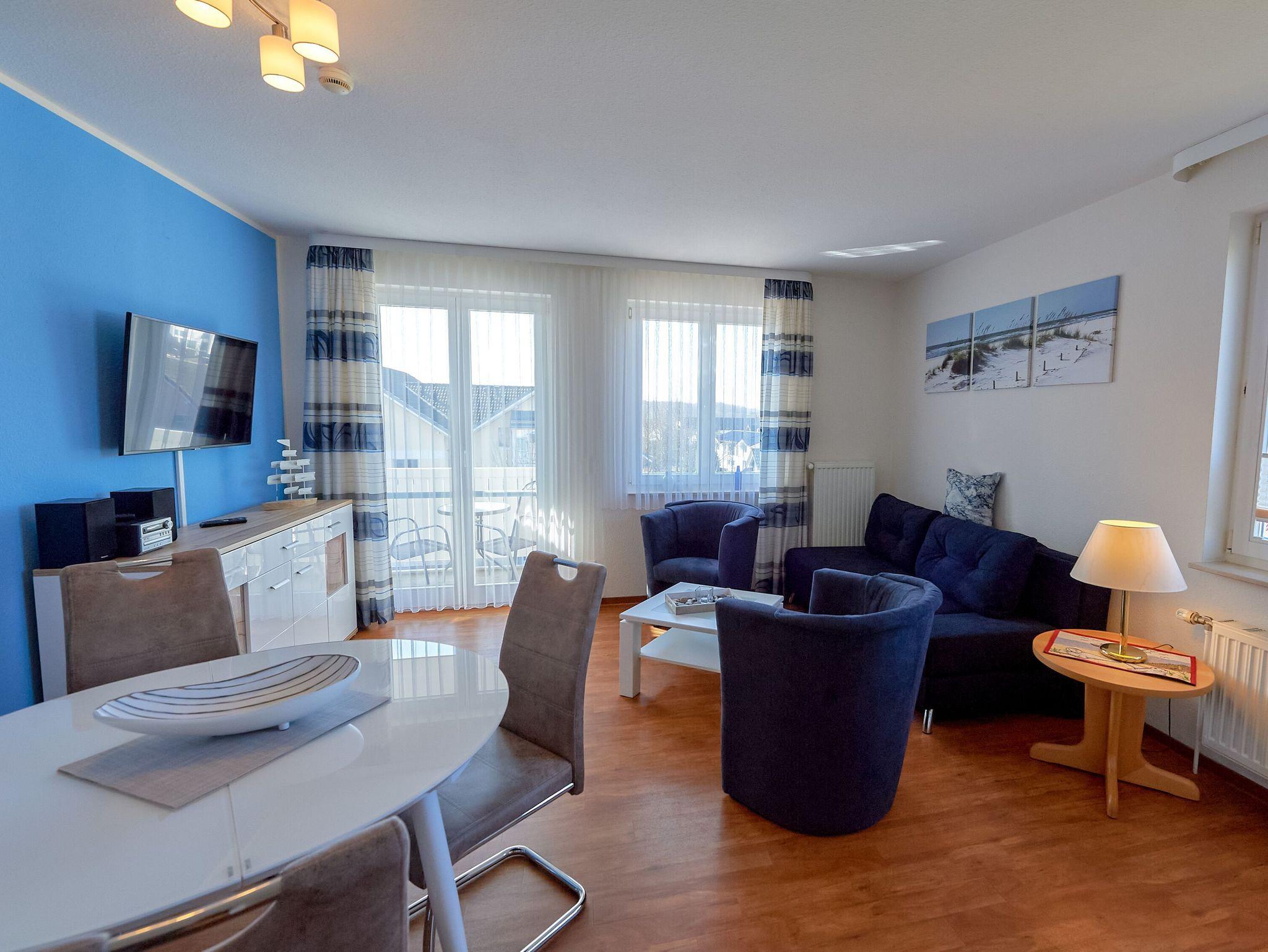 Dieses schöne 2-Raum-Appartement ist ca. 45 m² groß, befindet sich im 1. Obergeschoss und verfügt einen sonnigen Balkon zur Südseite mit teilweise seitlichem Blick zum Schmachter See. Der gemütliche Wohnraum ist mit einem Esstisch für 4 Personen, einer bequemen Schlafcouch, einer Mini-Stereoanlage, einem Flachbild ? TV und einem DVD-Player ausgestattet.