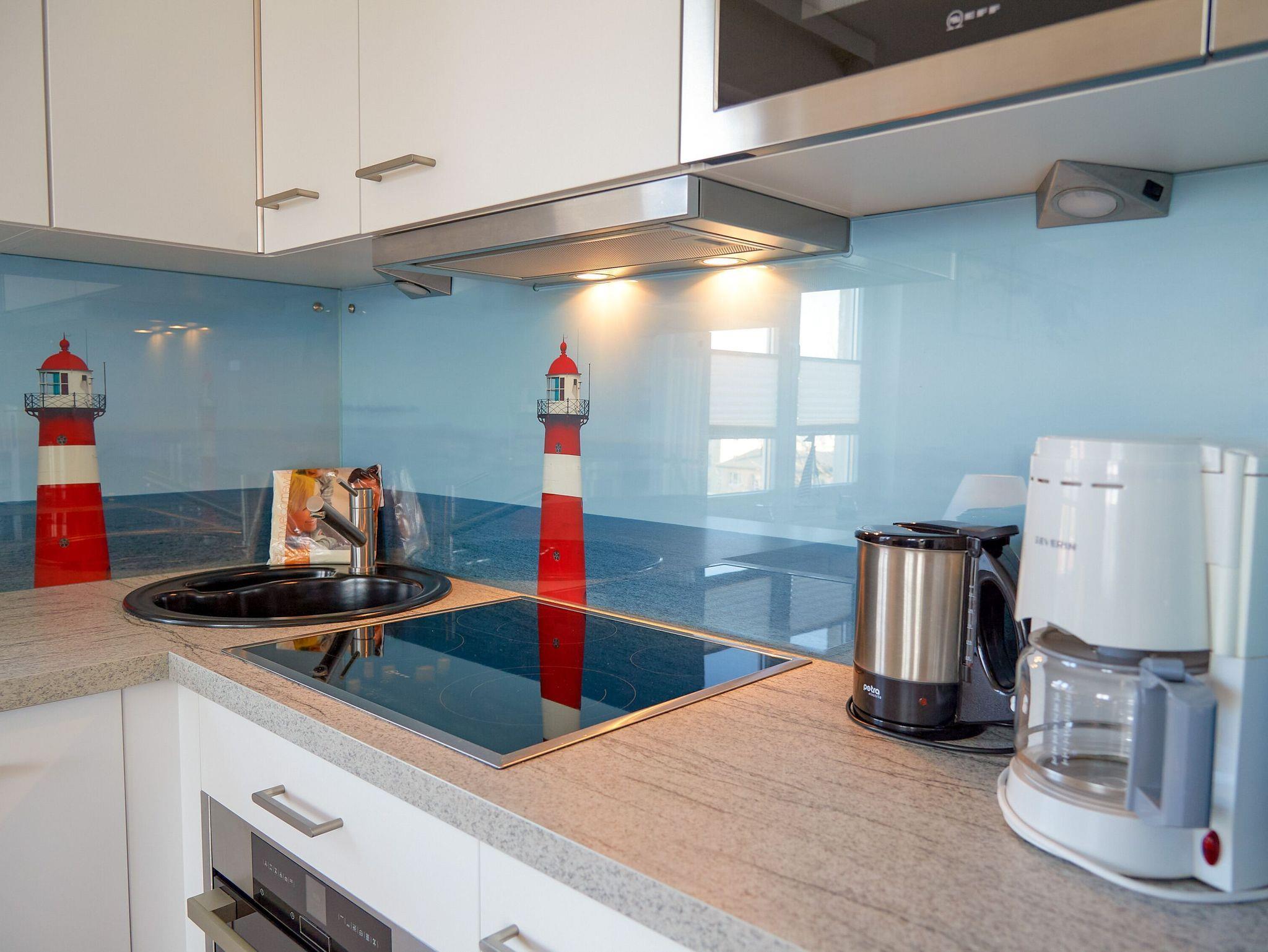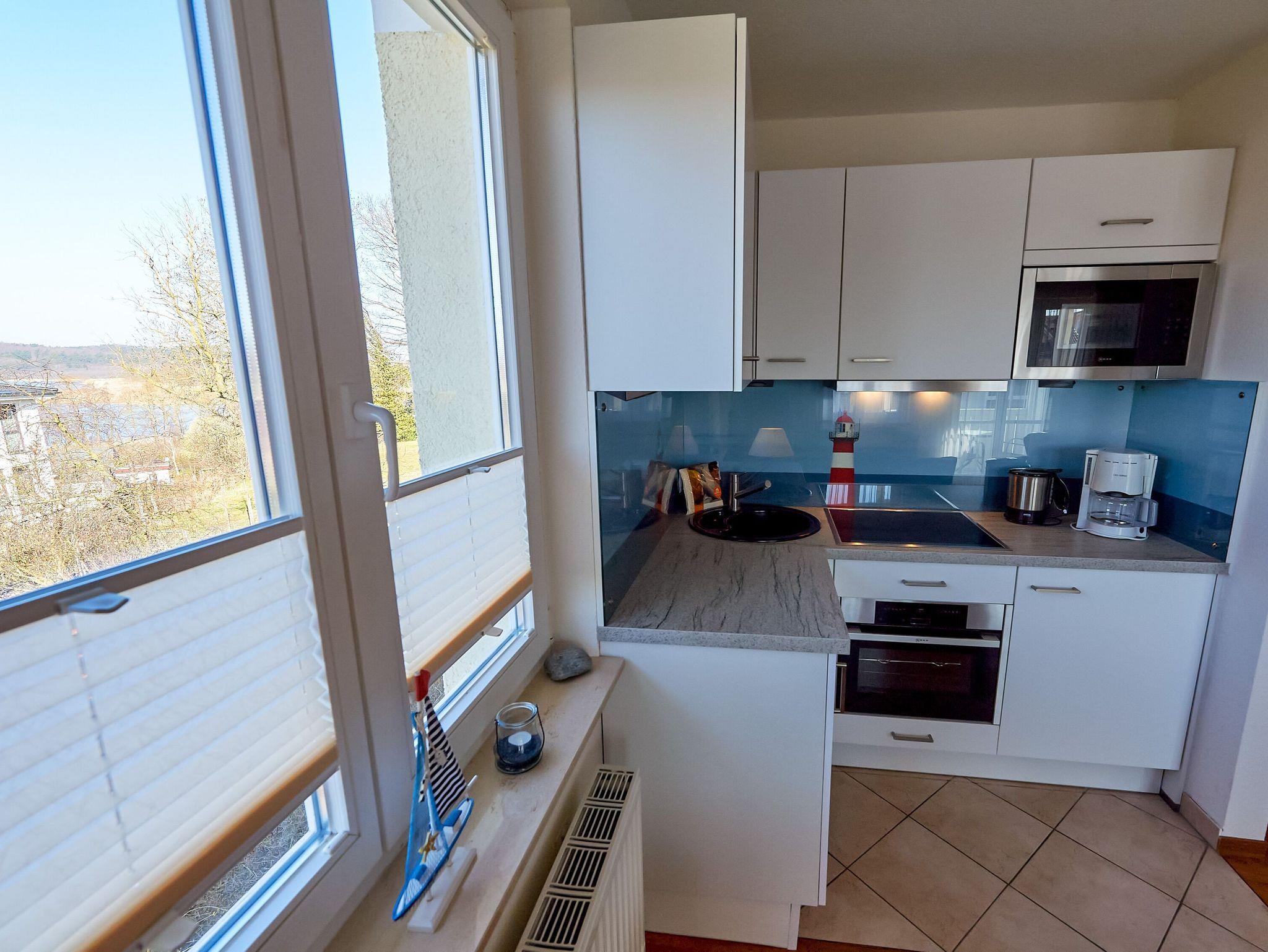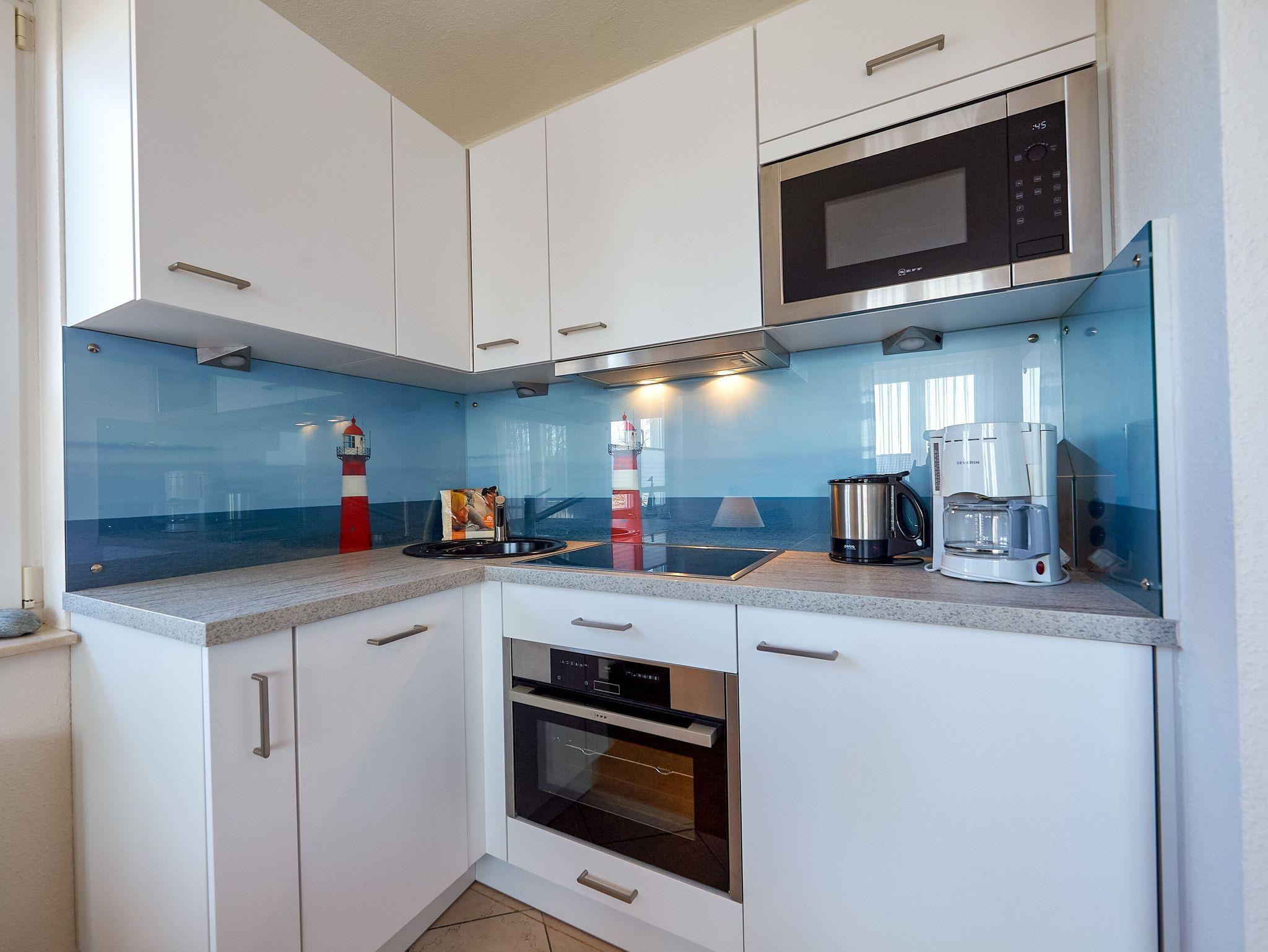 Die komplett ausgestattete Küchenzeile wurde harmonisch in den Wohnraum integriert. Ein Kühlschrank mit Gefrierfach, eine Mikrowelle, ein 4-Zonen-Cerankochfeld, ein Backofen, ein Geschirrspüler, sowie Wasserkocher, Kaffeemaschine, Toaster und diverses Kleininventar komplettieren die Küchenausstattung.
