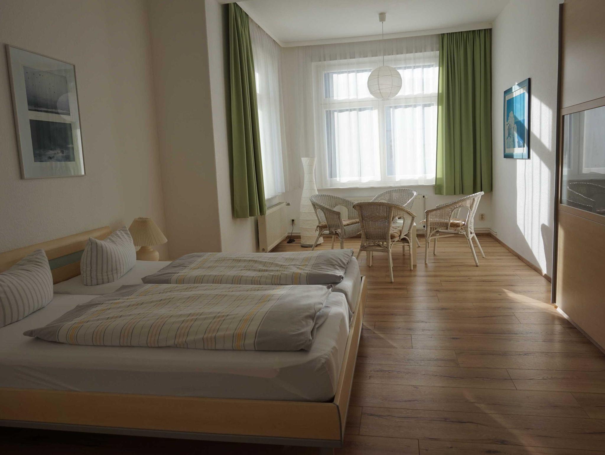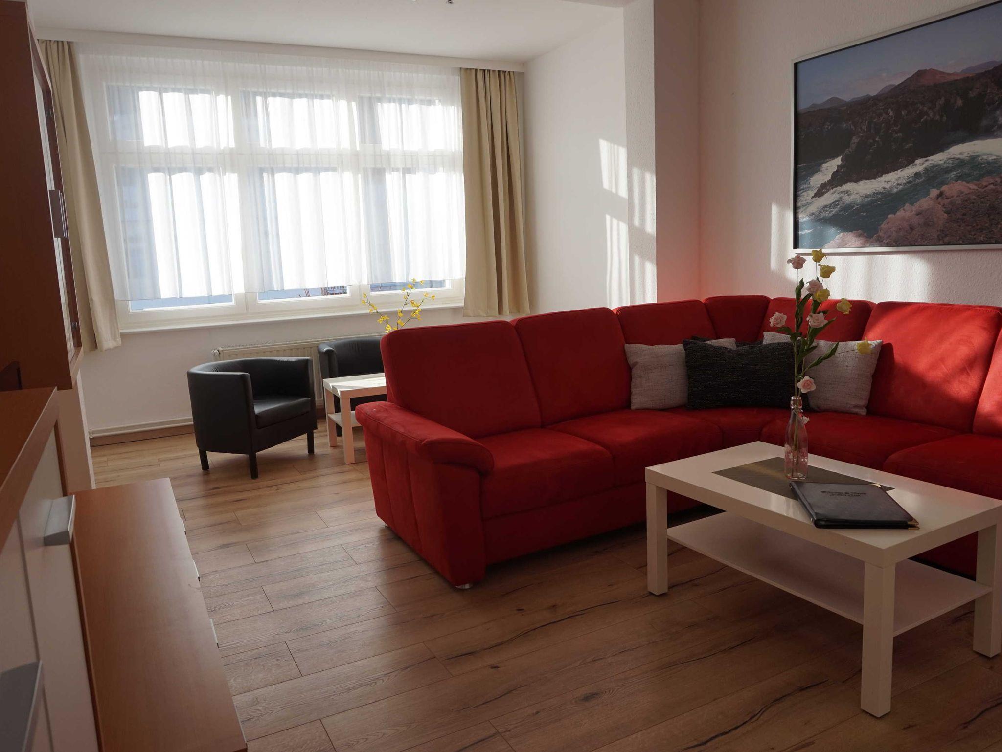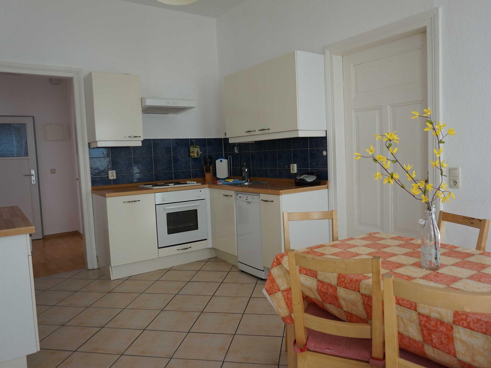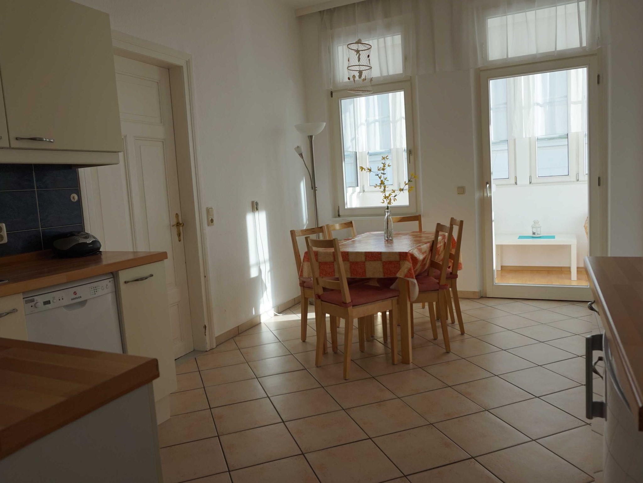 Die Wohnung 7 ist eine 3-Raumferienwohnung im ersten Geschoß, verfügt über ca. 95,00 m² Wohnfläche und ist ideal für 2 Erw. mit Kindern geeignet. Die Wohnung hat folgende Aufteilung: 2 Schlafzimmer (14m²) u.( 21m²) jeweils ausgestattet mit Doppelbett 1,80x2,00m. Wohnzimmer ( 26 m² ), Sitzgruppe mit Schlaffunktion 1,40x2,0m , TV, CD-Radio. Küche als Durchgangszimmer (ca.16m²) , Einbauküche mit Kühlschrank,4 Plattenkochfeld mit Backofen, großer Eßtisch,Geschirrspüler, Kaffeemaschine, Wasserkocher, Toaster, Geschirr, Radio. Verglaster Balkon (5m²), Flur ( 4 m² )und Bad mit Wanne und Dusche (9m²).Bei Belegung mit mehr als 4 Personen, 2 Schlafmöglichkeiten im Wohnzimmer.