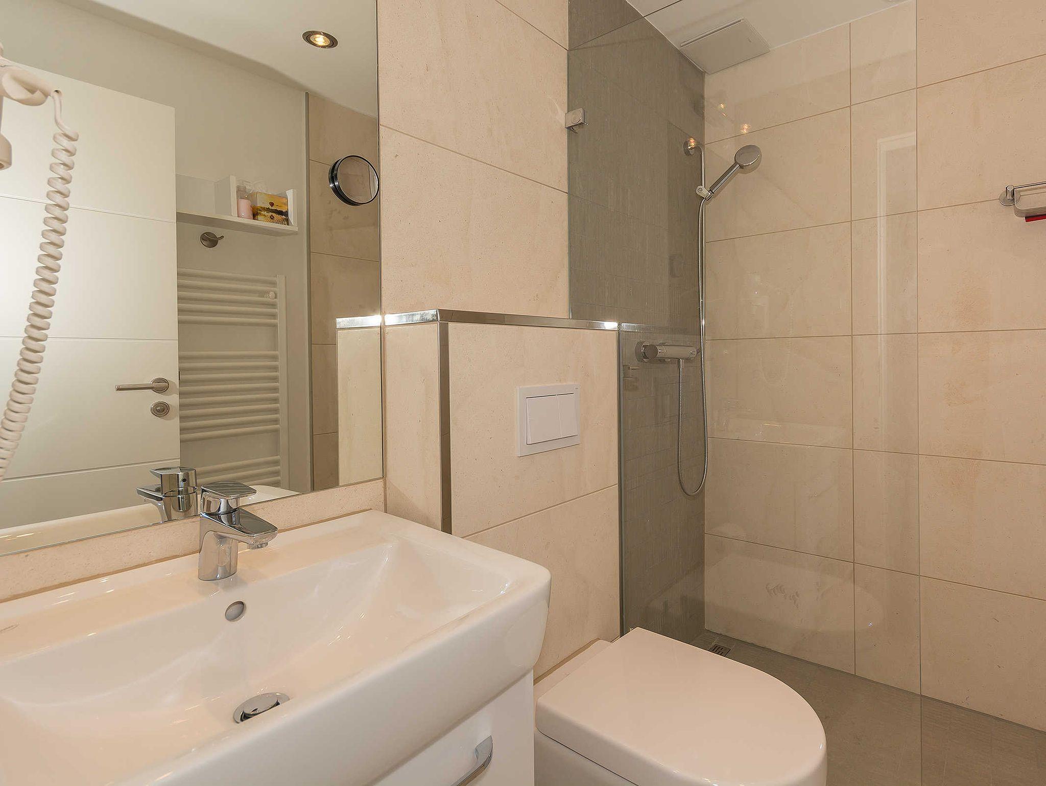 Das moderne Marmorbad beinhaltet eine große ebenerdige Dusche, regulierbare Fussbodenheizung, Fön, Handtuchtrocker etc .