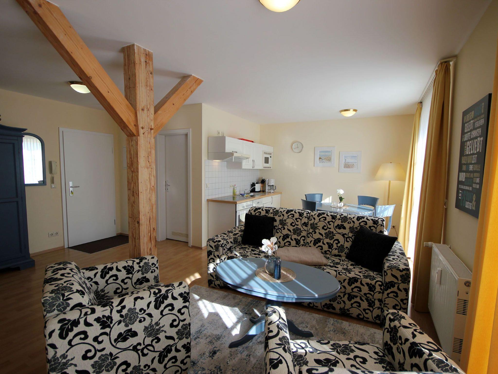 Ihre gemütliche Maisonettewohnung 26RB10 hat eine Größe von ca. 66 qm und ist für bis zu 4 Personen eingerichtet. Die Nichtraucherwohnung befindet sich im 2. und 3. Obergeschoss des Hauses und verfügt über einen Südbalkon. Im 2. Obergeschoss befindet sich der gemütliche Wohnraum mit angrenzender Wohnküche, dem Essbereich sowie das separate Duschbad. Im Wohnbereich gibt es eine schöne Sitzecke mit Sesseln, ein Flachbildfernseher sowie einen kostenfreien WLAN-Zugang. Die Küchenzeile ist ausgestattet mit Geschirrspüler, Backofen, Ceranfeld, Kühlschrank, Mikrowelle, Kaffeemaschine, Wasserkocher und Toaster. Das Bad verfügt über eine Dusche, einen Waschtisch und WC. Über die Wendeltreppe gelangen Sie in das 3. Obergeschoss direkt in das geräumige Schlafzimmer. Hier erwartet Sie ein Doppelbett und zusätzliche Sitzmöglichkeiten. Haustiere sind herzlich willkommen. Ein PKW-Stellplatz steht Ihnen auf dem Parkplatz „Zentrum“ (ca. 400m vom Objekt entfernt) zur Verfügung.
