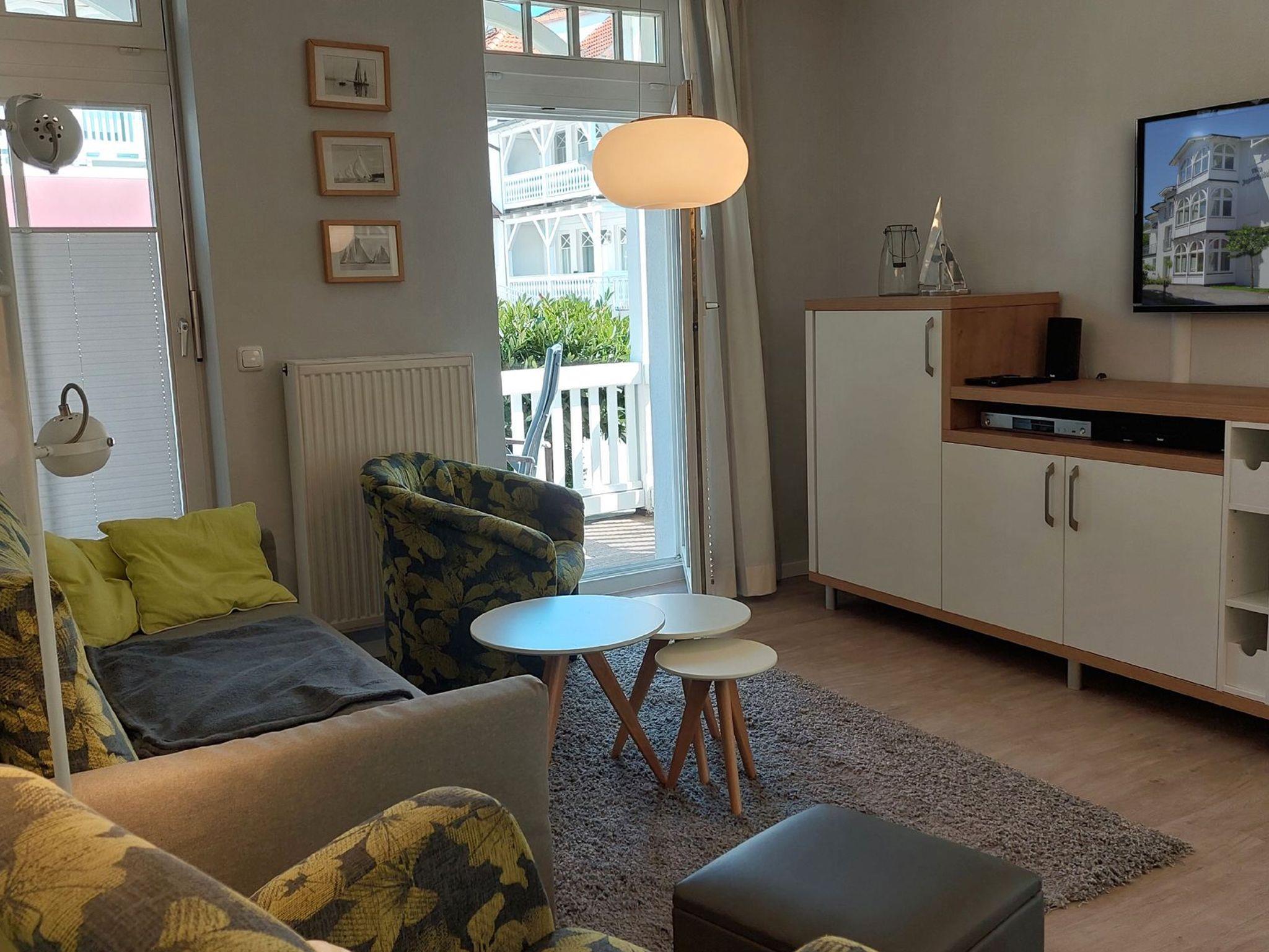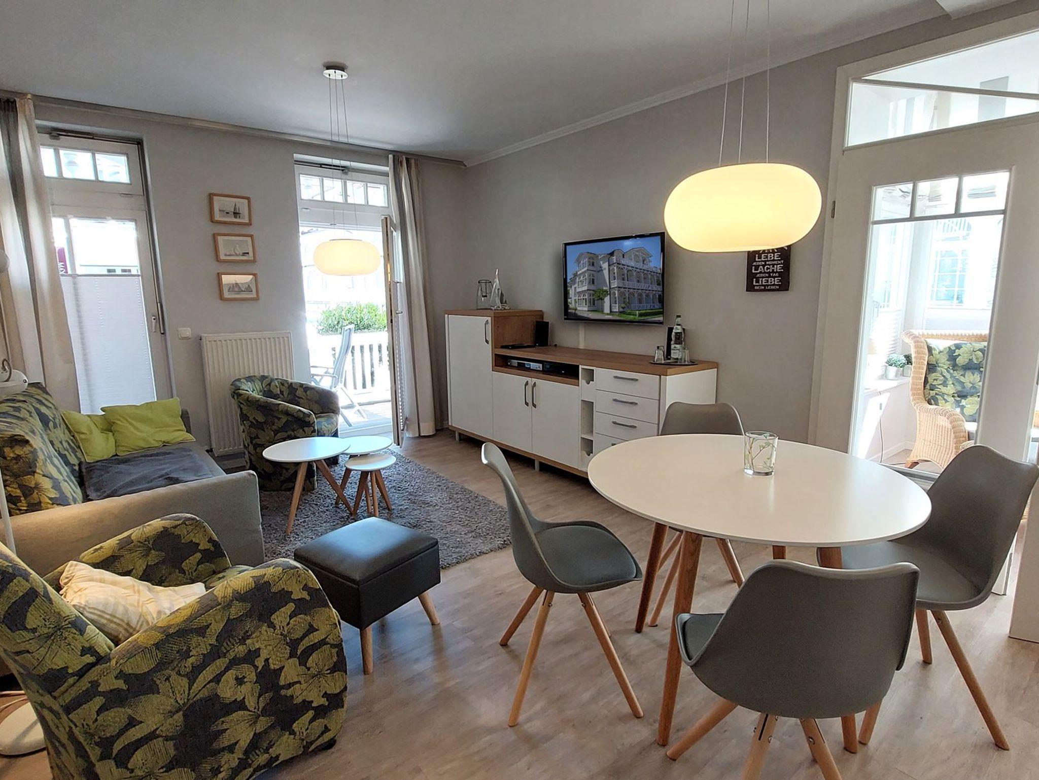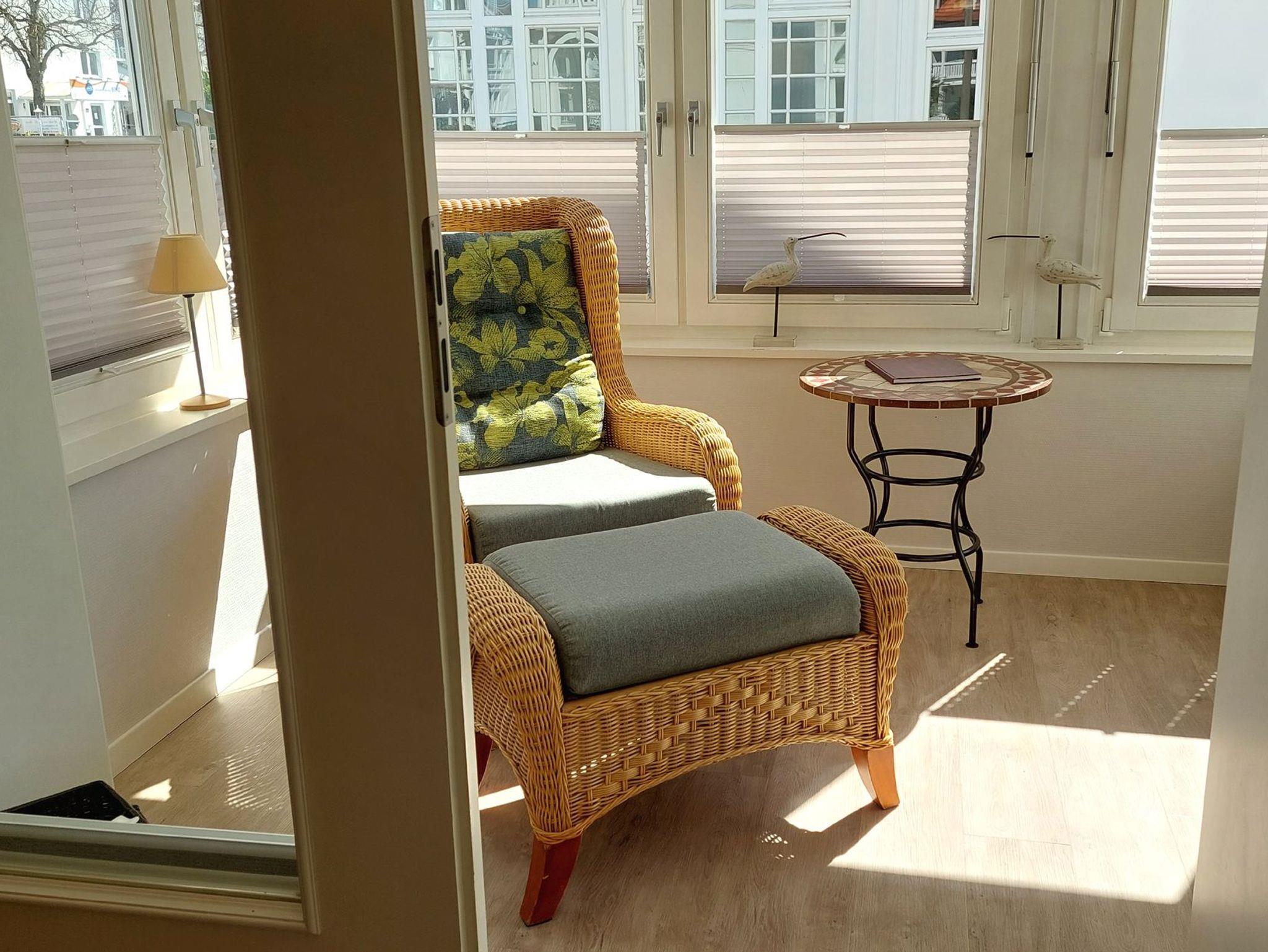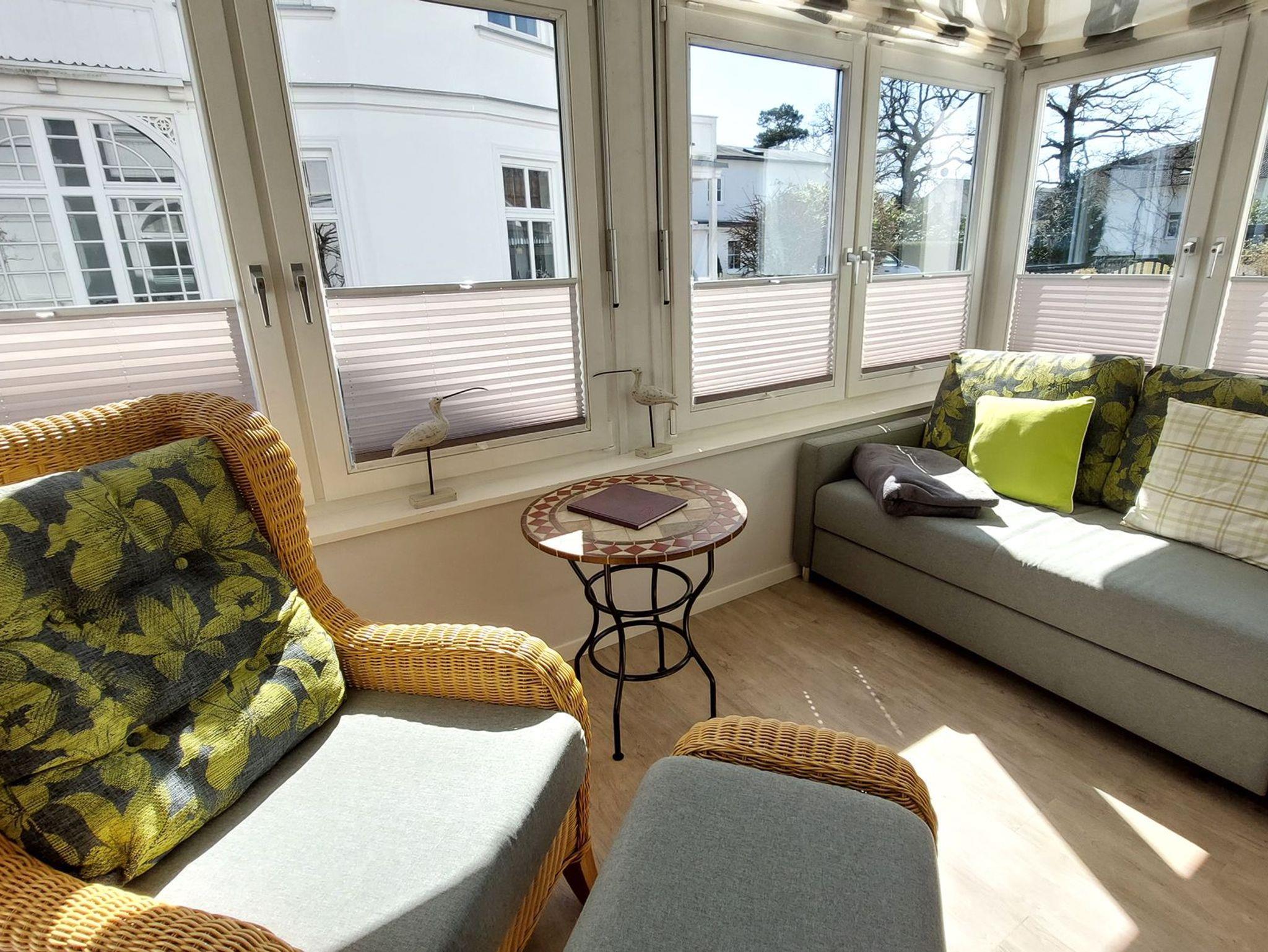 Moderne Ferienwohnung in Binz mit Wintergarten, Balkon und eigenem Strandkorb im Sommer 2025.