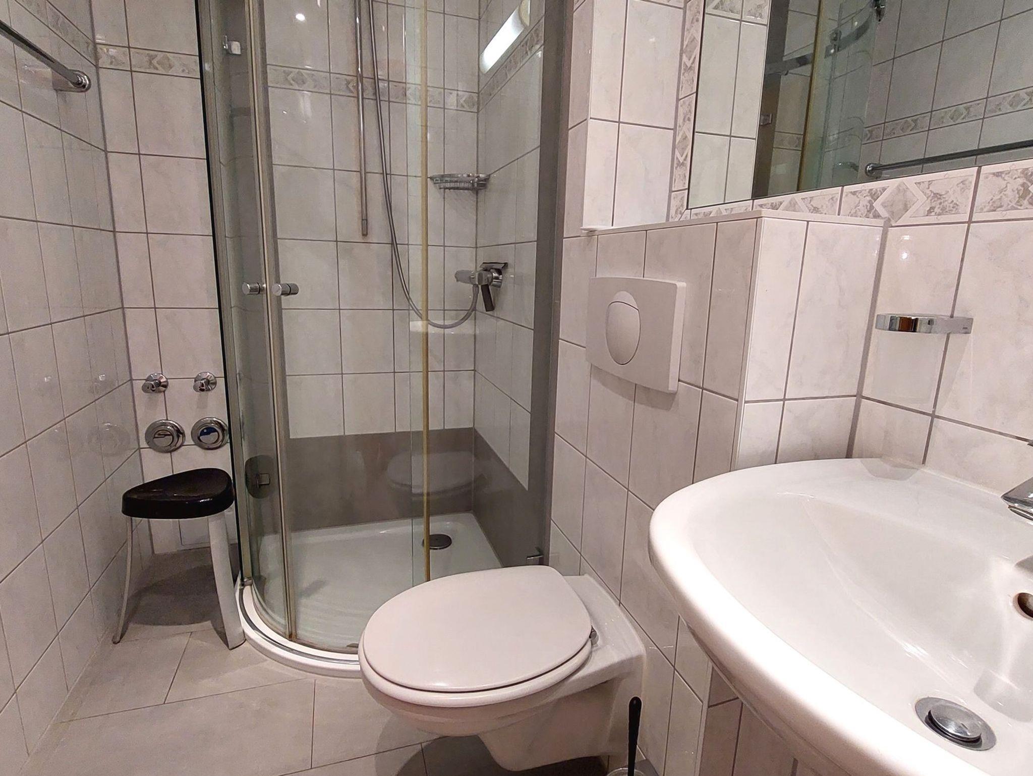 Das Badezimmer verfügt über WC, Dusche, Kosmetikspiegel und Föhn.