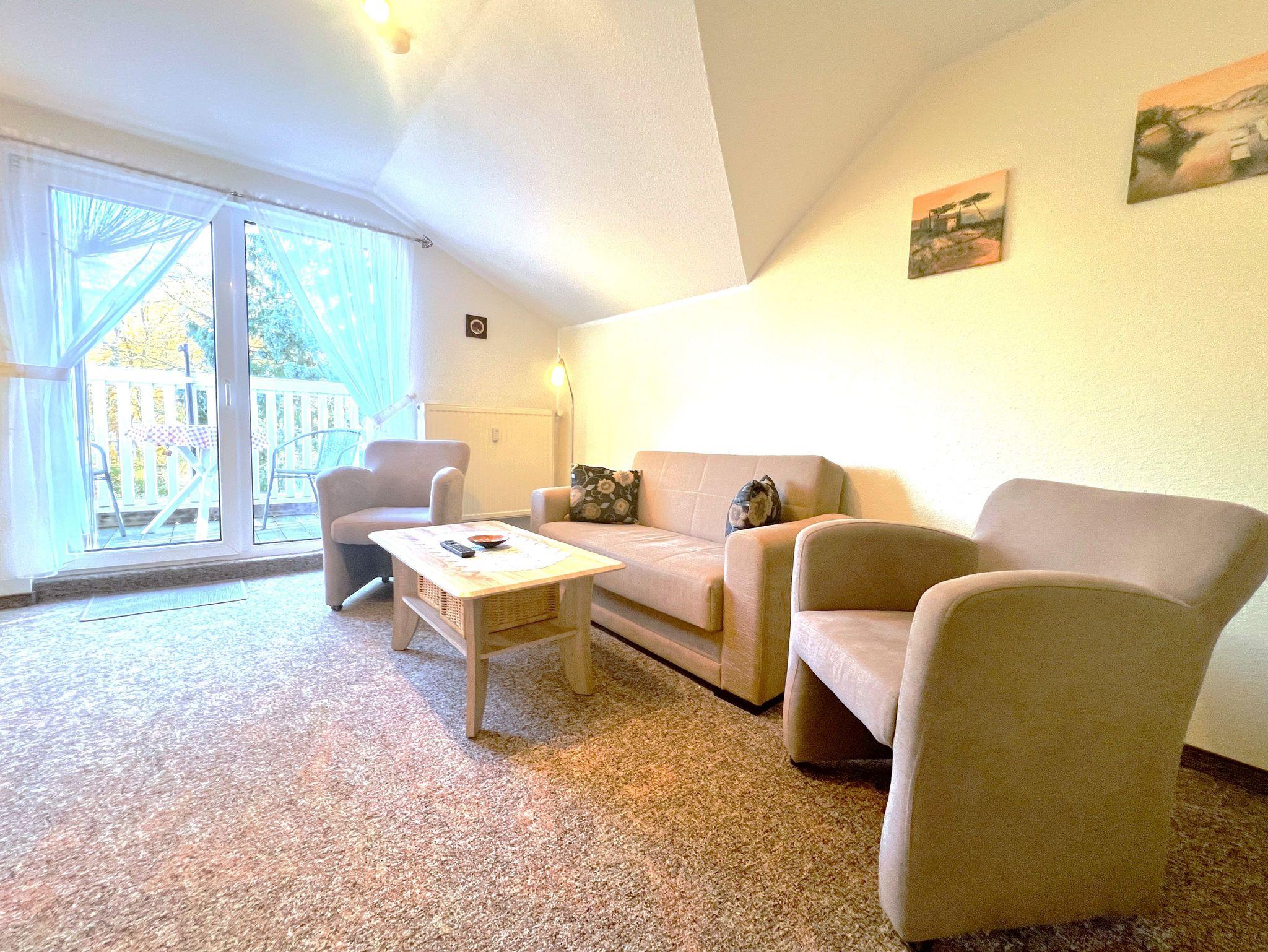Die gemütliche Dachgeschosswohnung im dritten Obergeschoss bietet auf rund 40 m² Platz für zwei Personen und liegt in unmittelbarer Nähe zum Strand, nur etwa eine Gehminute entfernt. Sie verfügt über ein Wohnzimmer mit angrenzendem Balkon mit Aussicht auf den angrenzenden Kurpark, eine separate Küche, ein Schlafzimmer, ein Badezimmer sowie einen kleinen Flur.