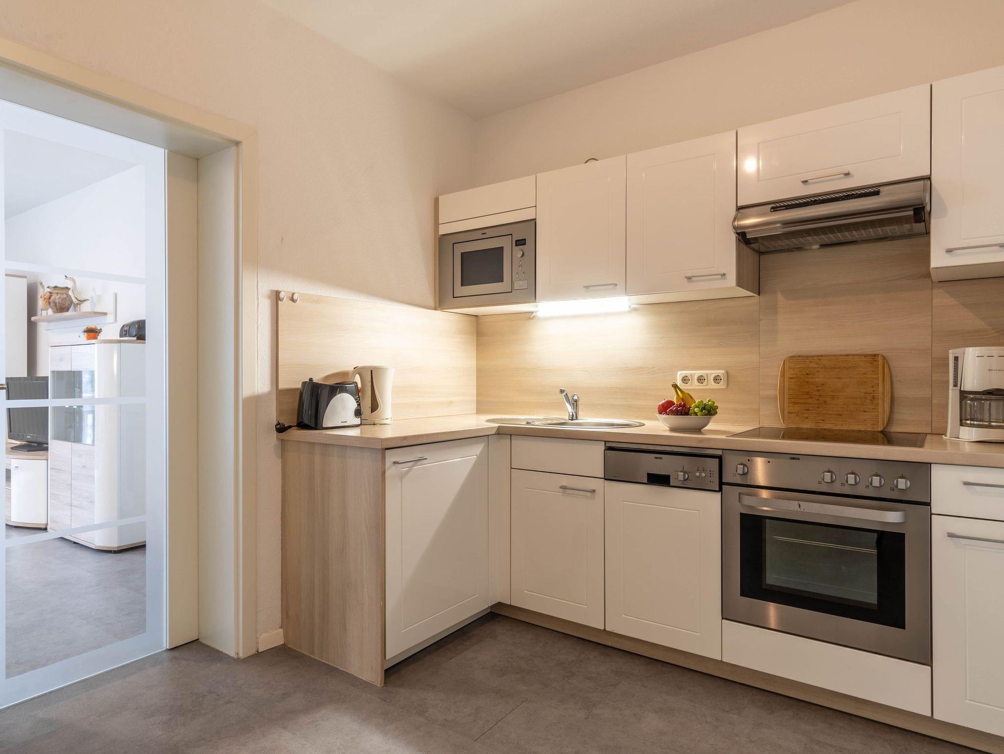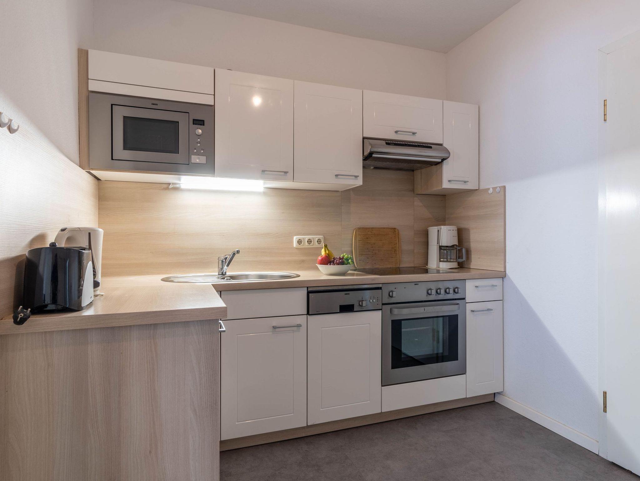 In der Küchenzeile befindet sich ein Ceranherd mit Backofen, eine Dunstabzugshaube, ein Kühlschrank mit Gefrierfach, Geschirrspüler, Elektrogeräte wie Kaffeemaschine, Toaster, Wasserkocher sowie Geschirr, Besteck und Gläser.