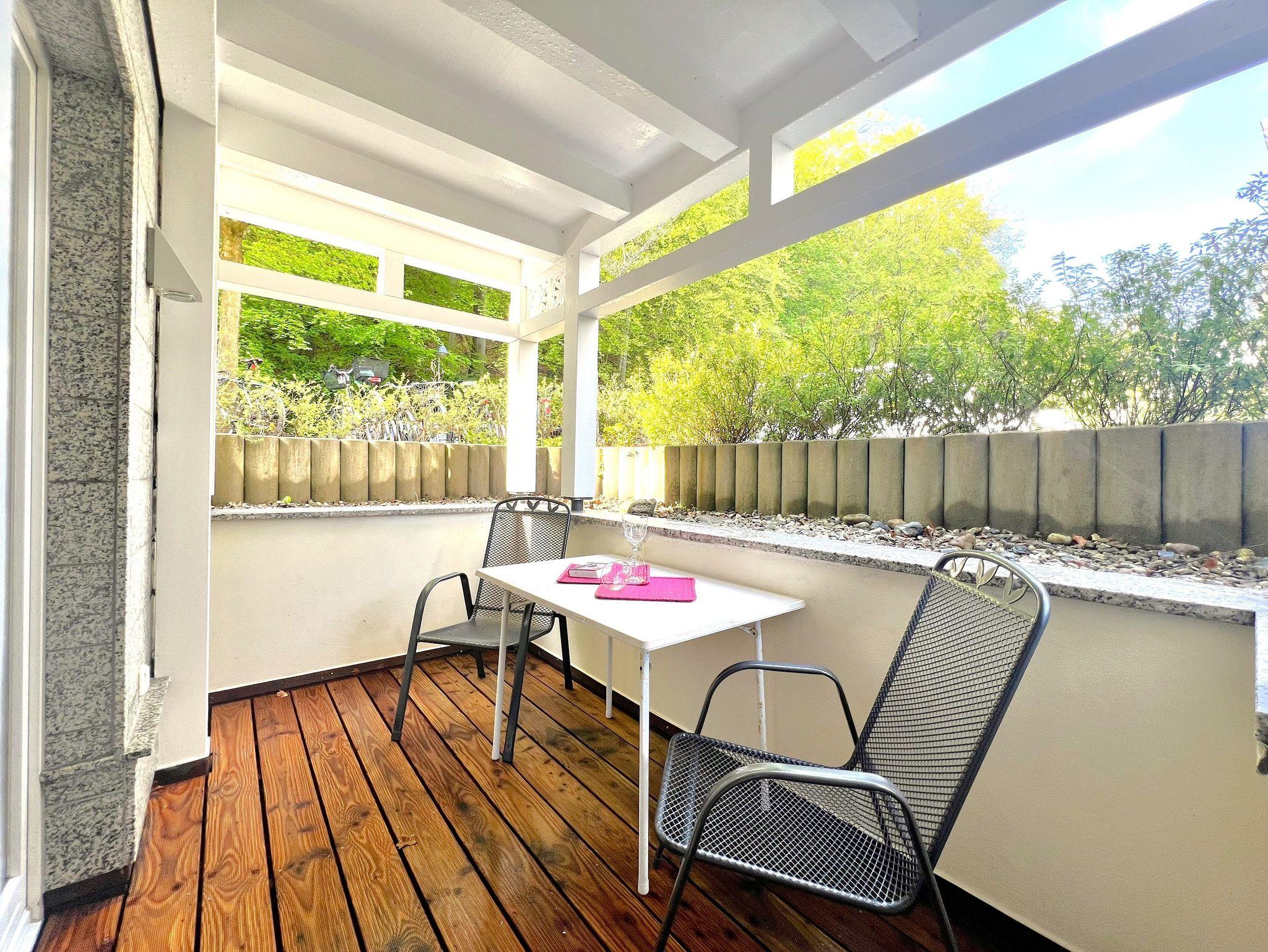 Eine kleine, private Terrasse lädt zum Verweilen ein und bietet einen schönen Platz zum Frühstücken oder Entspannen. Zur Wohnung gehört ein eigener Parkplatz.