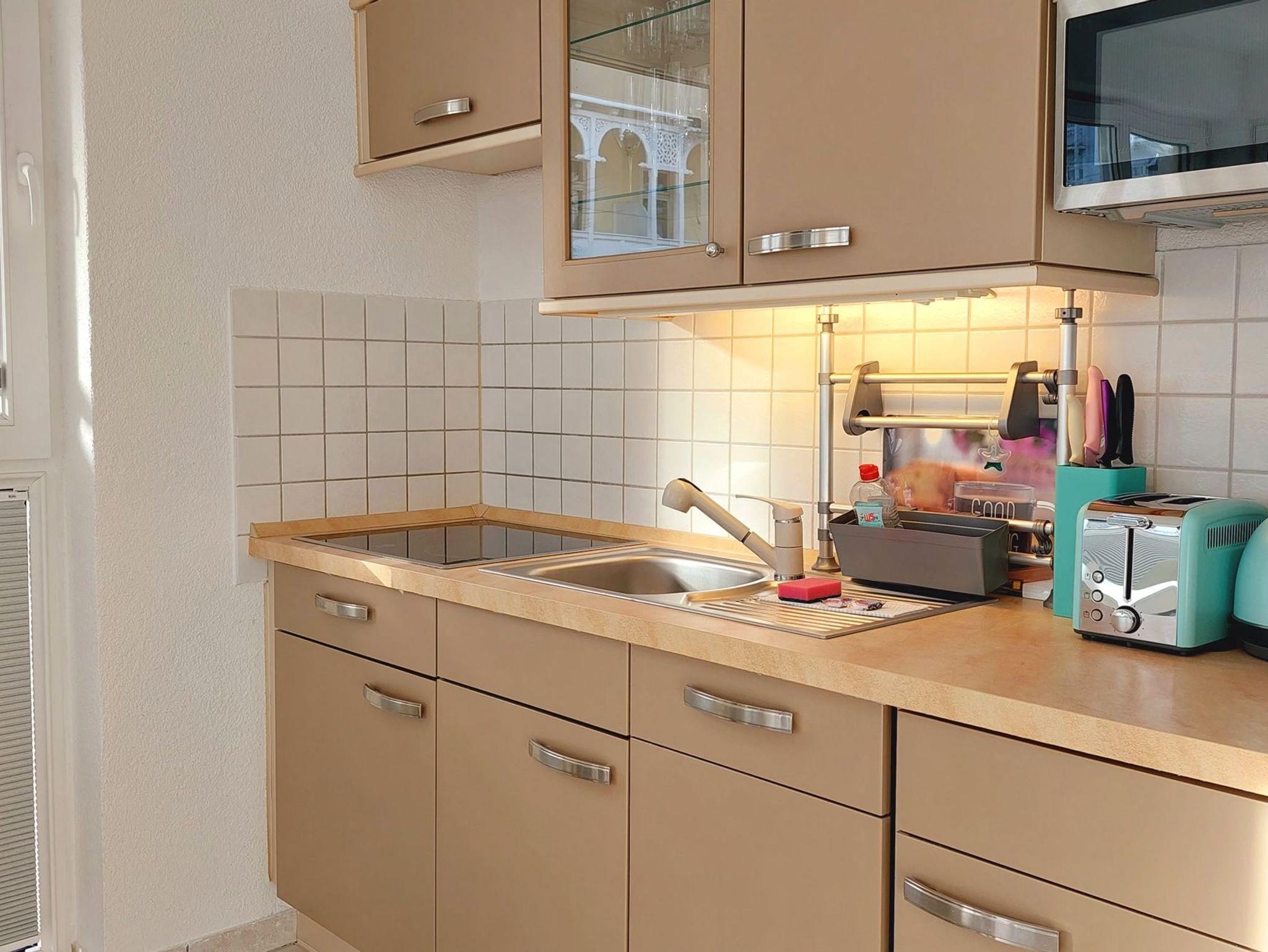 Für eine stressfreie Selbstversorgung steht eine moderne Küchenzeile mit Cerankochfeld, Mikrowelle, Geschirrspüler und eine Kaffeepadmaschine zur Verfügung.