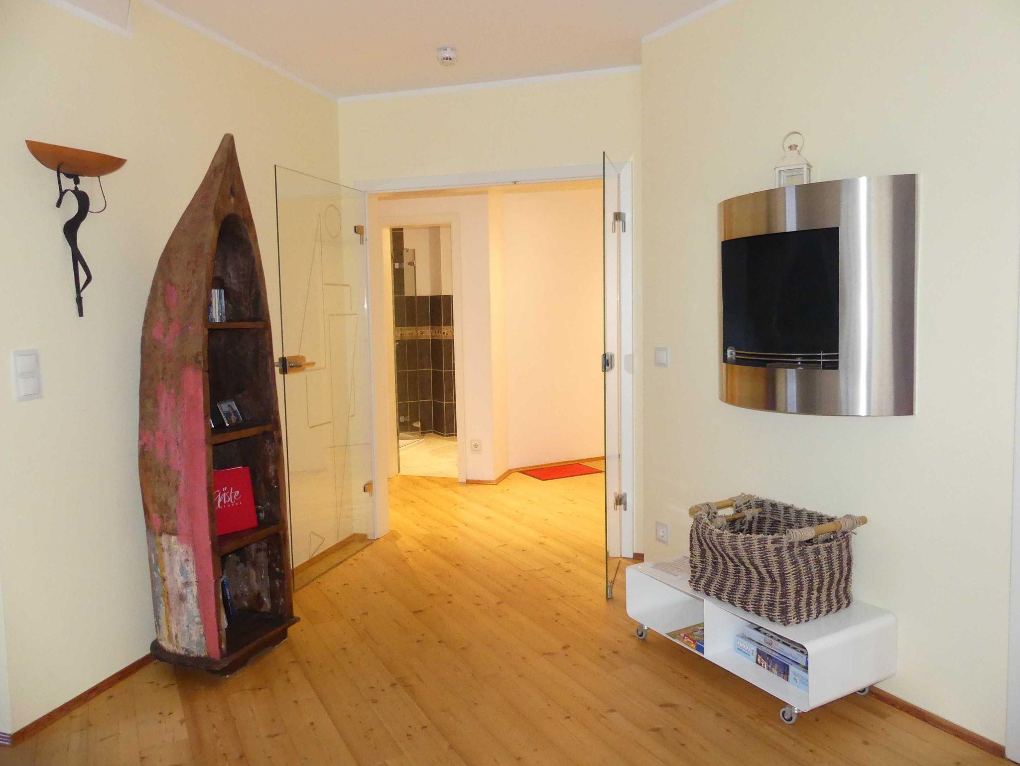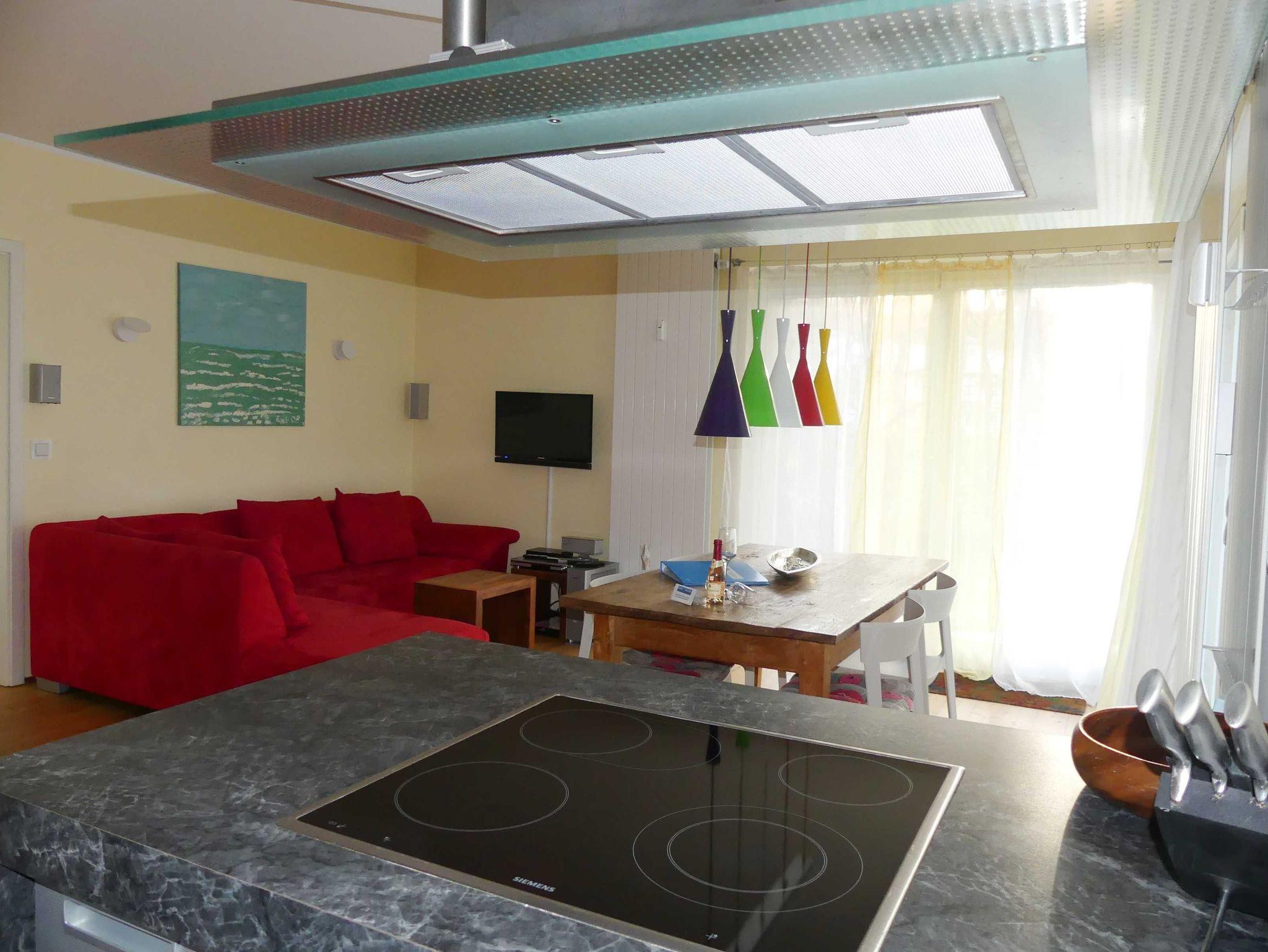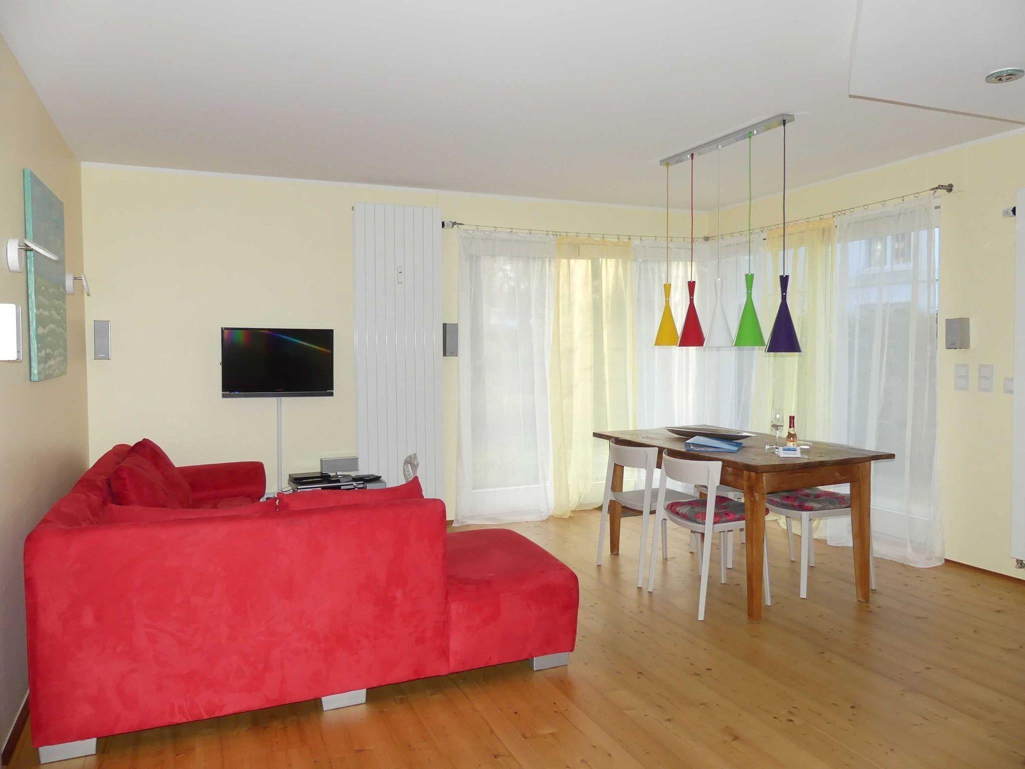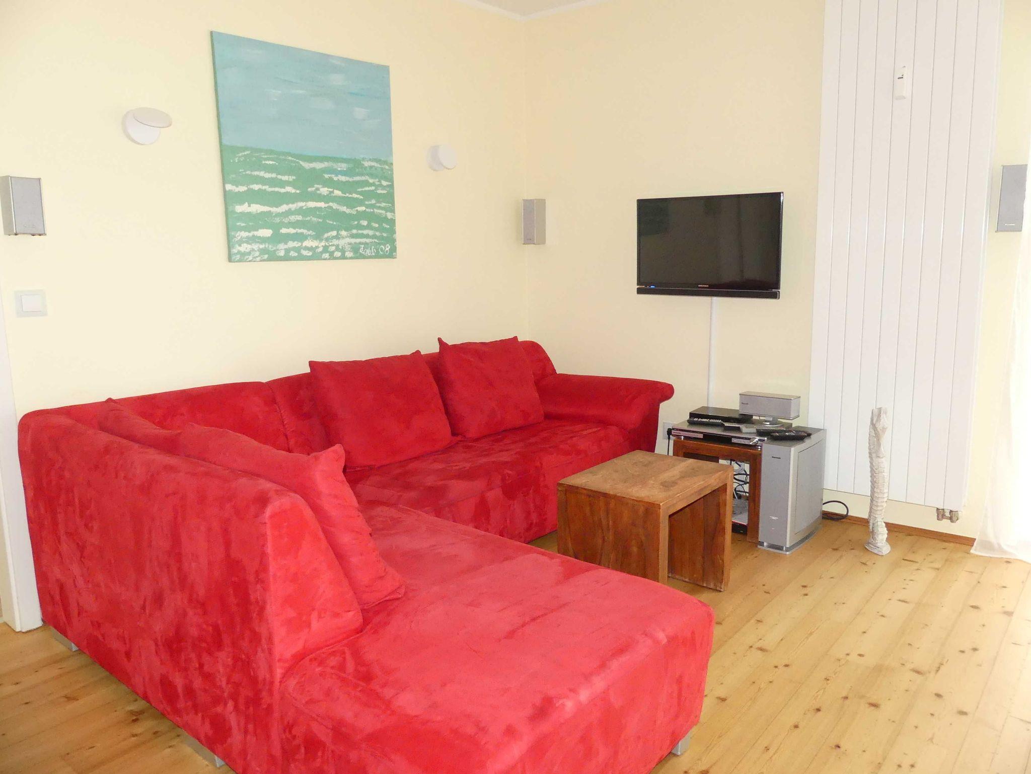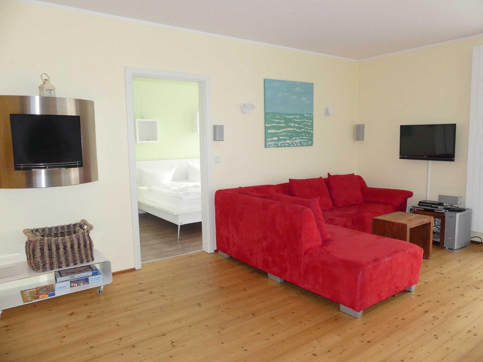 Wohnzimmer: Couchgarnitur (Schlafgelegenheit für max.1 Pers./Kind), Kabel-TV, DVD, Radio mit CD, Edelstahl-Wandkamin (betrieben mit Bio-Ethanol)