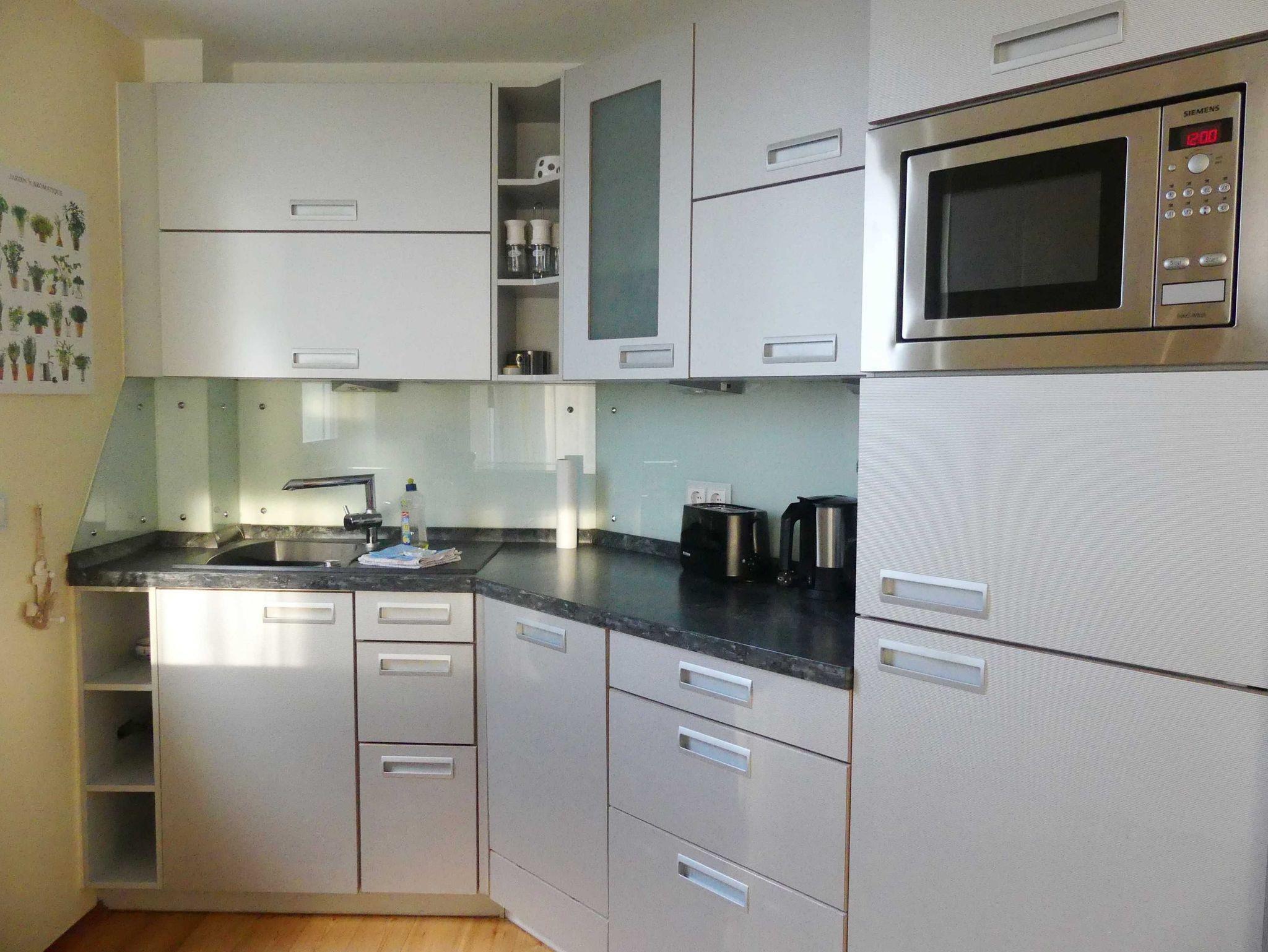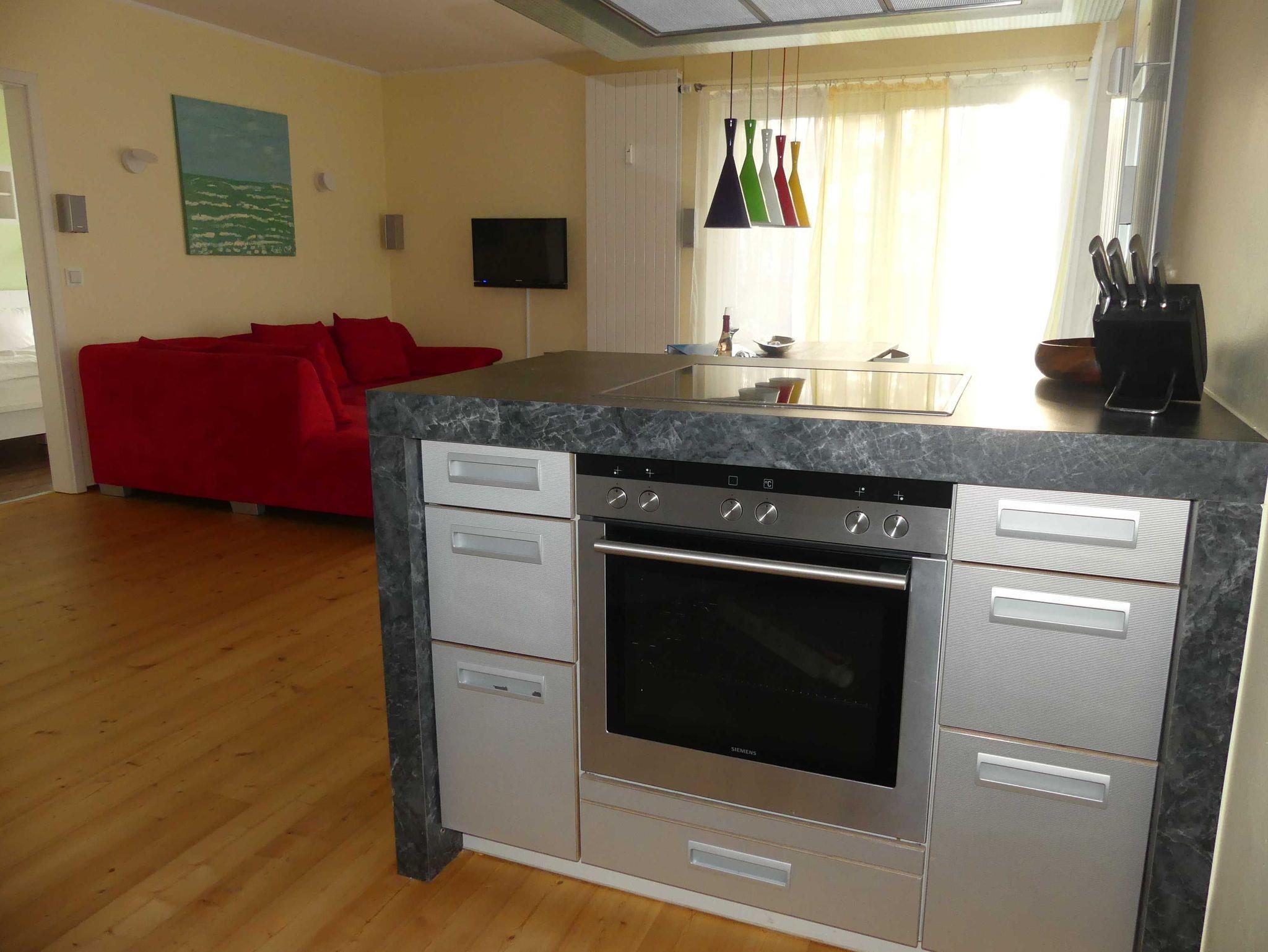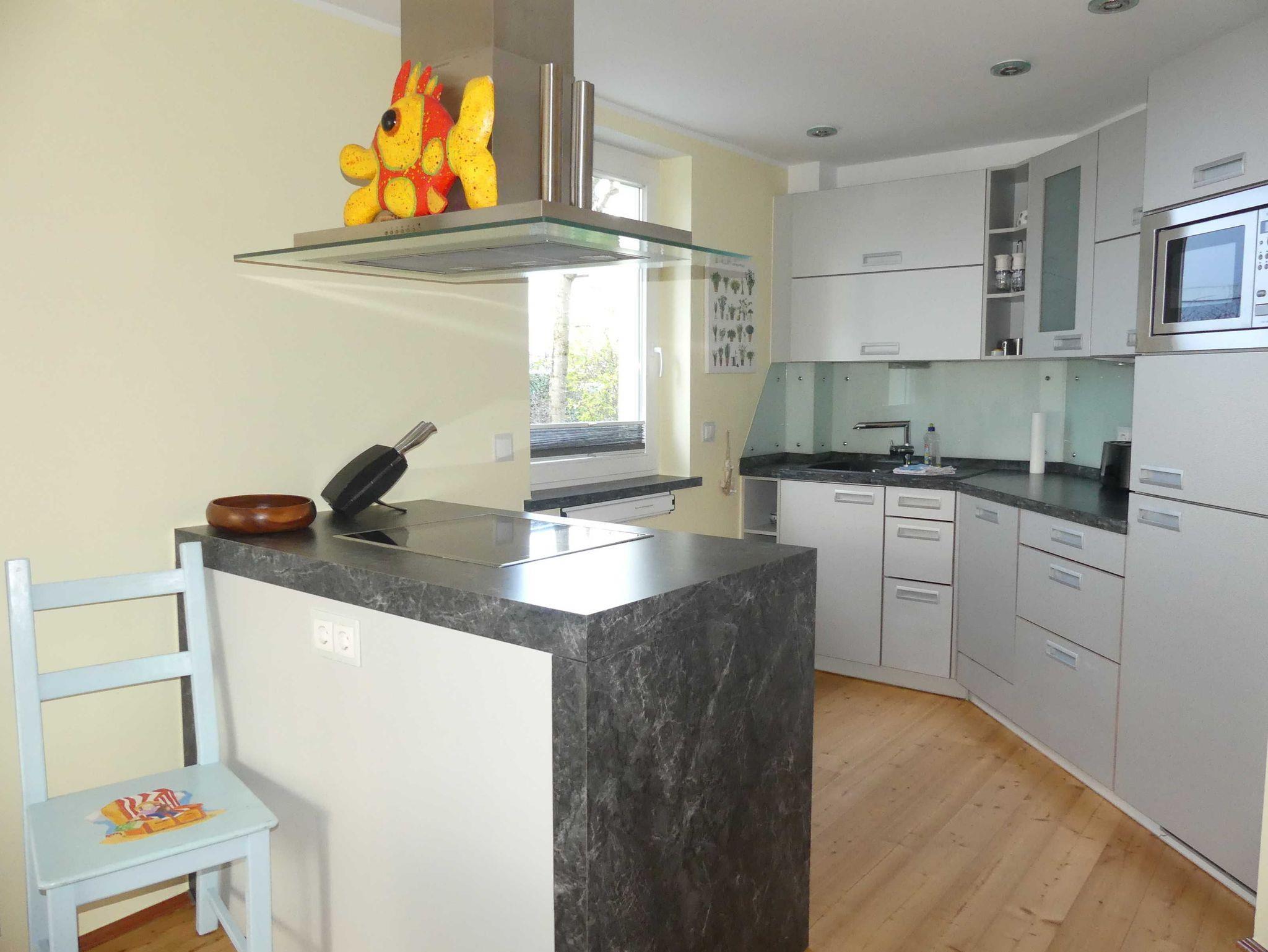 Küche: Moderne Küchenzeile mit Spülmaschine, E-Herd mit Backofen, Wasserkocher, Kaffeemaschine, Toaster, Mikrowelle, Essplatz