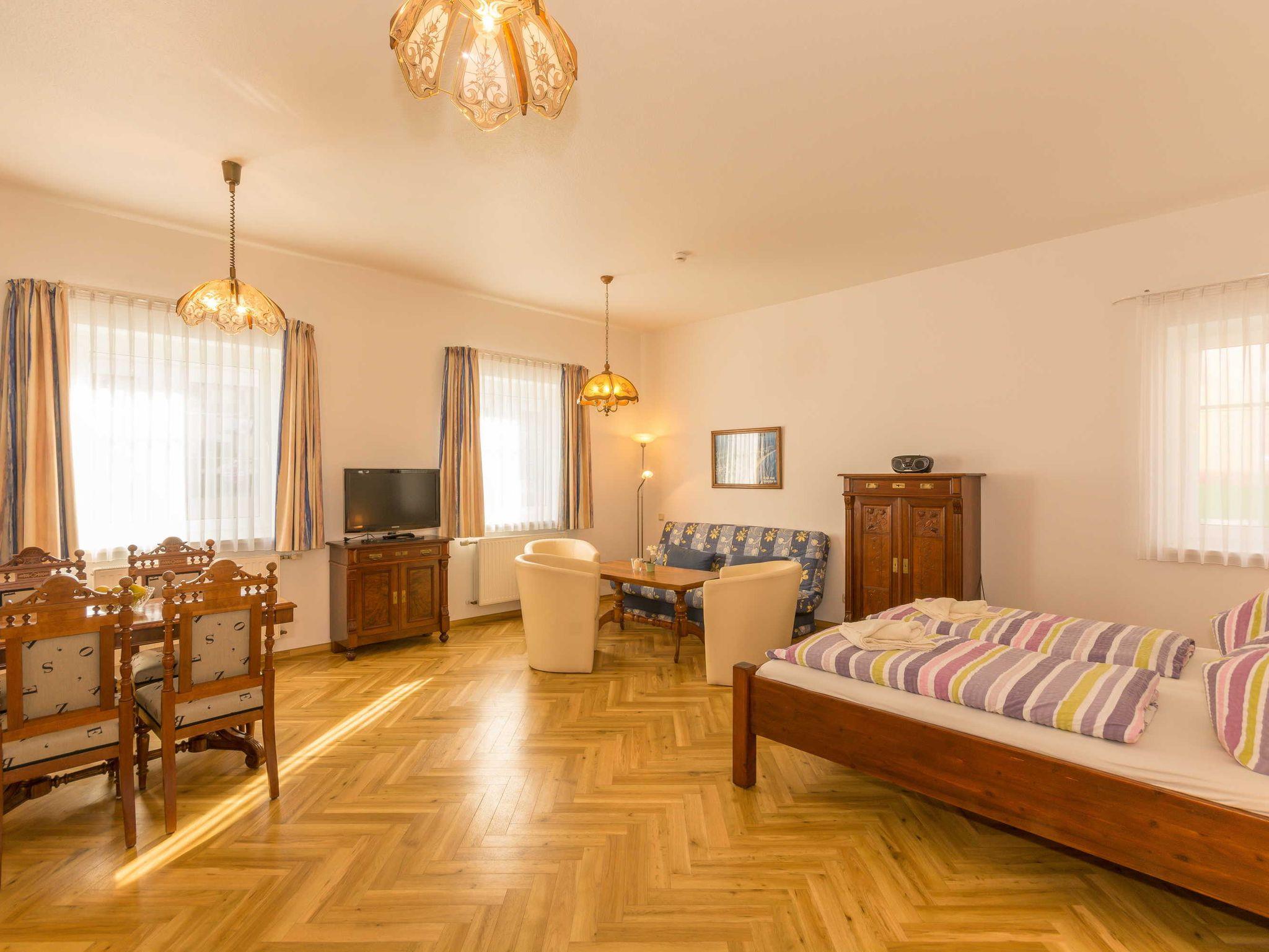 1-Zimmer Ferienwohnung: Kombiniertes Wohn- und Schlafappartement (2-4 Personen) mit Doppelbett und großer Sitzecke: Doppelbettcouch als Aufbettungsmöglichkeit (kein getrennter Schlafraum); Kuechenecke mit Herd, Kuehlschrank und Geschirr; Bad, Dusche und WC; Kabel-TV; ca. 50 qm;