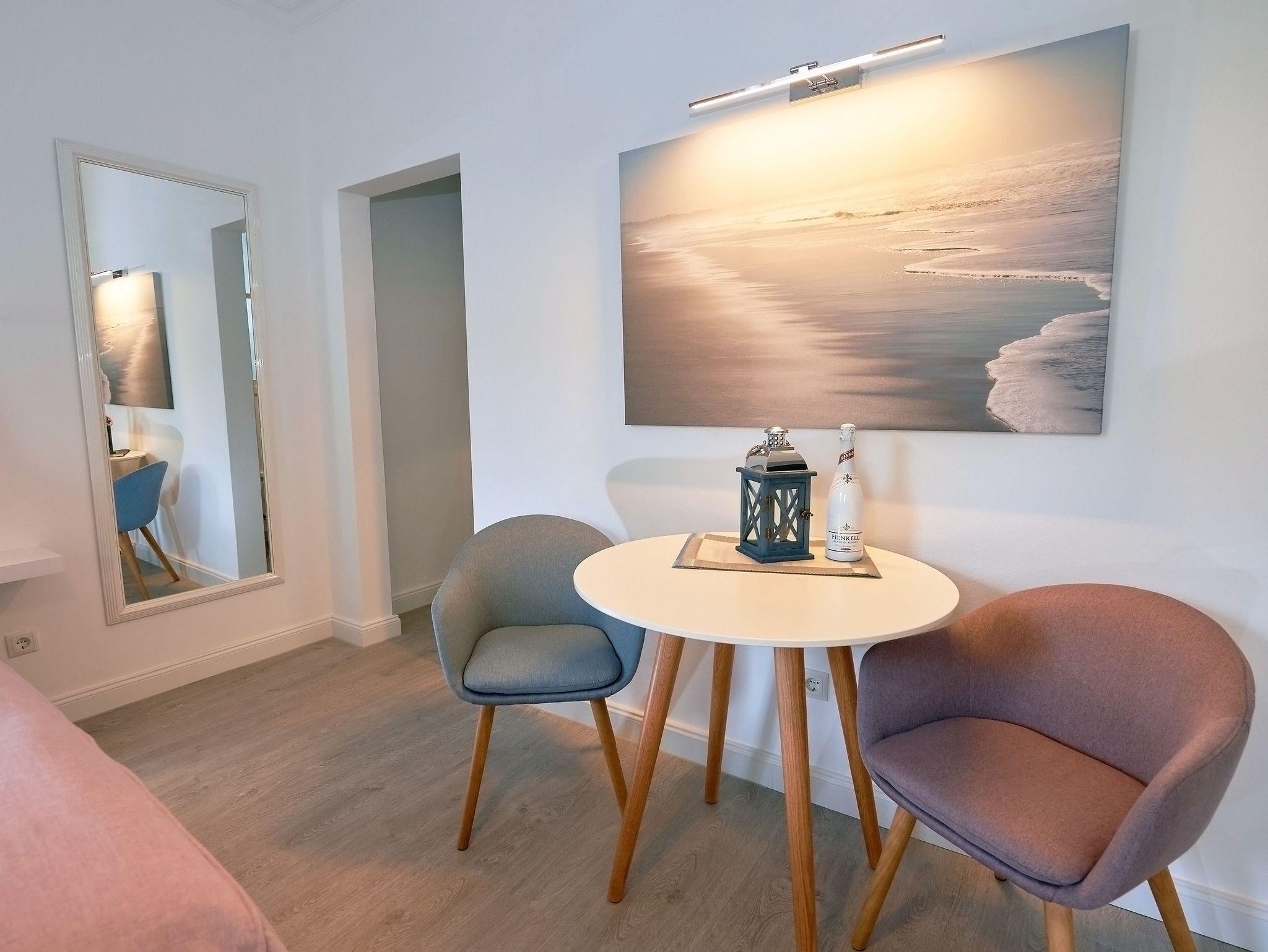 Klein, aber fein! Die Ferienwohnung „Strandzwerg“ präsentiert sich als ein überaus zauberhaftes 1-Raum-Appartement mit ca. 30 qm Wohnfläche und separatem Eingang an der Seite der Villa Saxonia. Die kleine der Wohnung vorgelagerte Terrasse mit Nachmittagssonne lädt dazu ein, das bunte Treiben der Strandgänger und Einkaufsbummler zu beobachten.