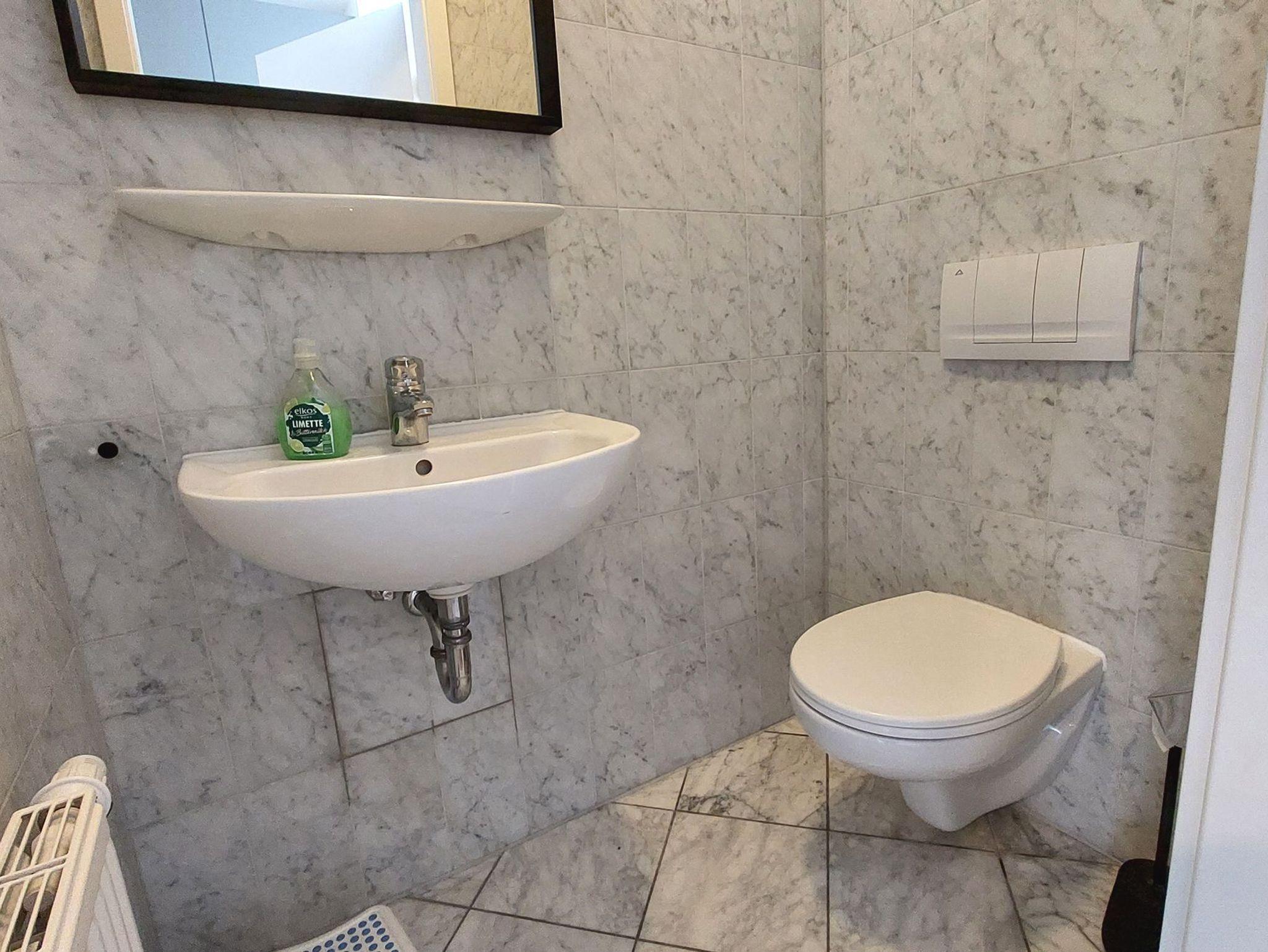 Ein Münzwaschmaschine im Gemeinschaftskeller kann genutzt werden.