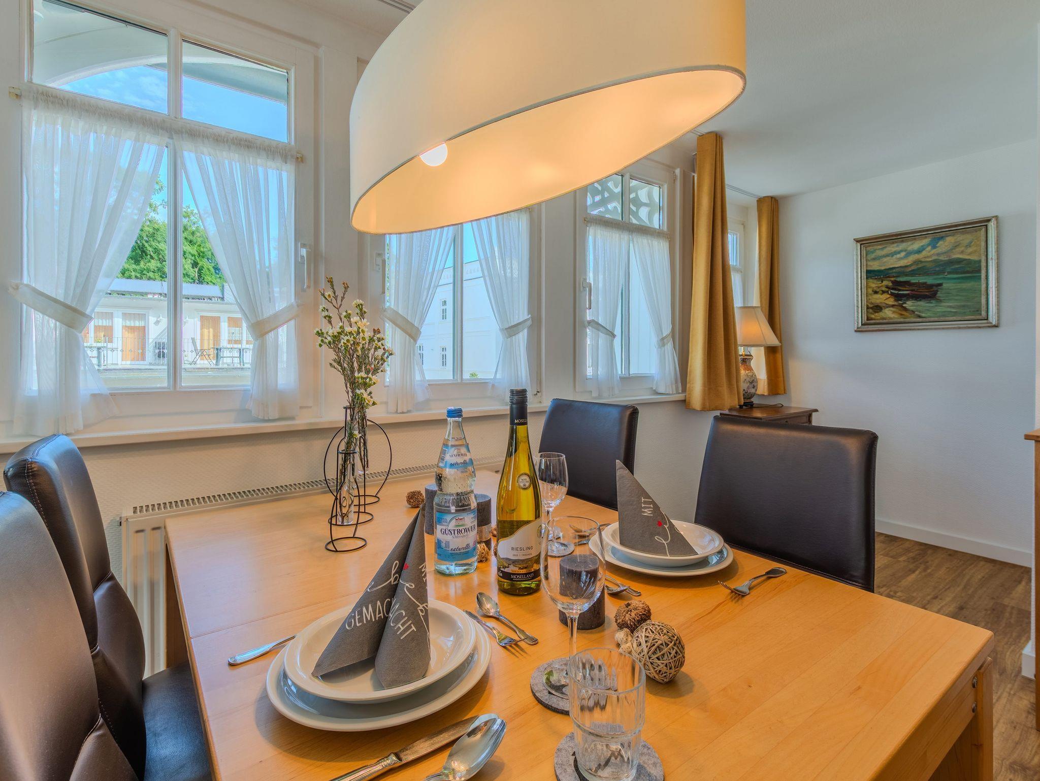 Die Ferienwohnung empfängt Sie mit einem hellen, großzügigen Wohnbereich, der durch zahlreiche Fenster viel Tageslicht hereinlässt und einen schönen Blick auf die umliegenden Villen der Straße bietet. Die offene Gestaltung und die freundliche Atmosphäre schaffen vom ersten Moment an ein angenehmes Urlaubsgefühl.