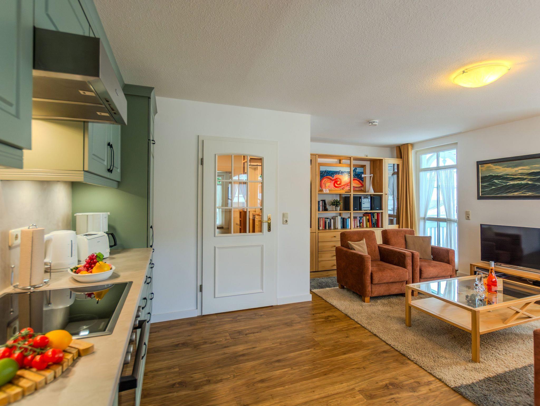 Der Wohnraum bildet das Herz der Wohnung und ist mit einer gemütlichen Couch, TV sowie einem separaten Essplatz ausgestattet. Die offene Küche fügt sich harmonisch in den Raum ein und verfügt als praktische Küchenzeile über eine vollständige Grundausstattung. Ergänzt wird der Wohnbereich durch eine kleine Arbeitsecke mit Schreibtisch, die sich ideal zum Lesen oder für gelegentliches Arbeiten eignet. Das integrierte Schlafsofa lässt sich bei Bedarf mit wenigen Handgriffen in eine zusätzliche Schlafmöglichkeit verwandeln.