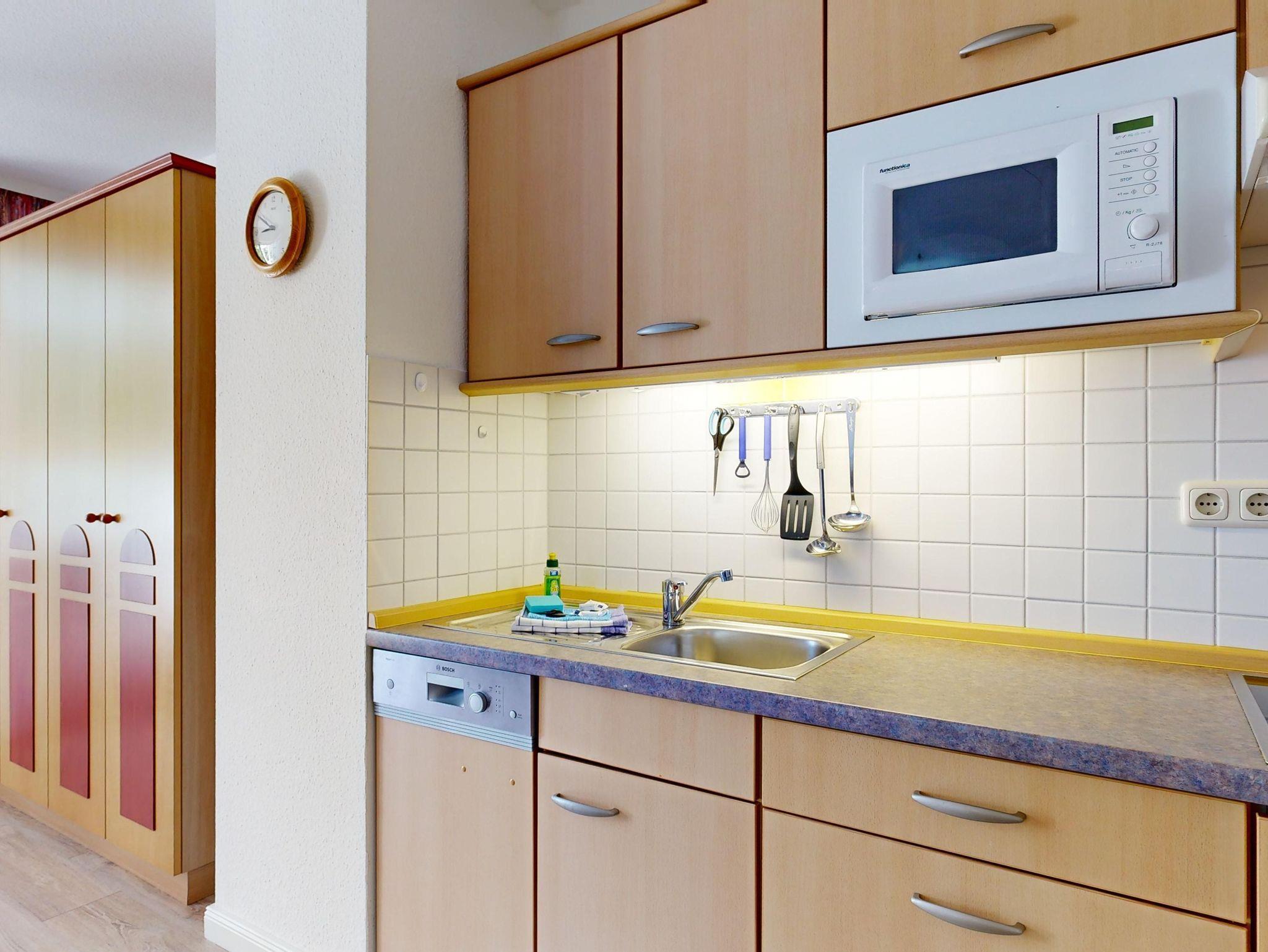 Küchenzeile mit Spülmaschine, Ceranfeld, Mikrowelle, Kaffeemaschine, Toaster und Kühlschrank mit Gefrierfach
