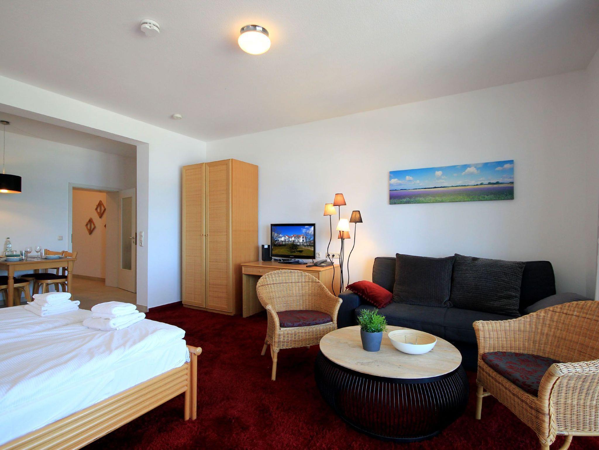 Ihre 1-Zimmer Ferienwohnung 225RB21 befindet sich im 2. Obergeschoss, ist ca. 45 qm groß und für bis zu 4 Personen gut geeignet. Neben dem kombinierten Wohn- und Schlafraum mit Doppelbett sowie Schlafsofa, auf dem die 3. und 4. Person gut schlafen können, gehört ein Essbereich, Flachbild TV sowie WLAN zur Nichtraucherwohnung. Vom überdachten Balkon haben Sie einen wundervollen Meerblick. Ebenfalls können Sie eine voll ausgestattete integrierte Küchenzeile mit Geschirrspüler, Nespresso-Maschine, Backofen, Mikrowelle, Wasserkocher, Toaster und Kaffeemaschine nutzen. Das Badezimmer erwartet Sie mit Waschtisch, WC und Dusche. Haustiere sind herzlich willkommen. Ein PKW-Stellplatz für Ihren PKW ist direkt am Haus vorhanden.