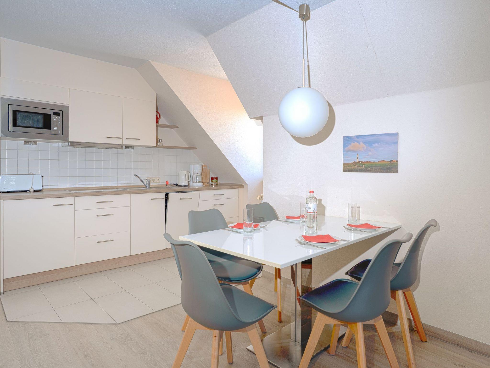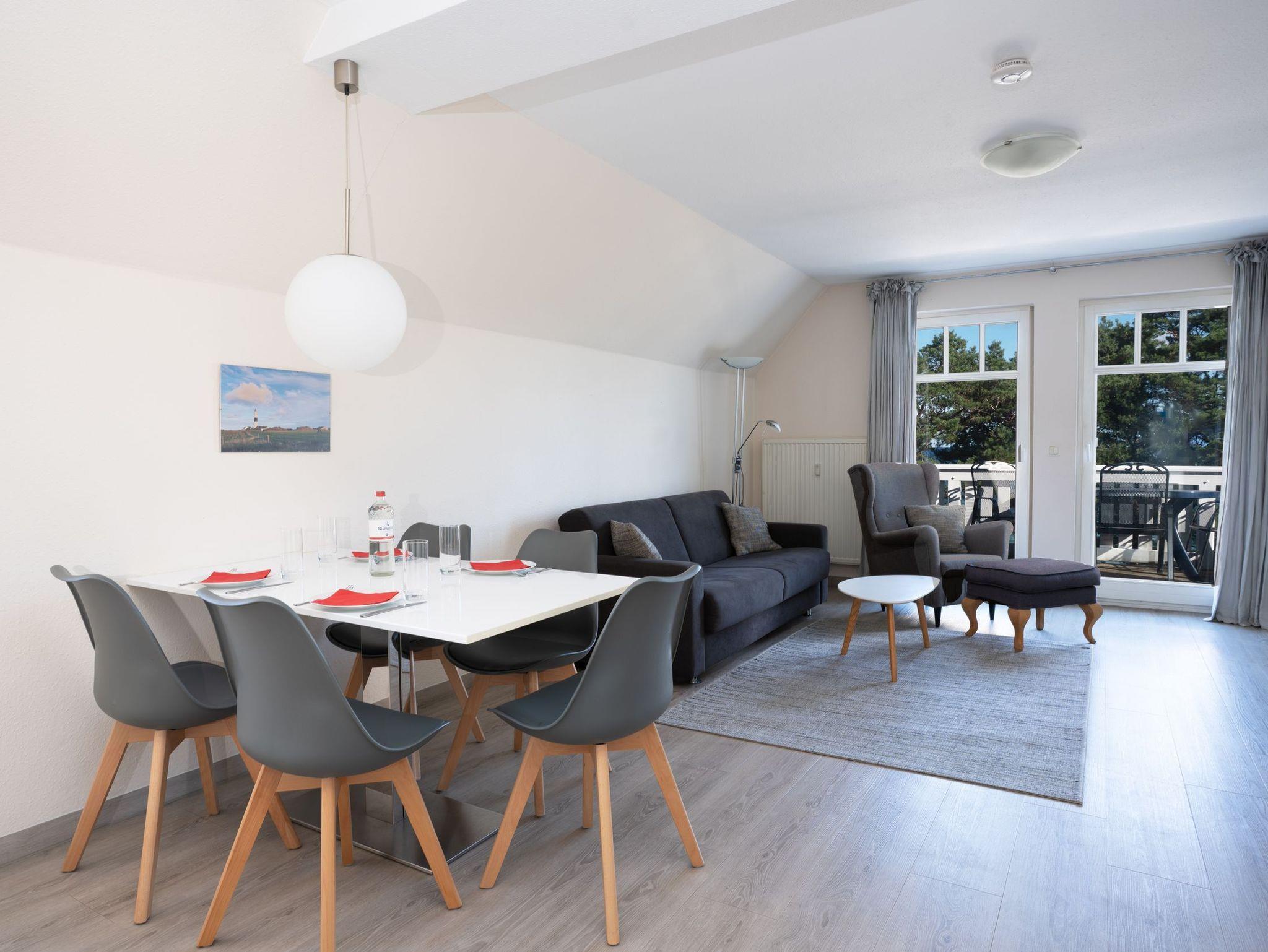 Unsere Ferienwohnung 16 besteht aus einem Wohn-/ Essraum, einem Schlafzimmer sowie einem Bad. An dem Wohnbereich schließt sich der möblierte Balkon mit Meerblick an. Sie bietet auf 56 qm Platz für bis zu 5 Personen.