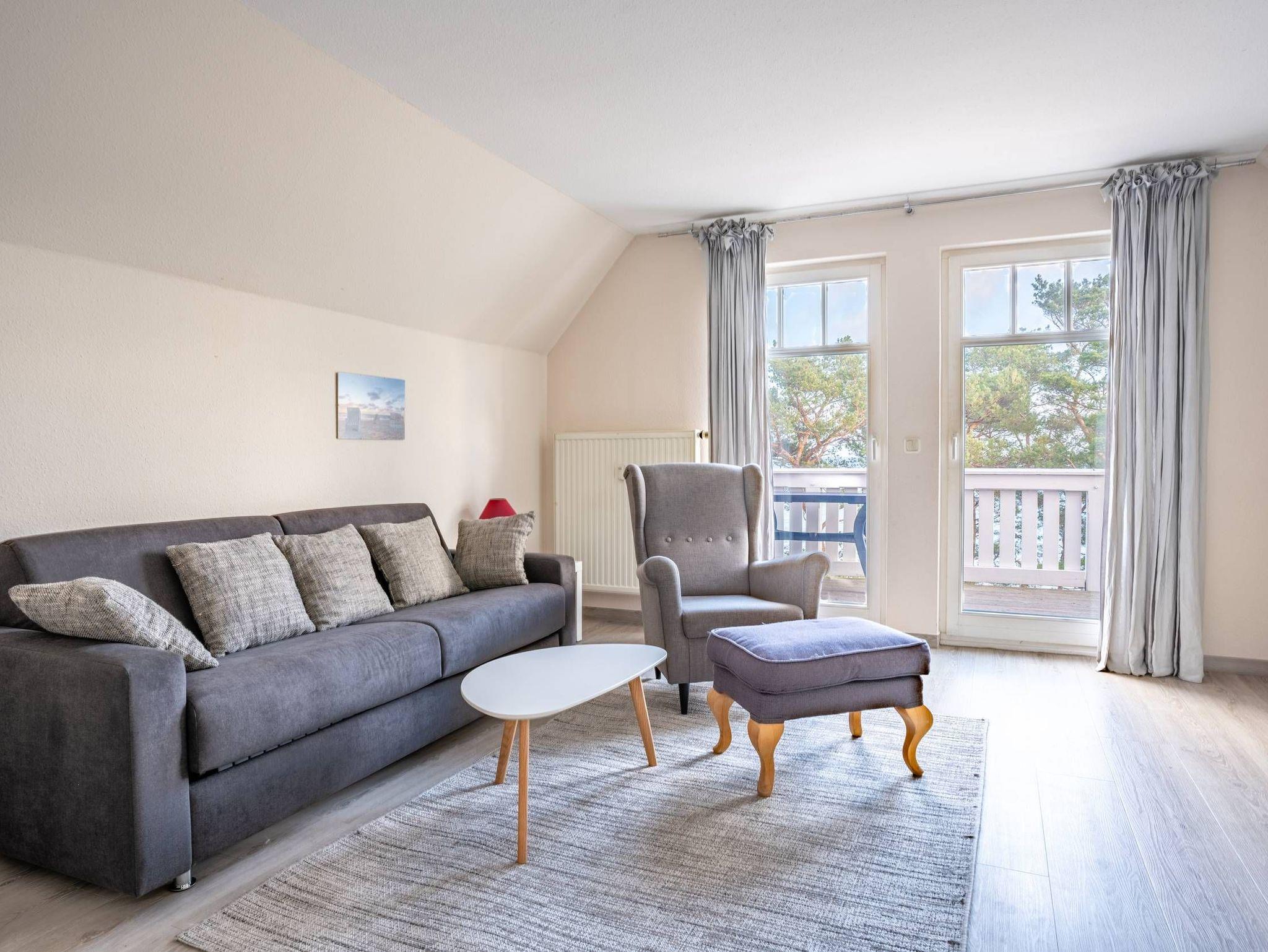Im Wohnbereich ist eine Couch, die schnell zu einer Schlafmöglichkeit für zwei weitere Personen umfunktioniert werden kann, vorhanden. Vom Wohnbereich aus kommen Sie auf den Balkon mit traumhaften Blick auf die Ostsee und die Strandpromenade von Binz